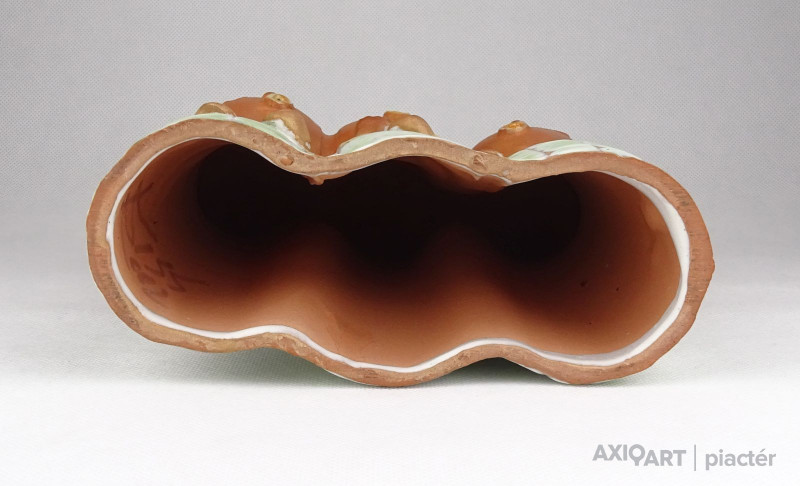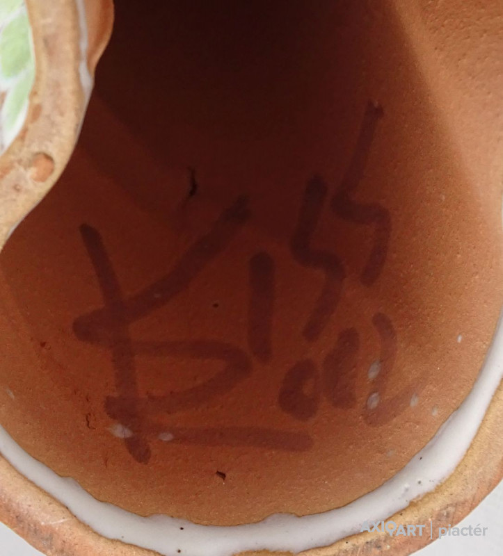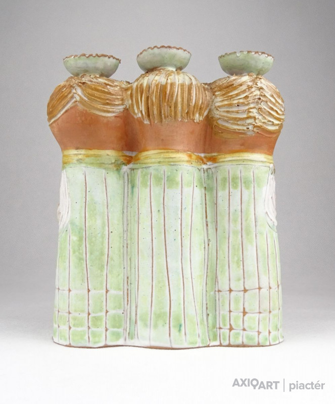 [0U704/BX-9] Hibátlan állapotú, jelzett, háromalakos kerámia figurális mécsestartó figura. Jelzés: KISS ROÓZ Magasság: 19 cm Szélesség: 6 cm Hosszúság: 16 cm Súly: 0.639 kg Kiss Roóz Ilona keramikus Születési hely: Szatmárnémeti [Satu Mare, RO] Születési dátum: 1920 Kiállítások az adatbázisban:  Kiss Roóz Ilona életműkiállítása Mesterei: Orbán Antal, Ohmann Béla. 1939-43: Iparművészeti Iskola, mesterei: Orbán Antal, Ohmann Béla. 1956, 1962: Munkácsy-díj; 1980: érdemes művész; 1984: SZOT-díj; 1994: MSZOSZ díja; 1995: Magyar Köztársasági Érdemrend Középkeresztje. A magyar kerámia Kovács Margit által teremtett naiv-népies irányzatának jeles művelője. Edényeit, kisplasztikáit, ill. murális alkotásait vidám színvilág és kedves humor jellemzi. 1948 és 1952 között tanított az Iparművészeti Főiskolán, azóta szabadfoglalkozású. Egyéni kiállítások 1966 • Csók Galéria, Budapest 1971 • Csók Galéria, Budapest 1980 • Budavári Ipaművészeti Bolt, Budapest 1984 • Petőfi Művelődési Ház, Tiszaluc 1989 • Kispréposti Palota, Eger (állandó kiállítás) 1992 • Bécs 1995 • Minigaléria, Miskolc 1996 • Petőfi Művelődési Ház, Tiszaluc 1997 • Derkovits Művelődési Központ, Tiszaújváros. Válogatott csoportos kiállítások 1947 • Karácsonyi kiállítás, Budapest • Fővárosi Művelődési Központ 1952 • Iparművészeti kiállítás, Ernst Múzeum, Budapest 1956 • Iparművészeti kiállítás, Iparművészeti Múzeum, Budapest 1958 • Magyar kerámia kiállítás, Vallauris 1959 • Magyar képzőművésznők kiállítása, Ernst Múzeum, Budapest 1959 • IV. Országos Iparművészeti Kiállítás, Műcsarnok, Budapest 1963 • Modern magyar kerámia, Royal Festival Hall, London 1965 • Országos Iparművészeti Kiállítás, Műcsarnok, Budapest 1968, 1970 • I., II. Országos Kerámia Biennálé, Pécs 1973 • Magyar kerámia, Ankara, Isztambul 1975 • Tárgy és alkotója, Iparművészeti Múzeum, Budapest 1982 • Magyar kézműves kerámia, Siklós 1995 • XX. századi magyar keramikusok, Iparművészeti Múzeum, Budapest • Az agyag mesterei, Vigadó Galéria, Budapest 1998 • Őszi Kerámia Kiállítás, Olaf Palme Ház, Budapest Művek közgyűjteményekben Köztéri művei kerámia dombormű (1958, Pereces, bölcsőde) kerámia napóra (1959, Székesfehérvár, Béke téri iskola) csempeburkolat (1961, Szeged, rendelőintézet) falikép (kerámia, 1962, Sopron, Gyermekszanatórium) kerámia falikép (1966, Békéscsaba, bölcsőde) Irodalom GÁL J.: ~ 77 éves. Beszélgetés a művésszel, Magyar Iparművészet, 1997/4. KESZTHELYI K.-LACZKÓ I.: A magyar kerámiaművészet I., Alkotók, adatok 1945-1998, Budapest, 1999. Vadas József + MAOE Forrás: artportal.hu
