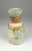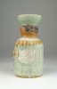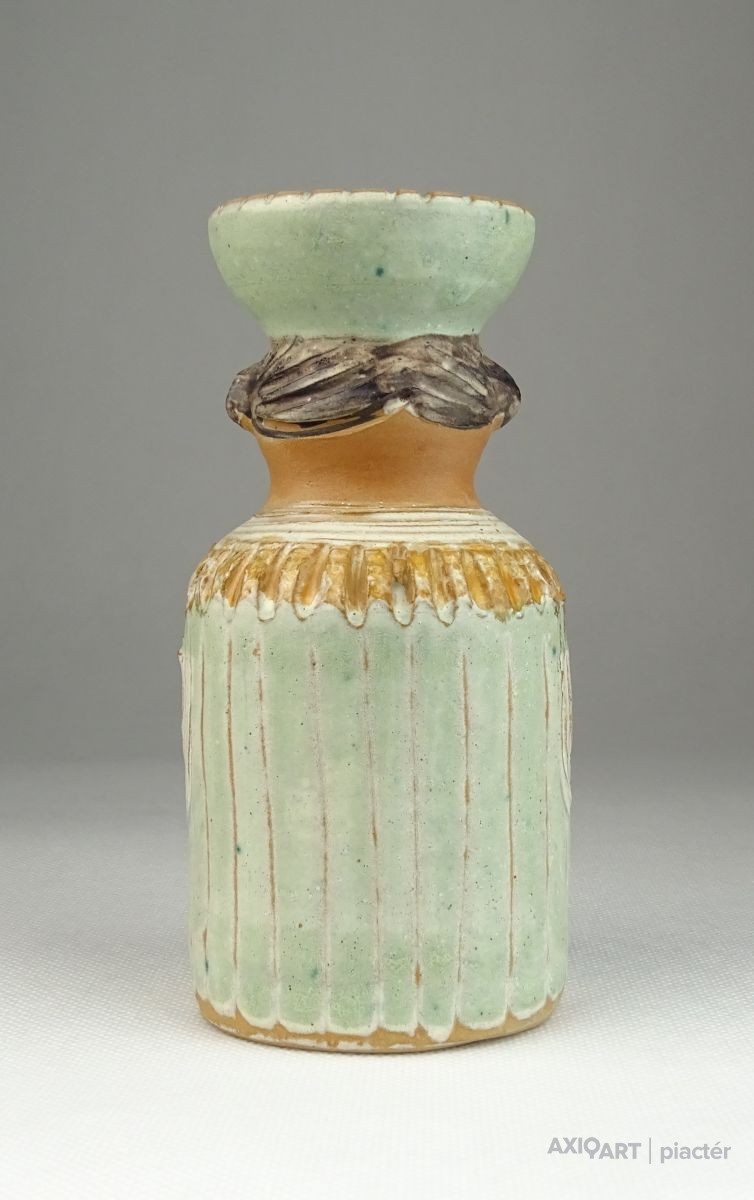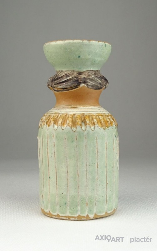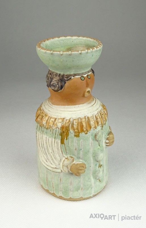 [0S004/X046] Hibátlan állapotú, kisméretű, jelzett kerámia nő figura, díszváza. Jelzés: KISS ROÓZ Magasság: 14.5 cm Szélesség: 7 cm Súly: 0.298 kg Kiss Roóz Ilona keramikus Születési hely: Szatmárnémeti [Satu Mare, RO] Születési dátum: 1920 Kiállítások az adatbázisban:  Kiss Roóz Ilona életműkiállítása Mesterei: Orbán Antal, Ohmann Béla. 1939-43: Iparművészeti Iskola, mesterei: Orbán Antal, Ohmann Béla. 1956, 1962: Munkácsy-díj; 1980: érdemes művész; 1984: SZOT-díj; 1994: MSZOSZ díja; 1995: Magyar Köztársasági Érdemrend Középkeresztje. A magyar kerámia Kovács Margit által teremtett naiv-népies irányzatának jeles művelője. Edényeit, kisplasztikáit, ill. murális alkotásait vidám színvilág és kedves humor jellemzi. 1948 és 1952 között tanított az Iparművészeti Főiskolán, azóta szabadfoglalkozású. Egyéni kiállítások 1966 • Csók Galéria, Budapest 1971 • Csók Galéria, Budapest 1980 • Budavári Ipaművészeti Bolt, Budapest 1984 • Petőfi Művelődési Ház, Tiszaluc 1989 • Kispréposti Palota, Eger (állandó kiállítás) 1992 • Bécs 1995 • Minigaléria, Miskolc 1996 • Petőfi Művelődési Ház, Tiszaluc 1997 • Derkovits Művelődési Központ, Tiszaújváros. Válogatott csoportos kiállítások 1947 • Karácsonyi kiállítás, Budapest • Fővárosi Művelődési Központ 1952 • Iparművészeti kiállítás, Ernst Múzeum, Budapest 1956 • Iparművészeti kiállítás, Iparművészeti Múzeum, Budapest 1958 • Magyar kerámia kiállítás, Vallauris 1959 • Magyar képzőművésznők kiállítása, Ernst Múzeum, Budapest 1959 • IV. Országos Iparművészeti Kiállítás, Műcsarnok, Budapest 1963 • Modern magyar kerámia, Royal Festival Hall, London 1965 • Országos Iparművészeti Kiállítás, Műcsarnok, Budapest 1968, 1970 • I., II. Országos Kerámia Biennálé, Pécs 1973 • Magyar kerámia, Ankara, Isztambul 1975 • Tárgy és alkotója, Iparművészeti Múzeum, Budapest 1982 • Magyar kézműves kerámia, Siklós 1995 • XX. századi magyar keramikusok, Iparművészeti Múzeum, Budapest • Az agyag mesterei, Vigadó Galéria, Budapest 1998 • Őszi Kerámia Kiállítás, Olaf Palme Ház, Budapest Művek közgyűjteményekben Köztéri művei kerámia dombormű (1958, Pereces, bölcsőde) kerámia napóra (1959, Székesfehérvár, Béke téri iskola) csempeburkolat (1961, Szeged, rendelőintézet) falikép (kerámia, 1962, Sopron, Gyermekszanatórium) kerámia falikép (1966, Békéscsaba, bölcsőde) Irodalom GÁL J.: ~ 77 éves. Beszélgetés a művésszel, Magyar Iparművészet, 1997/4. KESZTHELYI K.-LACZKÓ I.: A magyar kerámiaművészet I., Alkotók, adatok 1945-1998, Budapest, 1999. Vadas József + MAOE Forrás: artportal.hu