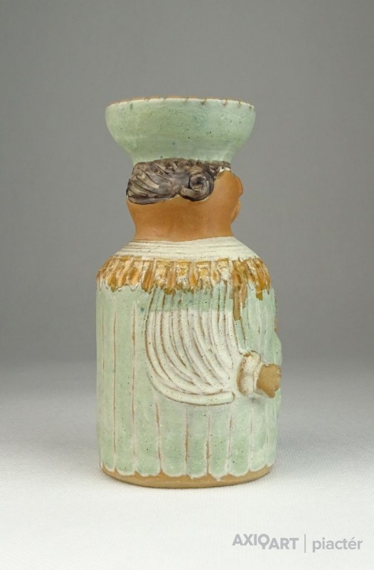 [0L831/BX-9] Hibátlan állapotú, kisméretű, jelzett kerámia kalapos férfi figura. Jelzés: KISS ROÓZ Magasság: 12.5 cm Szélesség: 6 cm Súly: 0.103 kg Kiss Roóz Ilona keramikus Születési hely: Szatmárnémeti [Satu Mare, RO] Születési dátum: 1920 Kiállítások az adatbázisban:  Kiss Roóz Ilona életműkiállítása Mesterei: Orbán Antal, Ohmann Béla. 1939-43: Iparművészeti Iskola, mesterei: Orbán Antal, Ohmann Béla. 1956, 1962: Munkácsy-díj; 1980: érdemes művész; 1984: SZOT-díj; 1994: MSZOSZ díja; 1995: Magyar Köztársasági Érdemrend Középkeresztje. A magyar kerámia Kovács Margit által teremtett naiv-népies irányzatának jeles művelője. Edényeit, kisplasztikáit, ill. murális alkotásait vidám színvilág és kedves humor jellemzi. 1948 és 1952 között tanított az Iparművészeti Főiskolán, azóta szabadfoglalkozású. Egyéni kiállítások 1966 • Csók Galéria, Budapest 1971 • Csók Galéria, Budapest 1980 • Budavári Ipaművészeti Bolt, Budapest 1984 • Petőfi Művelődési Ház, Tiszaluc 1989 • Kispréposti Palota, Eger (állandó kiállítás) 1992 • Bécs 1995 • Minigaléria, Miskolc 1996 • Petőfi Művelődési Ház, Tiszaluc 1997 • Derkovits Művelődési Központ, Tiszaújváros. Válogatott csoportos kiállítások 1947 • Karácsonyi kiállítás, Budapest • Fővárosi Művelődési Központ 1952 • Iparművészeti kiállítás, Ernst Múzeum, Budapest 1956 • Iparművészeti kiállítás, Iparművészeti Múzeum, Budapest 1958 • Magyar kerámia kiállítás, Vallauris 1959 • Magyar képzőművésznők kiállítása, Ernst Múzeum, Budapest 1959 • IV. Országos Iparművészeti Kiállítás, Műcsarnok, Budapest 1963 • Modern magyar kerámia, Royal Festival Hall, London 1965 • Országos Iparművészeti Kiállítás, Műcsarnok, Budapest 1968, 1970 • I., II. Országos Kerámia Biennálé, Pécs 1973 • Magyar kerámia, Ankara, Isztambul 1975 • Tárgy és alkotója, Iparművészeti Múzeum, Budapest 1982 • Magyar kézműves kerámia, Siklós 1995 • XX. századi magyar keramikusok, Iparművészeti Múzeum, Budapest • Az agyag mesterei, Vigadó Galéria, Budapest 1998 • Őszi Kerámia Kiállítás, Olaf Palme Ház, Budapest Művek közgyűjteményekben Köztéri művei kerámia dombormű (1958, Pereces, bölcsőde) kerámia napóra (1959, Székesfehérvár, Béke téri iskola) csempeburkolat (1961, Szeged, rendelőintézet) falikép (kerámia, 1962, Sopron, Gyermekszanatórium) kerámia falikép (1966, Békéscsaba, bölcsőde) Irodalom GÁL J.: ~ 77 éves. Beszélgetés a művésszel, Magyar Iparművészet, 1997/4. KESZTHELYI K.-LACZKÓ I.: A magyar kerámiaművészet I., Alkotók, adatok 1945-1998, Budapest, 1999. Vadas József + MAOE Forrás: artportal.hu