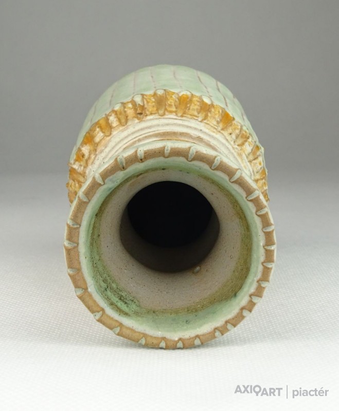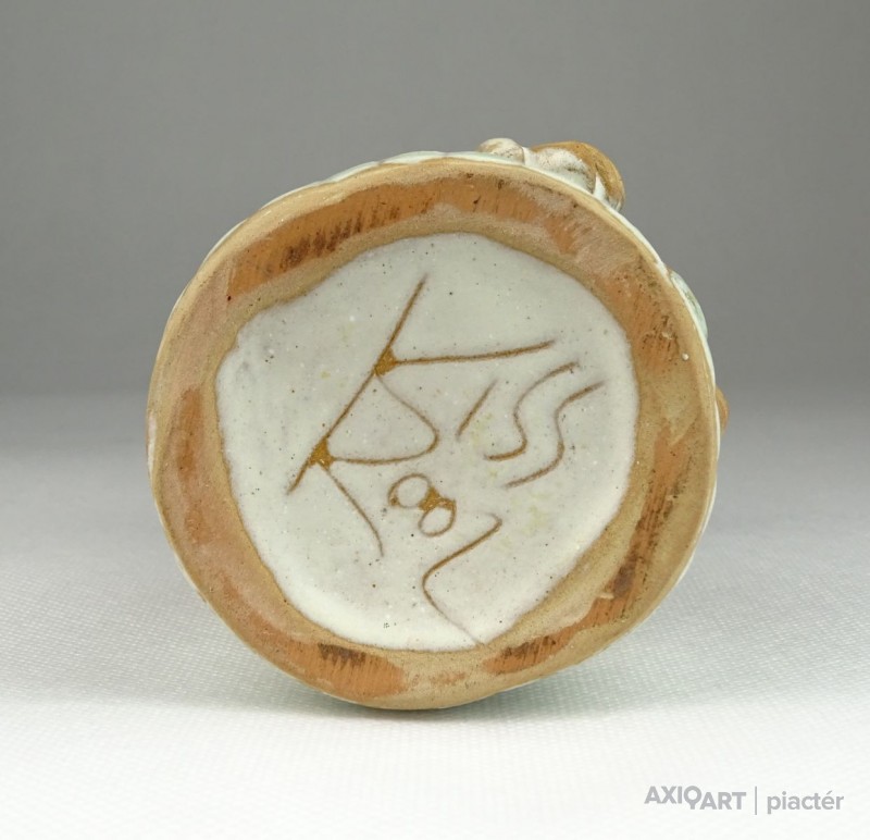 [0U704/BX-9] Hibátlan állapotú, jelzett, háromalakos kerámia figurális mécsestartó figura. Jelzés: KISS ROÓZ Magasság: 19 cm Szélesség: 6 cm Hosszúság: 16 cm Súly: 0.639 kg Kiss Roóz Ilona keramikus Születési hely: Szatmárnémeti [Satu Mare, RO] Születési dátum: 1920 Kiállítások az adatbázisban:  Kiss Roóz Ilona életműkiállítása Mesterei: Orbán Antal, Ohmann Béla. 1939-43: Iparművészeti Iskola, mesterei: Orbán Antal, Ohmann Béla. 1956, 1962: Munkácsy-díj; 1980: érdemes művész; 1984: SZOT-díj; 1994: MSZOSZ díja; 1995: Magyar Köztársasági Érdemrend Középkeresztje. A magyar kerámia Kovács Margit által teremtett naiv-népies irányzatának jeles művelője. Edényeit, kisplasztikáit, ill. murális alkotásait vidám színvilág és kedves humor jellemzi. 1948 és 1952 között tanított az Iparművészeti Főiskolán, azóta szabadfoglalkozású. Egyéni kiállítások 1966 • Csók Galéria, Budapest 1971 • Csók Galéria, Budapest 1980 • Budavári Ipaművészeti Bolt, Budapest 1984 • Petőfi Művelődési Ház, Tiszaluc 1989 • Kispréposti Palota, Eger (állandó kiállítás) 1992 • Bécs 1995 • Minigaléria, Miskolc 1996 • Petőfi Művelődési Ház, Tiszaluc 1997 • Derkovits Művelődési Központ, Tiszaújváros. Válogatott csoportos kiállítások 1947 • Karácsonyi kiállítás, Budapest • Fővárosi Művelődési Központ 1952 • Iparművészeti kiállítás, Ernst Múzeum, Budapest 1956 • Iparművészeti kiállítás, Iparművészeti Múzeum, Budapest 1958 • Magyar kerámia kiállítás, Vallauris 1959 • Magyar képzőművésznők kiállítása, Ernst Múzeum, Budapest 1959 • IV. Országos Iparművészeti Kiállítás, Műcsarnok, Budapest 1963 • Modern magyar kerámia, Royal Festival Hall, London 1965 • Országos Iparművészeti Kiállítás, Műcsarnok, Budapest 1968, 1970 • I., II. Országos Kerámia Biennálé, Pécs 1973 • Magyar kerámia, Ankara, Isztambul 1975 • Tárgy és alkotója, Iparművészeti Múzeum, Budapest 1982 • Magyar kézműves kerámia, Siklós 1995 • XX. századi magyar keramikusok, Iparművészeti Múzeum, Budapest • Az agyag mesterei, Vigadó Galéria, Budapest 1998 • Őszi Kerámia Kiállítás, Olaf Palme Ház, Budapest Művek közgyűjteményekben Köztéri művei kerámia dombormű (1958, Pereces, bölcsőde) kerámia napóra (1959, Székesfehérvár, Béke téri iskola) csempeburkolat (1961, Szeged, rendelőintézet) falikép (kerámia, 1962, Sopron, Gyermekszanatórium) kerámia falikép (1966, Békéscsaba, bölcsőde) Irodalom GÁL J.: ~ 77 éves. Beszélgetés a művésszel, Magyar Iparművészet, 1997/4. KESZTHELYI K.-LACZKÓ I.: A magyar kerámiaművészet I., Alkotók, adatok 1945-1998, Budapest, 1999. Vadas József + MAOE Forrás: artportal.hu