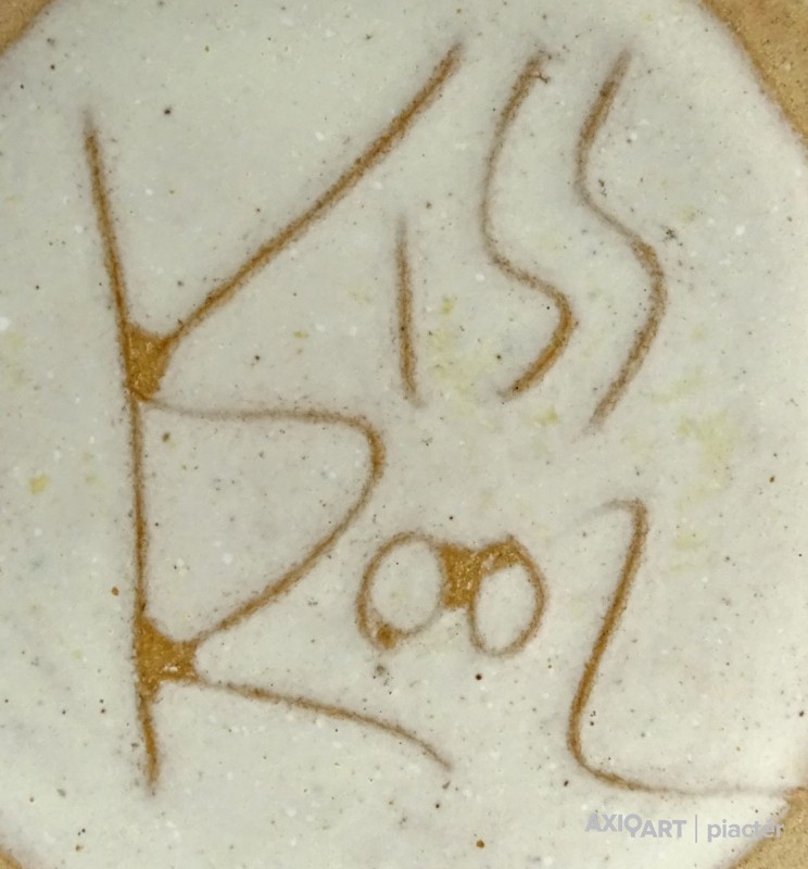 [1D329/BX-9] Hibátlan állapotú, jelzett Kiss Roóz fali kerámia, kisplasztika, falra akasztási lehetőséggel. Hátoldalán jelzés: KISS ROÓZ Mellette zsűricímke rajta felirat: IPARMŰVÉSZETI VÁLLALAT ZSŰRISZÁM: 111005/69 Magasság: 14 cm Szélesség: 14.5 cm Súly: 0.295 kg Kiss Roóz Ilona keramikus Születési hely: Szatmárnémeti [Satu Mare, RO] Születési dátum: 1920 Kiállítások az adatbázisban:  Kiss Roóz Ilona életműkiállítása Mesterei: Orbán Antal, Ohmann Béla. 1939-43: Iparművészeti Iskola, mesterei: Orbán Antal, Ohmann Béla. 1956, 1962: Munkácsy-díj; 1980: érdemes művész; 1984: SZOT-díj; 1994: MSZOSZ díja; 1995: Magyar Köztársasági Érdemrend Középkeresztje. A magyar kerámia Kovács Margit által teremtett naiv-népies irányzatának jeles művelője. Edényeit, kisplasztikáit, ill. murális alkotásait vidám színvilág és kedves humor jellemzi. 1948 és 1952 között tanított az Iparművészeti Főiskolán, azóta szabadfoglalkozású. Egyéni kiállítások 1966 • Csók Galéria, Budapest 1971 • Csók Galéria, Budapest 1980 • Budavári Ipaművészeti Bolt, Budapest 1984 • Petőfi Művelődési Ház, Tiszaluc 1989 • Kispréposti Palota, Eger (állandó kiállítás) 1992 • Bécs 1995 • Minigaléria, Miskolc 1996 • Petőfi Művelődési Ház, Tiszaluc 1997 • Derkovits Művelődési Központ, Tiszaújváros. Válogatott csoportos kiállítások 1947 • Karácsonyi kiállítás, Budapest • Fővárosi Művelődési Központ 1952 • Iparművészeti kiállítás, Ernst Múzeum, Budapest 1956 • Iparművészeti kiállítás, Iparművészeti Múzeum, Budapest 1958 • Magyar kerámia kiállítás, Vallauris 1959 • Magyar képzőművésznők kiállítása, Ernst Múzeum, Budapest 1959 • IV. Országos Iparművészeti Kiállítás, Műcsarnok, Budapest 1963 • Modern magyar kerámia, Royal Festival Hall, London 1965 • Országos Iparművészeti Kiállítás, Műcsarnok, Budapest 1968, 1970 • I., II. Országos Kerámia Biennálé, Pécs 1973 • Magyar kerámia, Ankara, Isztambul 1975 • Tárgy és alkotója, Iparművészeti Múzeum, Budapest 1982 • Magyar kézműves kerámia, Siklós 1995 • XX. századi magyar keramikusok, Iparművészeti Múzeum, Budapest • Az agyag mesterei, Vigadó Galéria, Budapest 1998 • Őszi Kerámia Kiállítás, Olaf Palme Ház, Budapest Művek közgyűjteményekben Köztéri művei kerámia dombormű (1958, Pereces, bölcsőde) kerámia napóra (1959, Székesfehérvár, Béke téri iskola) csempeburkolat (1961, Szeged, rendelőintézet) falikép (kerámia, 1962, Sopron, Gyermekszanatórium) kerámia falikép (1966, Békéscsaba, bölcsőde) Irodalom GÁL J.: ~ 77 éves. Beszélgetés a művésszel, Magyar Iparművészet, 1997/4. KESZTHELYI K.-LACZKÓ I.: A magyar kerámiaművészet I., Alkotók, adatok 1945-1998, Budapest, 1999. Vadas József + MAOE Forrás: artportal