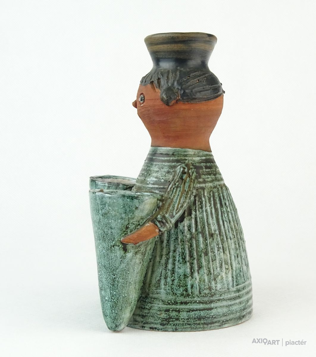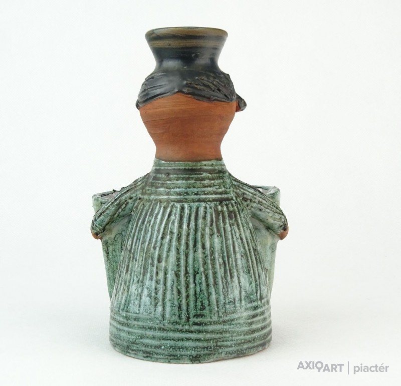 [0S004/X046] Hibátlan állapotú, kisméretű, jelzett kerámia nő figura, díszváza. Jelzés: KISS ROÓZ Magasság: 14.5 cm Szélesség: 7 cm Súly: 0.298 kg Kiss Roóz Ilona keramikus Születési hely: Szatmárnémeti [Satu Mare, RO] Születési dátum: 1920 Kiállítások az adatbázisban:  Kiss Roóz Ilona életműkiállítása Mesterei: Orbán Antal, Ohmann Béla. 1939-43: Iparművészeti Iskola, mesterei: Orbán Antal, Ohmann Béla. 1956, 1962: Munkácsy-díj; 1980: érdemes művész; 1984: SZOT-díj; 1994: MSZOSZ díja; 1995: Magyar Köztársasági Érdemrend Középkeresztje. A magyar kerámia Kovács Margit által teremtett naiv-népies irányzatának jeles művelője. Edényeit, kisplasztikáit, ill. murális alkotásait vidám színvilág és kedves humor jellemzi. 1948 és 1952 között tanított az Iparművészeti Főiskolán, azóta szabadfoglalkozású. Egyéni kiállítások 1966 • Csók Galéria, Budapest 1971 • Csók Galéria, Budapest 1980 • Budavári Ipaművészeti Bolt, Budapest 1984 • Petőfi Művelődési Ház, Tiszaluc 1989 • Kispréposti Palota, Eger (állandó kiállítás) 1992 • Bécs 1995 • Minigaléria, Miskolc 1996 • Petőfi Művelődési Ház, Tiszaluc 1997 • Derkovits Művelődési Központ, Tiszaújváros. Válogatott csoportos kiállítások 1947 • Karácsonyi kiállítás, Budapest • Fővárosi Művelődési Központ 1952 • Iparművészeti kiállítás, Ernst Múzeum, Budapest 1956 • Iparművészeti kiállítás, Iparművészeti Múzeum, Budapest 1958 • Magyar kerámia kiállítás, Vallauris 1959 • Magyar képzőművésznők kiállítása, Ernst Múzeum, Budapest 1959 • IV. Országos Iparművészeti Kiállítás, Műcsarnok, Budapest 1963 • Modern magyar kerámia, Royal Festival Hall, London 1965 • Országos Iparművészeti Kiállítás, Műcsarnok, Budapest 1968, 1970 • I., II. Országos Kerámia Biennálé, Pécs 1973 • Magyar kerámia, Ankara, Isztambul 1975 • Tárgy és alkotója, Iparművészeti Múzeum, Budapest 1982 • Magyar kézműves kerámia, Siklós 1995 • XX. századi magyar keramikusok, Iparművészeti Múzeum, Budapest • Az agyag mesterei, Vigadó Galéria, Budapest 1998 • Őszi Kerámia Kiállítás, Olaf Palme Ház, Budapest Művek közgyűjteményekben Köztéri művei kerámia dombormű (1958, Pereces, bölcsőde) kerámia napóra (1959, Székesfehérvár, Béke téri iskola) csempeburkolat (1961, Szeged, rendelőintézet) falikép (kerámia, 1962, Sopron, Gyermekszanatórium) kerámia falikép (1966, Békéscsaba, bölcsőde) Irodalom GÁL J.: ~ 77 éves. Beszélgetés a művésszel, Magyar Iparművészet, 1997/4. KESZTHELYI K.-LACZKÓ I.: A magyar kerámiaművészet I., Alkotók, adatok 1945-1998, Budapest, 1999. Vadas József + MAOE Forrás: artportal.hu