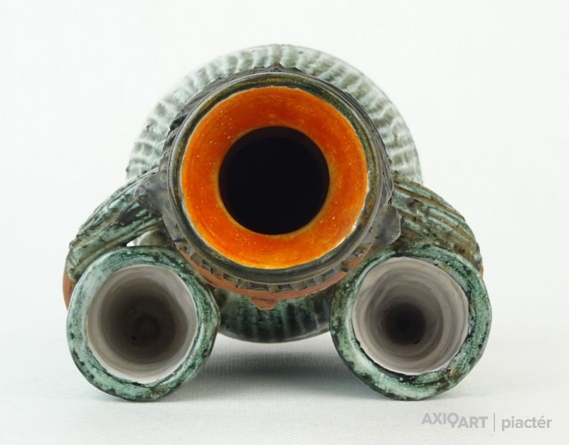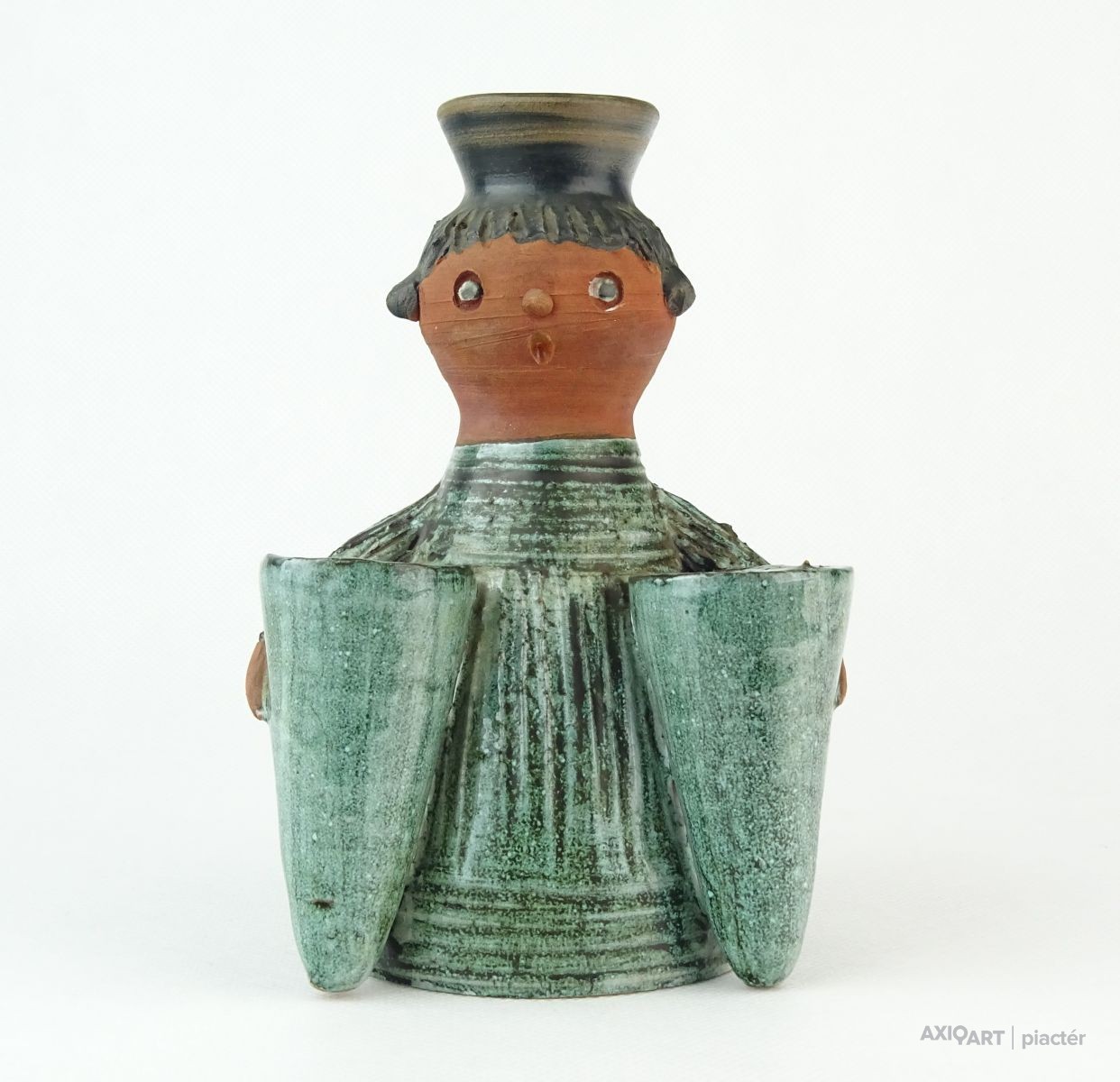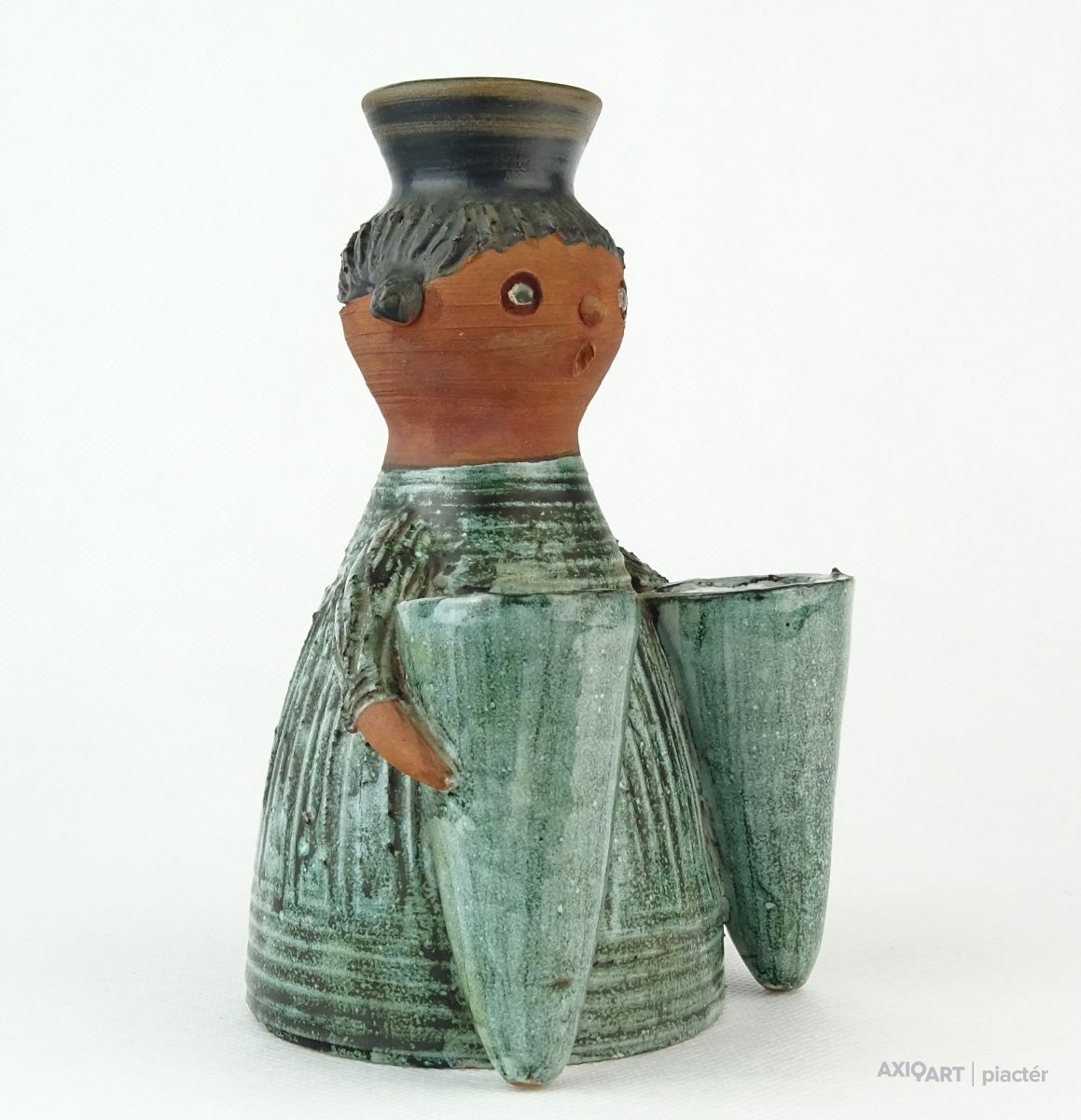 [0U704/BX-9] Hibátlan állapotú, jelzett, háromalakos kerámia figurális mécsestartó figura. Jelzés: KISS ROÓZ Magasság: 19 cm Szélesség: 6 cm Hosszúság: 16 cm Súly: 0.639 kg Kiss Roóz Ilona keramikus Születési hely: Szatmárnémeti [Satu Mare, RO] Születési dátum: 1920 Kiállítások az adatbázisban:  Kiss Roóz Ilona életműkiállítása Mesterei: Orbán Antal, Ohmann Béla. 1939-43: Iparművészeti Iskola, mesterei: Orbán Antal, Ohmann Béla. 1956, 1962: Munkácsy-díj; 1980: érdemes művész; 1984: SZOT-díj; 1994: MSZOSZ díja; 1995: Magyar Köztársasági Érdemrend Középkeresztje. A magyar kerámia Kovács Margit által teremtett naiv-népies irányzatának jeles művelője. Edényeit, kisplasztikáit, ill. murális alkotásait vidám színvilág és kedves humor jellemzi. 1948 és 1952 között tanított az Iparművészeti Főiskolán, azóta szabadfoglalkozású. Egyéni kiállítások 1966 • Csók Galéria, Budapest 1971 • Csók Galéria, Budapest 1980 • Budavári Ipaművészeti Bolt, Budapest 1984 • Petőfi Művelődési Ház, Tiszaluc 1989 • Kispréposti Palota, Eger (állandó kiállítás) 1992 • Bécs 1995 • Minigaléria, Miskolc 1996 • Petőfi Művelődési Ház, Tiszaluc 1997 • Derkovits Művelődési Központ, Tiszaújváros. Válogatott csoportos kiállítások 1947 • Karácsonyi kiállítás, Budapest • Fővárosi Művelődési Központ 1952 • Iparművészeti kiállítás, Ernst Múzeum, Budapest 1956 • Iparművészeti kiállítás, Iparművészeti Múzeum, Budapest 1958 • Magyar kerámia kiállítás, Vallauris 1959 • Magyar képzőművésznők kiállítása, Ernst Múzeum, Budapest 1959 • IV. Országos Iparművészeti Kiállítás, Műcsarnok, Budapest 1963 • Modern magyar kerámia, Royal Festival Hall, London 1965 • Országos Iparművészeti Kiállítás, Műcsarnok, Budapest 1968, 1970 • I., II. Országos Kerámia Biennálé, Pécs 1973 • Magyar kerámia, Ankara, Isztambul 1975 • Tárgy és alkotója, Iparművészeti Múzeum, Budapest 1982 • Magyar kézműves kerámia, Siklós 1995 • XX. századi magyar keramikusok, Iparművészeti Múzeum, Budapest • Az agyag mesterei, Vigadó Galéria, Budapest 1998 • Őszi Kerámia Kiállítás, Olaf Palme Ház, Budapest Művek közgyűjteményekben Köztéri művei kerámia dombormű (1958, Pereces, bölcsőde) kerámia napóra (1959, Székesfehérvár, Béke téri iskola) csempeburkolat (1961, Szeged, rendelőintézet) falikép (kerámia, 1962, Sopron, Gyermekszanatórium) kerámia falikép (1966, Békéscsaba, bölcsőde) Irodalom GÁL J.: ~ 77 éves. Beszélgetés a művésszel, Magyar Iparművészet, 1997/4. KESZTHELYI K.-LACZKÓ I.: A magyar kerámiaművészet I., Alkotók, adatok 1945-1998, Budapest, 1999. Vadas József + MAOE Forrás: artportal.hu