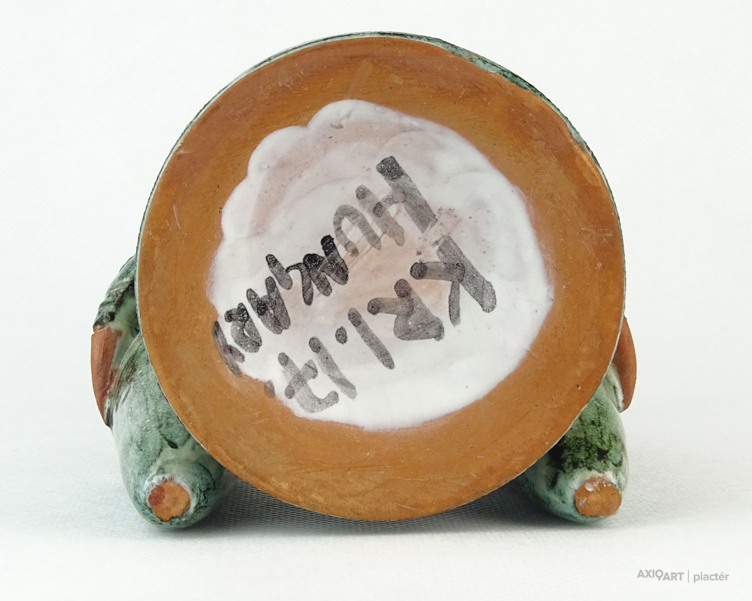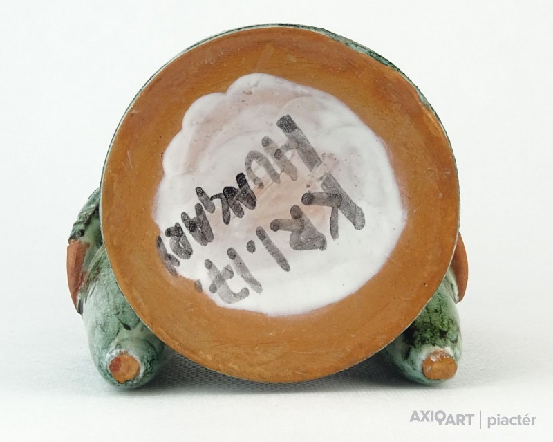 [0P105/X010] Szép állapotú, jelzett gyertyatartó kerámia figura. Jelzés: KRI 17 HUNGARY Magasság: 16.5 cm Szélesség: 11 cm Súly: 0.531 kg Kiss Roóz Ilona keramikus Születési hely: Szatmárnémeti [Satu Mare, RO] Születési dátum: 1920 Kiállítások az adatbázisban:  Kiss Roóz Ilona életműkiállítása Mesterei: Orbán Antal, Ohmann Béla. 1939-43: Iparművészeti Iskola, mesterei: Orbán Antal, Ohmann Béla. 1956, 1962: Munkácsy-díj; 1980: érdemes művész; 1984: SZOT-díj; 1994: MSZOSZ díja; 1995: Magyar Köztársasági Érdemrend Középkeresztje. A magyar kerámia Kovács Margit által teremtett naiv-népies irányzatának jeles művelője. Edényeit, kisplasztikáit, ill. murális alkotásait vidám színvilág és kedves humor jellemzi. 1948 és 1952 között tanított az Iparművészeti Főiskolán, azóta szabadfoglalkozású. Egyéni kiállítások 1966 • Csók Galéria, Budapest 1971 • Csók Galéria, Budapest 1980 • Budavári Ipaművészeti Bolt, Budapest 1984 • Petőfi Művelődési Ház, Tiszaluc 1989 • Kispréposti Palota, Eger (állandó kiállítás) 1992 • Bécs 1995 • Minigaléria, Miskolc 1996 • Petőfi Művelődési Ház, Tiszaluc 1997 • Derkovits Művelődési Központ, Tiszaújváros. Válogatott csoportos kiállítások 1947 • Karácsonyi kiállítás, Budapest • Fővárosi Művelődési Központ 1952 • Iparművészeti kiállítás, Ernst Múzeum, Budapest 1956 • Iparművészeti kiállítás, Iparművészeti Múzeum, Budapest 1958 • Magyar kerámia kiállítás, Vallauris 1959 • Magyar képzőművésznők kiállítása, Ernst Múzeum, Budapest 1959 • IV. Országos Iparművészeti Kiállítás, Műcsarnok, Budapest 1963 • Modern magyar kerámia, Royal Festival Hall, London 1965 • Országos Iparművészeti Kiállítás, Műcsarnok, Budapest 1968, 1970 • I., II. Országos Kerámia Biennálé, Pécs 1973 • Magyar kerámia, Ankara, Isztambul 1975 • Tárgy és alkotója, Iparművészeti Múzeum, Budapest 1982 • Magyar kézműves kerámia, Siklós 1995 • XX. századi magyar keramikusok, Iparművészeti Múzeum, Budapest • Az agyag mesterei, Vigadó Galéria, Budapest 1998 • Őszi Kerámia Kiállítás, Olaf Palme Ház, Budapest Művek közgyűjteményekben Köztéri művei kerámia dombormű (1958, Pereces, bölcsőde) kerámia napóra (1959, Székesfehérvár, Béke téri iskola) csempeburkolat (1961, Szeged, rendelőintézet) falikép (kerámia, 1962, Sopron, Gyermekszanatórium) kerámia falikép (1966, Békéscsaba, bölcsőde) Irodalom GÁL J.: ~ 77 éves. Beszélgetés a művésszel, Magyar Iparművészet, 1997/4. KESZTHELYI K.-LACZKÓ I.: A magyar kerámiaművészet I., Alkotók, adatok 1945-1998, Budapest, 1999. Vadas József + MAOE Forrás: artportal.hu