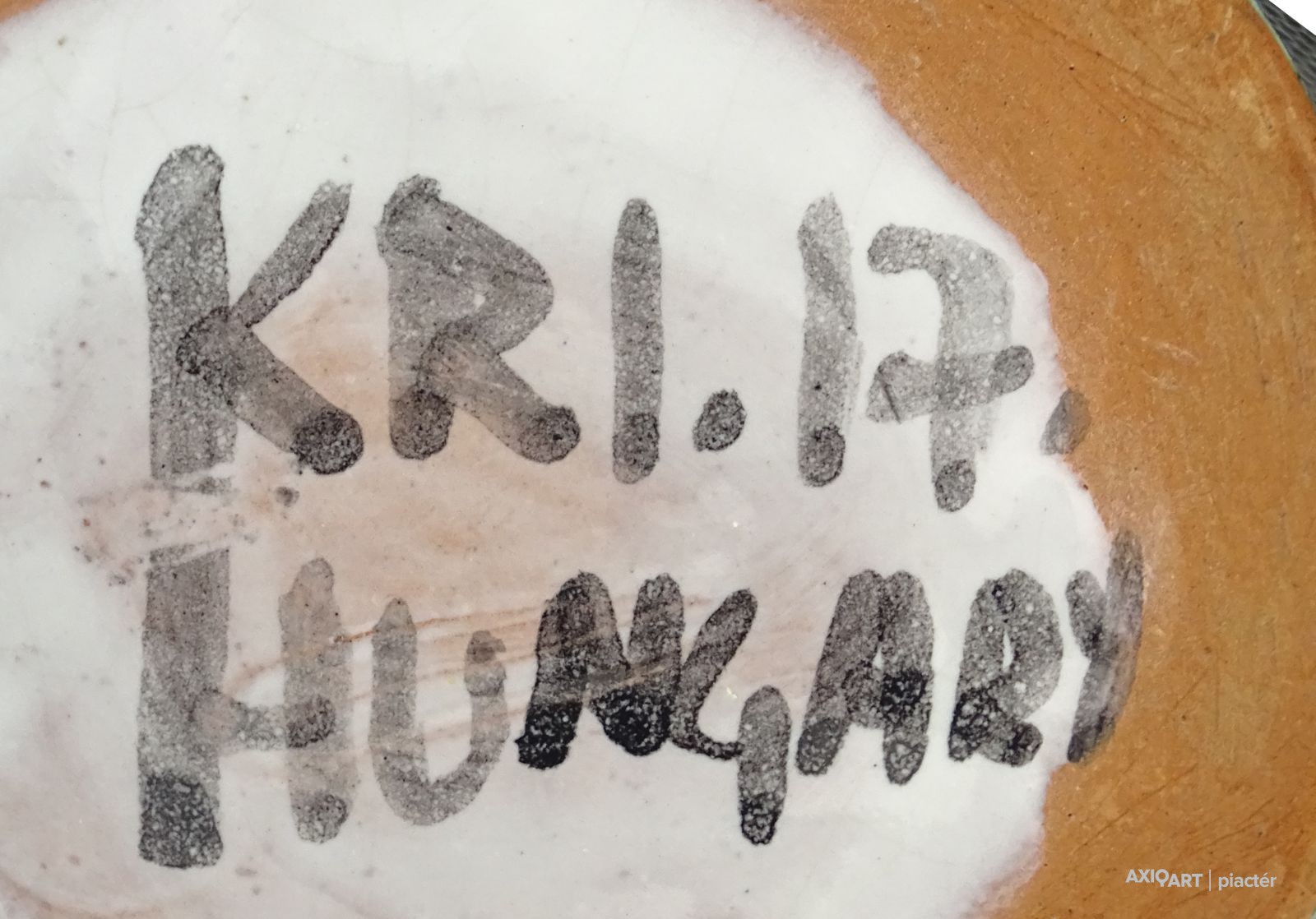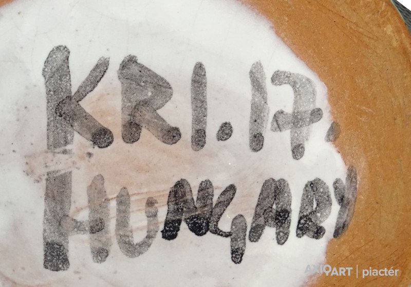 [1D329/BX-9] Hibátlan állapotú, jelzett Kiss Roóz fali kerámia, kisplasztika, falra akasztási lehetőséggel. Hátoldalán jelzés: KISS ROÓZ Mellette zsűricímke rajta felirat: IPARMŰVÉSZETI VÁLLALAT ZSŰRISZÁM: 111005/69 Magasság: 14 cm Szélesség: 14.5 cm Súly: 0.295 kg Kiss Roóz Ilona keramikus Születési hely: Szatmárnémeti [Satu Mare, RO] Születési dátum: 1920 Kiállítások az adatbázisban:  Kiss Roóz Ilona életműkiállítása Mesterei: Orbán Antal, Ohmann Béla. 1939-43: Iparművészeti Iskola, mesterei: Orbán Antal, Ohmann Béla. 1956, 1962: Munkácsy-díj; 1980: érdemes művész; 1984: SZOT-díj; 1994: MSZOSZ díja; 1995: Magyar Köztársasági Érdemrend Középkeresztje. A magyar kerámia Kovács Margit által teremtett naiv-népies irányzatának jeles művelője. Edényeit, kisplasztikáit, ill. murális alkotásait vidám színvilág és kedves humor jellemzi. 1948 és 1952 között tanított az Iparművészeti Főiskolán, azóta szabadfoglalkozású. Egyéni kiállítások 1966 • Csók Galéria, Budapest 1971 • Csók Galéria, Budapest 1980 • Budavári Ipaművészeti Bolt, Budapest 1984 • Petőfi Művelődési Ház, Tiszaluc 1989 • Kispréposti Palota, Eger (állandó kiállítás) 1992 • Bécs 1995 • Minigaléria, Miskolc 1996 • Petőfi Művelődési Ház, Tiszaluc 1997 • Derkovits Művelődési Központ, Tiszaújváros. Válogatott csoportos kiállítások 1947 • Karácsonyi kiállítás, Budapest • Fővárosi Művelődési Központ 1952 • Iparművészeti kiállítás, Ernst Múzeum, Budapest 1956 • Iparművészeti kiállítás, Iparművészeti Múzeum, Budapest 1958 • Magyar kerámia kiállítás, Vallauris 1959 • Magyar képzőművésznők kiállítása, Ernst Múzeum, Budapest 1959 • IV. Országos Iparművészeti Kiállítás, Műcsarnok, Budapest 1963 • Modern magyar kerámia, Royal Festival Hall, London 1965 • Országos Iparművészeti Kiállítás, Műcsarnok, Budapest 1968, 1970 • I., II. Országos Kerámia Biennálé, Pécs 1973 • Magyar kerámia, Ankara, Isztambul 1975 • Tárgy és alkotója, Iparművészeti Múzeum, Budapest 1982 • Magyar kézműves kerámia, Siklós 1995 • XX. századi magyar keramikusok, Iparművészeti Múzeum, Budapest • Az agyag mesterei, Vigadó Galéria, Budapest 1998 • Őszi Kerámia Kiállítás, Olaf Palme Ház, Budapest Művek közgyűjteményekben Köztéri művei kerámia dombormű (1958, Pereces, bölcsőde) kerámia napóra (1959, Székesfehérvár, Béke téri iskola) csempeburkolat (1961, Szeged, rendelőintézet) falikép (kerámia, 1962, Sopron, Gyermekszanatórium) kerámia falikép (1966, Békéscsaba, bölcsőde) Irodalom GÁL J.: ~ 77 éves. Beszélgetés a művésszel, Magyar Iparművészet, 1997/4. KESZTHELYI K.-LACZKÓ I.: A magyar kerámiaművészet I., Alkotók, adatok 1945-1998, Budapest, 1999. Vadas József + MAOE Forrás: artportal