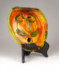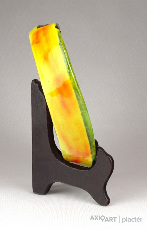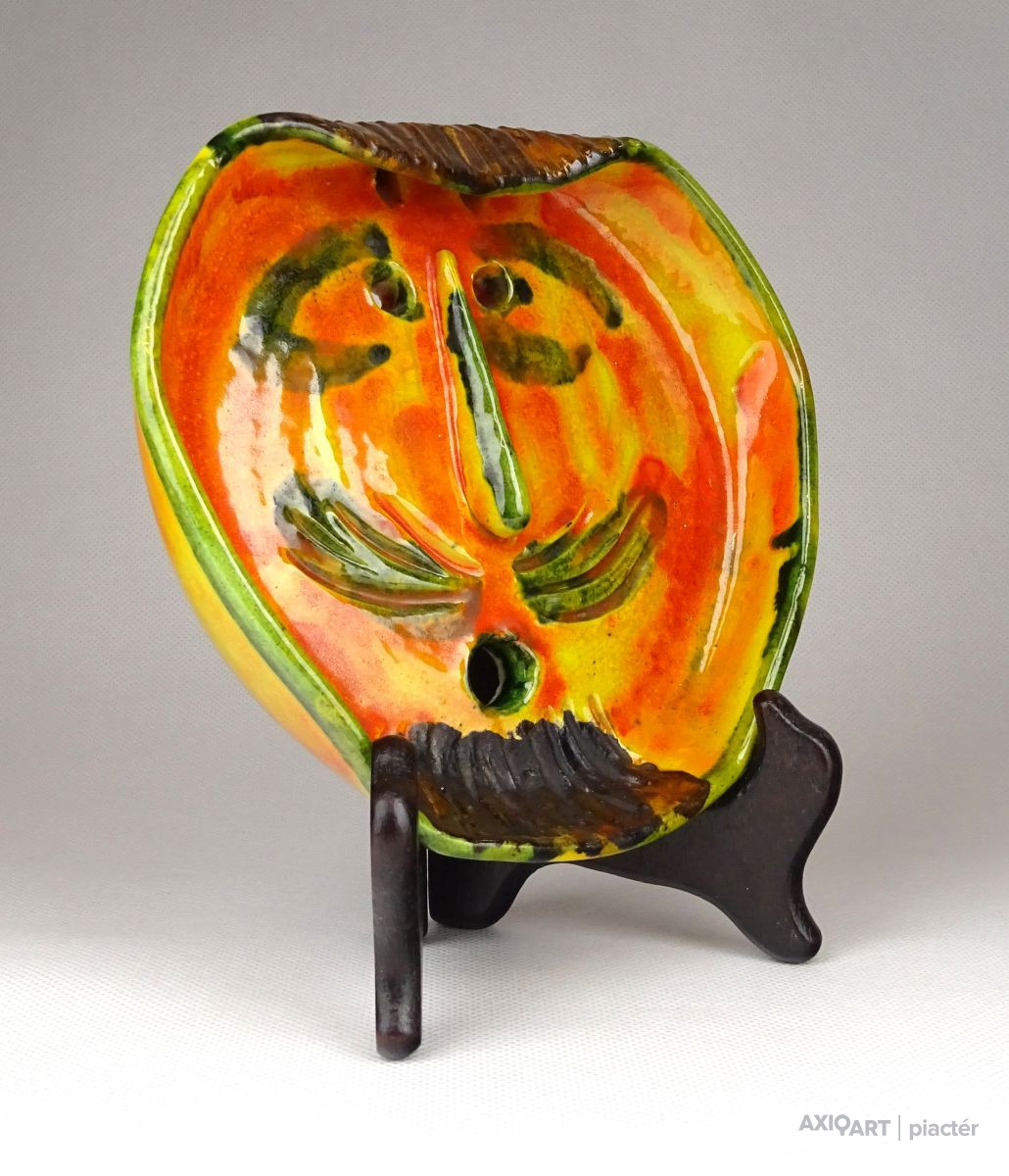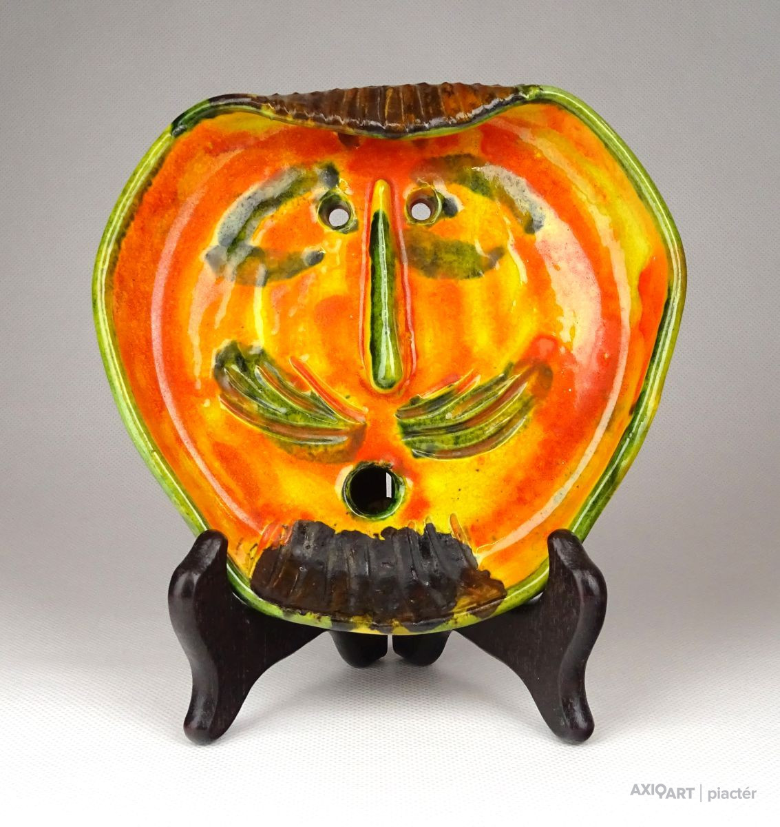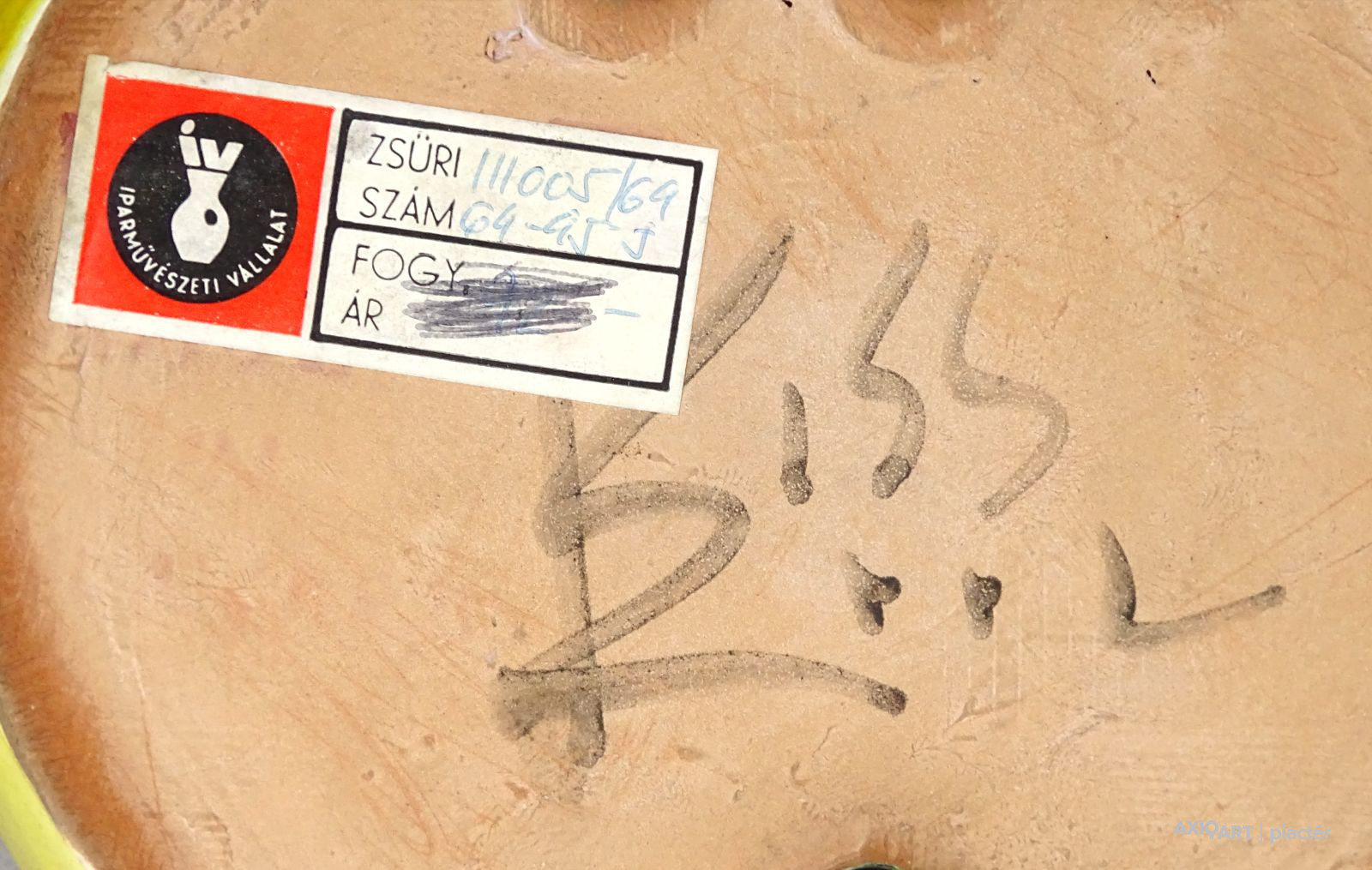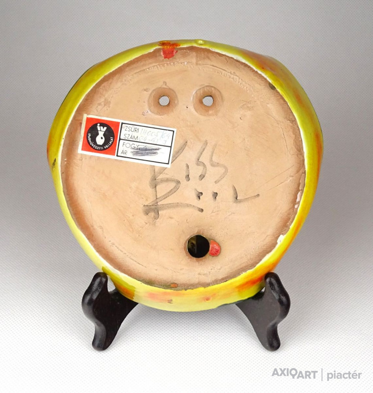 [1D329/BX-9] Hibátlan állapotú, jelzett Kiss Roóz fali kerámia, kisplasztika, falra akasztási lehetőséggel. Hátoldalán jelzés: KISS ROÓZ Mellette zsűricímke rajta felirat: IPARMŰVÉSZETI VÁLLALAT ZSŰRISZÁM: 111005/69 Magasság: 14 cm Szélesség: 14.5 cm Súly: 0.295 kg Kiss Roóz Ilona keramikus Születési hely: Szatmárnémeti [Satu Mare, RO] Születési dátum: 1920 Kiállítások az adatbázisban:  Kiss Roóz Ilona életműkiállítása Mesterei: Orbán Antal, Ohmann Béla. 1939-43: Iparművészeti Iskola, mesterei: Orbán Antal, Ohmann Béla. 1956, 1962: Munkácsy-díj; 1980: érdemes művész; 1984: SZOT-díj; 1994: MSZOSZ díja; 1995: Magyar Köztársasági Érdemrend Középkeresztje. A magyar kerámia Kovács Margit által teremtett naiv-népies irányzatának jeles művelője. Edényeit, kisplasztikáit, ill. murális alkotásait vidám színvilág és kedves humor jellemzi. 1948 és 1952 között tanított az Iparművészeti Főiskolán, azóta szabadfoglalkozású. Egyéni kiállítások 1966 • Csók Galéria, Budapest 1971 • Csók Galéria, Budapest 1980 • Budavári Ipaművészeti Bolt, Budapest 1984 • Petőfi Művelődési Ház, Tiszaluc 1989 • Kispréposti Palota, Eger (állandó kiállítás) 1992 • Bécs 1995 • Minigaléria, Miskolc 1996 • Petőfi Művelődési Ház, Tiszaluc 1997 • Derkovits Művelődési Központ, Tiszaújváros. Válogatott csoportos kiállítások 1947 • Karácsonyi kiállítás, Budapest • Fővárosi Művelődési Központ 1952 • Iparművészeti kiállítás, Ernst Múzeum, Budapest 1956 • Iparművészeti kiállítás, Iparművészeti Múzeum, Budapest 1958 • Magyar kerámia kiállítás, Vallauris 1959 • Magyar képzőművésznők kiállítása, Ernst Múzeum, Budapest 1959 • IV. Országos Iparművészeti Kiállítás, Műcsarnok, Budapest 1963 • Modern magyar kerámia, Royal Festival Hall, London 1965 • Országos Iparművészeti Kiállítás, Műcsarnok, Budapest 1968, 1970 • I., II. Országos Kerámia Biennálé, Pécs 1973 • Magyar kerámia, Ankara, Isztambul 1975 • Tárgy és alkotója, Iparművészeti Múzeum, Budapest 1982 • Magyar kézműves kerámia, Siklós 1995 • XX. századi magyar keramikusok, Iparművészeti Múzeum, Budapest • Az agyag mesterei, Vigadó Galéria, Budapest 1998 • Őszi Kerámia Kiállítás, Olaf Palme Ház, Budapest Művek közgyűjteményekben Köztéri művei kerámia dombormű (1958, Pereces, bölcsőde) kerámia napóra (1959, Székesfehérvár, Béke téri iskola) csempeburkolat (1961, Szeged, rendelőintézet) falikép (kerámia, 1962, Sopron, Gyermekszanatórium) kerámia falikép (1966, Békéscsaba, bölcsőde) Irodalom GÁL J.: ~ 77 éves. Beszélgetés a művésszel, Magyar Iparművészet, 1997/4. KESZTHELYI K.-LACZKÓ I.: A magyar kerámiaművészet I., Alkotók, adatok 1945-1998, Budapest, 1999. Vadas József + MAOE Forrás: artportal