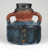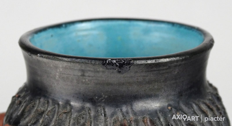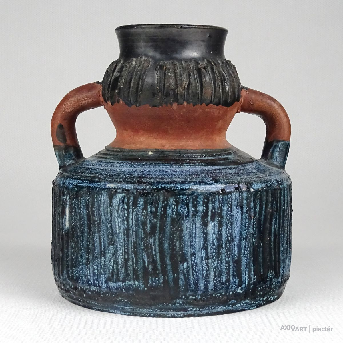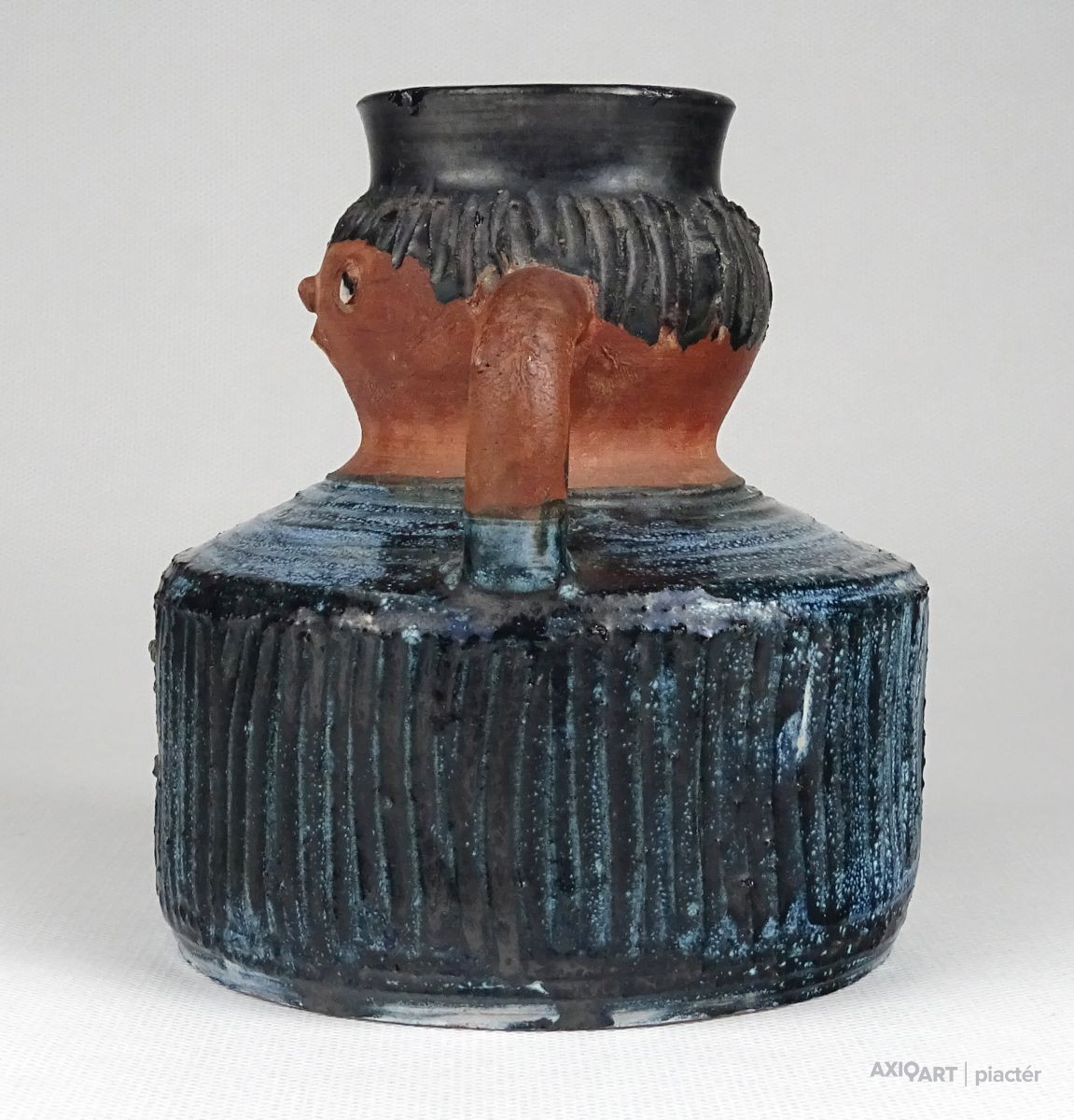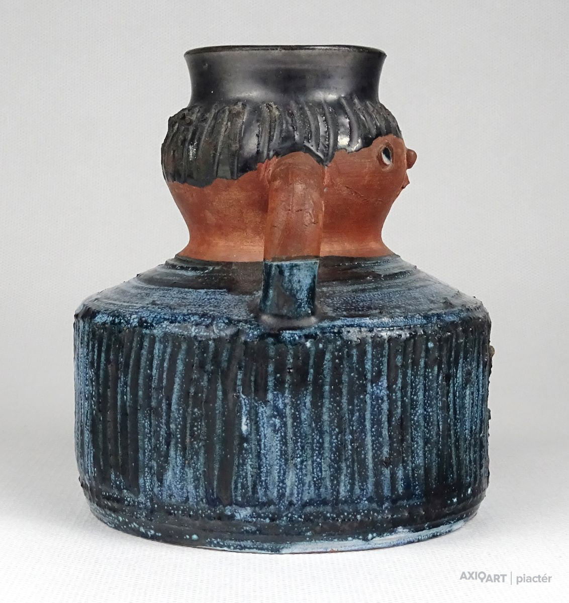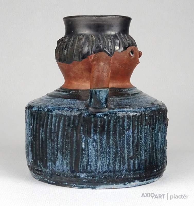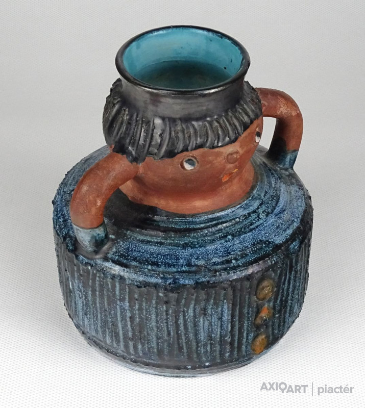 [1O063/X086] Szép állapotú, jelzett, ritkán előforduló kerámia kancsó, kiöntő. Alján jelzés: KISS ROOZ Magasság: 27 cm Szélesség: 10.5 cm Hosszúság: 15.5 cm Súly: 1.05 kg Kiss Roóz Ilona keramikus Születési hely: Szatmárnémeti [Satu Mare, RO] Születési dátum: 1920 Kiállítások az adatbázisban:  Kiss Roóz Ilona életműkiállítása Mesterei: Orbán Antal, Ohmann Béla. 1939-43: Iparművészeti Iskola, mesterei: Orbán Antal, Ohmann Béla. 1956, 1962: Munkácsy-díj; 1980: érdemes művész; 1984: SZOT-díj; 1994: MSZOSZ díja; 1995: Magyar Köztársasági Érdemrend Középkeresztje. A magyar kerámia Kovács Margit által teremtett naiv-népies irányzatának jeles művelője. Edényeit, kisplasztikáit, ill. murális alkotásait vidám színvilág és kedves humor jellemzi. 1948 és 1952 között tanított az Iparművészeti Főiskolán, azóta szabadfoglalkozású. Egyéni kiállítások 1966 • Csók Galéria, Budapest 1971 • Csók Galéria, Budapest 1980 • Budavári Ipaművészeti Bolt, Budapest 1984 • Petőfi Művelődési Ház, Tiszaluc 1989 • Kispréposti Palota, Eger (állandó kiállítás) 1992 • Bécs 1995 • Minigaléria, Miskolc 1996 • Petőfi Művelődési Ház, Tiszaluc 1997 • Derkovits Művelődési Központ, Tiszaújváros. Válogatott csoportos kiállítások 1947 • Karácsonyi kiállítás, Budapest • Fővárosi Művelődési Központ 1952 • Iparművészeti kiállítás, Ernst Múzeum, Budapest 1956 • Iparművészeti kiállítás, Iparművészeti Múzeum, Budapest 1958 • Magyar kerámia kiállítás, Vallauris 1959 • Magyar képzőművésznők kiállítása, Ernst Múzeum, Budapest 1959 • IV. Országos Iparművészeti Kiállítás, Műcsarnok, Budapest 1963 • Modern magyar kerámia, Royal Festival Hall, London 1965 • Országos Iparművészeti Kiállítás, Műcsarnok, Budapest 1968, 1970 • I., II. Országos Kerámia Biennálé, Pécs 1973 • Magyar kerámia, Ankara, Isztambul 1975 • Tárgy és alkotója, Iparművészeti Múzeum, Budapest 1982 • Magyar kézműves kerámia, Siklós 1995 • XX. századi magyar keramikusok, Iparművészeti Múzeum, Budapest • Az agyag mesterei, Vigadó Galéria, Budapest 1998 • Őszi Kerámia Kiállítás, Olaf Palme Ház, Budapest Művek közgyűjteményekben Köztéri művei kerámia dombormű (1958, Pereces, bölcsőde) kerámia napóra (1959, Székesfehérvár, Béke téri iskola) csempeburkolat (1961, Szeged, rendelőintézet) falikép (kerámia, 1962, Sopron, Gyermekszanatórium) kerámia falikép (1966, Békéscsaba, bölcsőde) Irodalom GÁL J.: ~ 77 éves. Beszélgetés a művésszel, Magyar Iparművészet, 1997/4. KESZTHELYI K.-LACZKÓ I.: A magyar kerámiaművészet I., Alkotók, adatok 1945-1998, Budapest, 1999. Vadas József + MAOE Forrás: artportal.hu