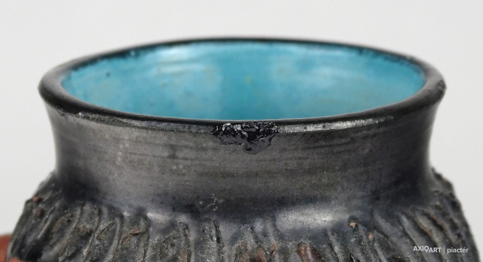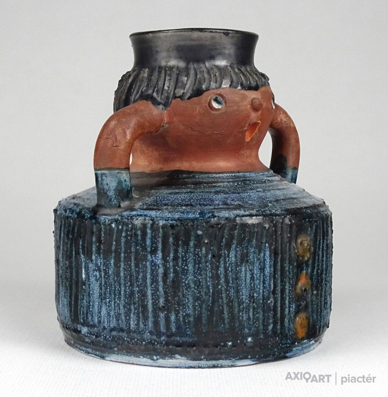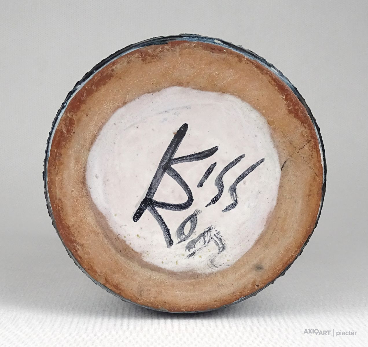 [1S294/Z059] Jelzett Kis Roóz Ilona kerámia figura. Felső peremén néhány kisebb elfestett lepattanás található, lásd fotó. Alján jelzés: KISS ROÓZ Magasság: 12.5 cm Szélesség: 11 cm Súly: 0.485 kg Kiss Roóz Ilona keramikus Születési hely: Szatmárnémeti [Satu Mare, RO] Születési dátum: 1920 Kiállítások az adatbázisban:  Kiss Roóz Ilona életműkiállítása Mesterei: Orbán Antal, Ohmann Béla. 1939-43: Iparművészeti Iskola, mesterei: Orbán Antal, Ohmann Béla. 1956, 1962: Munkácsy-díj; 1980: érdemes művész; 1984: SZOT-díj; 1994: MSZOSZ díja; 1995: Magyar Köztársasági Érdemrend Középkeresztje. A magyar kerámia Kovács Margit által teremtett naiv-népies irányzatának jeles művelője. Edényeit, kisplasztikáit, ill. murális alkotásait vidám színvilág és kedves humor jellemzi. 1948 és 1952 között tanított az Iparművészeti Főiskolán, azóta szabadfoglalkozású. Egyéni kiállítások 1964 ? Katona József Múzeum, Kecskemét 1973 ? Derkovits Galéria, Szombathely 1977 ? Csepel Vas és Fémművek, Budapest 1981 ? Kaesz Gyula Szakmunkásképző Intézet, Budapest 1983 ? Nógrádi Sándor Múzeum, Salgótarján 1987 ? Petőfi Művelődési Ház, Tiszaluc 1994 ? Petőfi Művelődési Ház, Tiszaluc 1995 ? Csók Galéria, Budapest [Pannonhalmi Zsuzsával és Sarkantyu Judittal] Válogatott csoportos kiállítások 1952 ? Iparművészeti kiállítás, Ernst Múzeum, Budapest IV. Országos Iparművészeti Kiállítás, Műcsarnok, Budapest Országos Iparművészeti Kiállítás, Műcsarnok, Budapest I., II. Országos Kerámia Biennálé, Pécs Magyar kerámia, Ankara, Isztambul XX. századi magyar keramikusok, Iparművészeti Múzeum, Budapest ? Az agyag mesterei, Vigadó Galéria, Budapest Őszi Kerámia Kiállítás, Olaf Palme Ház, Budapest Művek közgyűjteményekben Déri Múzeum, Debrecen ? Iparművészeti Múzeum, Budapest ? Janus Pannonius Múzeum, Pécs ? Kispréposti Palota, önálló gyűjtemény, Eger. Köztéri művei kerámia dombormű (1958, Pereces, bölcsőde) kerámia napóra (1959, Székesfehérvár, Béke téri iskola) csempeburkolat (1961, Szeged, rendelőintézet) falikép (kerámia, 1962, Sopron, Gyermekszanatórium) kerámia falikép (1966, Békéscsaba, bölcsőde) Irodalom GÁL J.: ~ 77 éves. Beszélgetés a művésszel, Magyar Iparművészet, 1997/4. KESZTHELYI K.-LACZKÓ I.: A magyar kerámiaművészet I., Alkotók, adatok 1945-1998, Budapest, 1999. Vadas József + MAOE Forrás: artportal