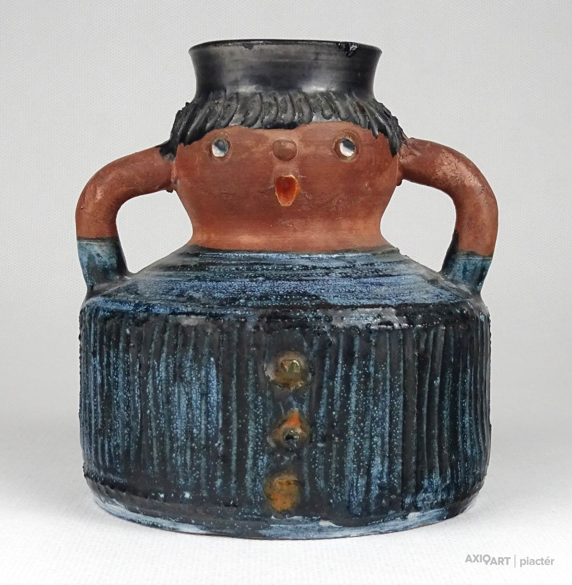 [0U731/Z023] Jelzett, Kiss Roóz Ilona által készített kerámia kórustag figura, gyertyatartó, mécsestartó. Nyaka restaurált. Alján körpecsétes jelzés: KISS ROÓZ Magasság: 20.2 cm Szélesség: 9.5 cm Súly: 0.495 kg Kiss Roóz Ilona keramikus Születési hely: Szatmárnémeti [Satu Mare, RO] Születési dátum: 1920 Kiállítások az adatbázisban:  Kiss Roóz Ilona életműkiállítása Mesterei: Orbán Antal, Ohmann Béla. 1939-43: Iparművészeti Iskola, mesterei: Orbán Antal, Ohmann Béla. 1956, 1962: Munkácsy-díj; 1980: érdemes művész; 1984: SZOT-díj; 1994: MSZOSZ díja; 1995: Magyar Köztársasági Érdemrend Középkeresztje. A magyar kerámia Kovács Margit által teremtett naiv-népies irányzatának jeles művelője. Edényeit, kisplasztikáit, ill. murális alkotásait vidám színvilág és kedves humor jellemzi. 1948 és 1952 között tanított az Iparművészeti Főiskolán, azóta szabadfoglalkozású. Egyéni kiállítások 1966 • Csók Galéria, Budapest 1971 • Csók Galéria, Budapest 1980 • Budavári Ipaművészeti Bolt, Budapest 1984 • Petőfi Művelődési Ház, Tiszaluc 1989 • Kispréposti Palota, Eger (állandó kiállítás) 1992 • Bécs 1995 • Minigaléria, Miskolc 1996 • Petőfi Művelődési Ház, Tiszaluc 1997 • Derkovits Művelődési Központ, Tiszaújváros. Válogatott csoportos kiállítások 1947 • Karácsonyi kiállítás, Budapest • Fővárosi Művelődési Központ 1952 • Iparművészeti kiállítás, Ernst Múzeum, Budapest 1956 • Iparművészeti kiállítás, Iparművészeti Múzeum, Budapest 1958 • Magyar kerámia kiállítás, Vallauris 1959 • Magyar képzőművésznők kiállítása, Ernst Múzeum, Budapest 1959 • IV. Országos Iparművészeti Kiállítás, Műcsarnok, Budapest 1963 • Modern magyar kerámia, Royal Festival Hall, London 1965 • Országos Iparművészeti Kiállítás, Műcsarnok, Budapest 1968, 1970 • I., II. Országos Kerámia Biennálé, Pécs 1973 • Magyar kerámia, Ankara, Isztambul 1975 • Tárgy és alkotója, Iparművészeti Múzeum, Budapest 1982 • Magyar kézműves kerámia, Siklós 1995 • XX. századi magyar keramikusok, Iparművészeti Múzeum, Budapest • Az agyag mesterei, Vigadó Galéria, Budapest 1998 • Őszi Kerámia Kiállítás, Olaf Palme Ház, Budapest Művek közgyűjteményekben Köztéri művei kerámia dombormű (1958, Pereces, bölcsőde) kerámia napóra (1959, Székesfehérvár, Béke téri iskola) csempeburkolat (1961, Szeged, rendelőintézet) falikép (kerámia, 1962, Sopron, Gyermekszanatórium) kerámia falikép (1966, Békéscsaba, bölcsőde) Irodalom GÁL J.: ~ 77 éves. Beszélgetés a művésszel, Magyar Iparművészet, 1997/4. KESZTHELYI K.-LACZKÓ I.: A magyar kerámiaművészet I., Alkotók, adatok 1945-1998, Budapest, 1999. Vadas József + MAOE Forrás: artportal.hu