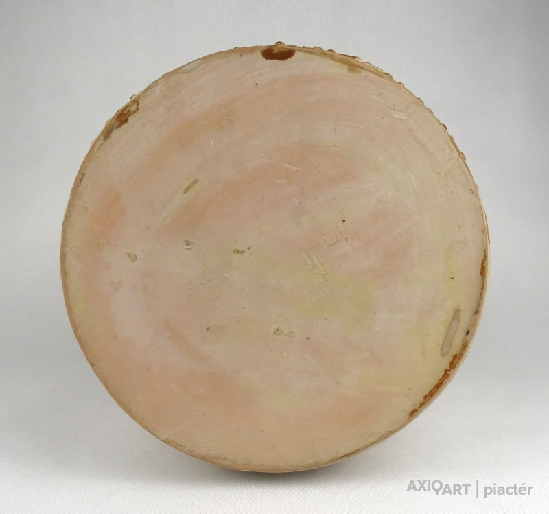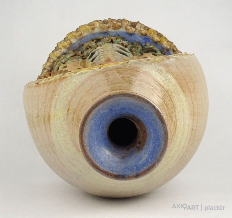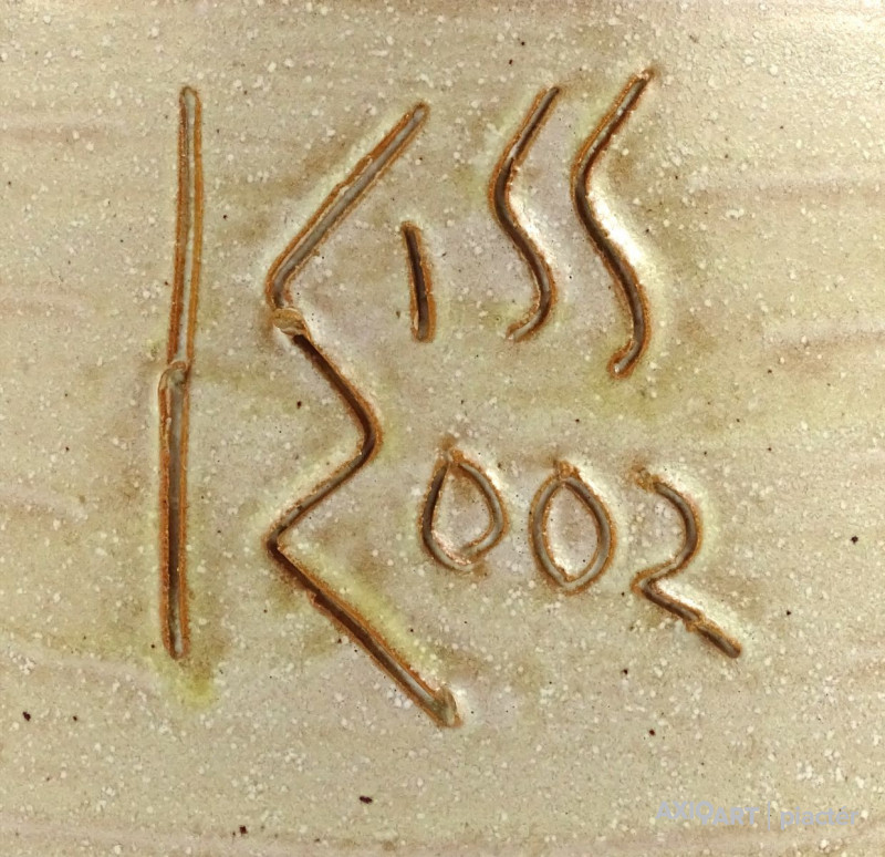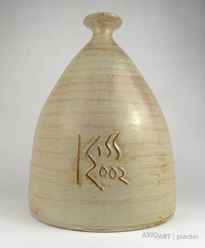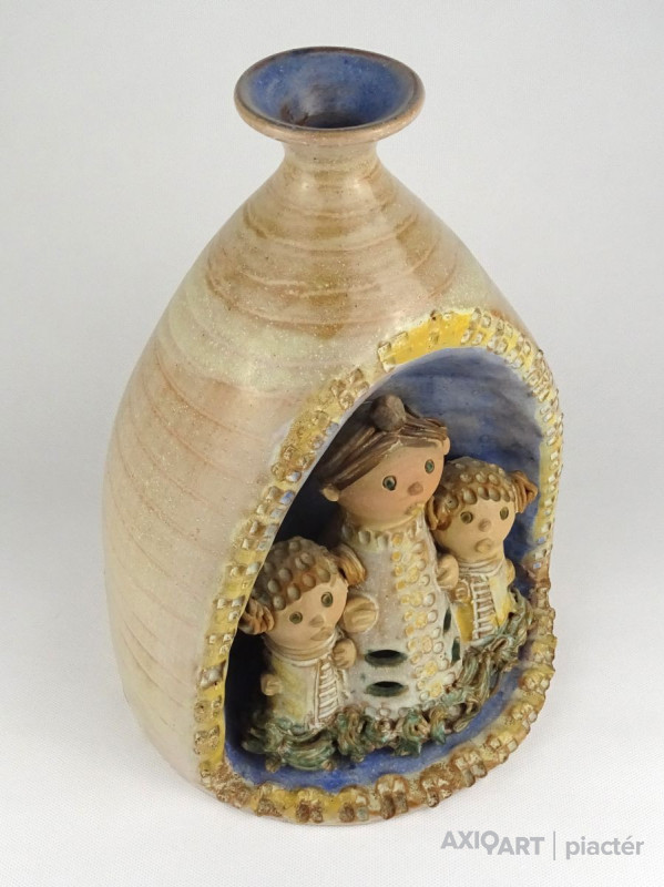 [1S120/Z033] Nagy méretű hibátlan állapotú jelzett Kiss Roóz kerámia dísztárgy Váza test oldalában található három alak, lánykórus. Hátoldalán karcolt jelzés: KISS ROÓZ Magasság: 30 cm Szélesség: 22.5 cm Súly: 2.825 kg Kiss Roóz Ilona keramikus Születési hely: Szatmárnémeti [Satu Mare, RO] Születési dátum: 1920 Kiállítások az adatbázisban:  Kiss Roóz Ilona életműkiállítása Mesterei: Orbán Antal, Ohmann Béla. 1939-43: Iparművészeti Iskola, mesterei: Orbán Antal, Ohmann Béla. 1956, 1962: Munkácsy-díj; 1980: érdemes művész; 1984: SZOT-díj; 1994: MSZOSZ díja; 1995: Magyar Köztársasági Érdemrend Középkeresztje. A magyar kerámia Kovács Margit által teremtett naiv-népies irányzatának jeles művelője. Edényeit, kisplasztikáit, ill. murális alkotásait vidám színvilág és kedves humor jellemzi. 1948 és 1952 között tanított az Iparművészeti Főiskolán, azóta szabadfoglalkozású. Egyéni kiállítások 1966 • Csók Galéria, Budapest 1971 • Csók Galéria, Budapest 1980 • Budavári Ipaművészeti Bolt, Budapest 1984 • Petőfi Művelődési Ház, Tiszaluc 1989 • Kispréposti Palota, Eger (állandó kiállítás) 1992 • Bécs 1995 • Minigaléria, Miskolc 1996 • Petőfi Művelődési Ház, Tiszaluc 1997 • Derkovits Művelődési Központ, Tiszaújváros. Válogatott csoportos kiállítások 1947 • Karácsonyi kiállítás, Budapest • Fővárosi Művelődési Központ 1952 • Iparművészeti kiállítás, Ernst Múzeum, Budapest 1956 • Iparművészeti kiállítás, Iparművészeti Múzeum, Budapest 1958 • Magyar kerámia kiállítás, Vallauris 1959 • Magyar képzőművésznők kiállítása, Ernst Múzeum, Budapest 1959 • IV. Országos Iparművészeti Kiállítás, Műcsarnok, Budapest 1963 • Modern magyar kerámia, Royal Festival Hall, London 1965 • Országos Iparművészeti Kiállítás, Műcsarnok, Budapest 1968, 1970 • I., II. Országos Kerámia Biennálé, Pécs 1973 • Magyar kerámia, Ankara, Isztambul 1975 • Tárgy és alkotója, Iparművészeti Múzeum, Budapest 1982 • Magyar kézműves kerámia, Siklós 1995 • XX. századi magyar keramikusok, Iparművészeti Múzeum, Budapest • Az agyag mesterei, Vigadó Galéria, Budapest 1998 • Őszi Kerámia Kiállítás, Olaf Palme Ház, Budapest Művek közgyűjteményekben Köztéri művei kerámia dombormű (1958, Pereces, bölcsőde) kerámia napóra (1959, Székesfehérvár, Béke téri iskola) csempeburkolat (1961, Szeged, rendelőintézet) falikép (kerámia, 1962, Sopron, Gyermekszanatórium) kerámia falikép (1966, Békéscsaba, bölcsőde) Irodalom GÁL J.: ~ 77 éves. Beszélgetés a művésszel, Magyar Iparművészet, 1997/4. KESZTHELYI K.-LACZKÓ I.: A magyar kerámiaművészet I., Alkotók, adatok 1945-1998, Budapest, 1999. Vadas József + MAOE Forrás: artportal.hu
