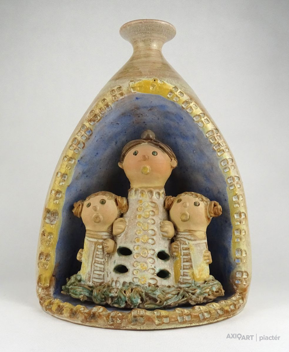 [0U704/BX-9] Hibátlan állapotú, jelzett, háromalakos kerámia figurális mécsestartó figura. Jelzés: KISS ROÓZ Magasság: 19 cm Szélesség: 6 cm Hosszúság: 16 cm Súly: 0.639 kg Kiss Roóz Ilona keramikus Születési hely: Szatmárnémeti [Satu Mare, RO] Születési dátum: 1920 Kiállítások az adatbázisban:  Kiss Roóz Ilona életműkiállítása Mesterei: Orbán Antal, Ohmann Béla. 1939-43: Iparművészeti Iskola, mesterei: Orbán Antal, Ohmann Béla. 1956, 1962: Munkácsy-díj; 1980: érdemes művész; 1984: SZOT-díj; 1994: MSZOSZ díja; 1995: Magyar Köztársasági Érdemrend Középkeresztje. A magyar kerámia Kovács Margit által teremtett naiv-népies irányzatának jeles művelője. Edényeit, kisplasztikáit, ill. murális alkotásait vidám színvilág és kedves humor jellemzi. 1948 és 1952 között tanított az Iparművészeti Főiskolán, azóta szabadfoglalkozású. Egyéni kiállítások 1966 • Csók Galéria, Budapest 1971 • Csók Galéria, Budapest 1980 • Budavári Ipaművészeti Bolt, Budapest 1984 • Petőfi Művelődési Ház, Tiszaluc 1989 • Kispréposti Palota, Eger (állandó kiállítás) 1992 • Bécs 1995 • Minigaléria, Miskolc 1996 • Petőfi Művelődési Ház, Tiszaluc 1997 • Derkovits Művelődési Központ, Tiszaújváros. Válogatott csoportos kiállítások 1947 • Karácsonyi kiállítás, Budapest • Fővárosi Művelődési Központ 1952 • Iparművészeti kiállítás, Ernst Múzeum, Budapest 1956 • Iparművészeti kiállítás, Iparművészeti Múzeum, Budapest 1958 • Magyar kerámia kiállítás, Vallauris 1959 • Magyar képzőművésznők kiállítása, Ernst Múzeum, Budapest 1959 • IV. Országos Iparművészeti Kiállítás, Műcsarnok, Budapest 1963 • Modern magyar kerámia, Royal Festival Hall, London 1965 • Országos Iparművészeti Kiállítás, Műcsarnok, Budapest 1968, 1970 • I., II. Országos Kerámia Biennálé, Pécs 1973 • Magyar kerámia, Ankara, Isztambul 1975 • Tárgy és alkotója, Iparművészeti Múzeum, Budapest 1982 • Magyar kézműves kerámia, Siklós 1995 • XX. századi magyar keramikusok, Iparművészeti Múzeum, Budapest • Az agyag mesterei, Vigadó Galéria, Budapest 1998 • Őszi Kerámia Kiállítás, Olaf Palme Ház, Budapest Művek közgyűjteményekben Köztéri művei kerámia dombormű (1958, Pereces, bölcsőde) kerámia napóra (1959, Székesfehérvár, Béke téri iskola) csempeburkolat (1961, Szeged, rendelőintézet) falikép (kerámia, 1962, Sopron, Gyermekszanatórium) kerámia falikép (1966, Békéscsaba, bölcsőde) Irodalom GÁL J.: ~ 77 éves. Beszélgetés a művésszel, Magyar Iparművészet, 1997/4. KESZTHELYI K.-LACZKÓ I.: A magyar kerámiaművészet I., Alkotók, adatok 1945-1998, Budapest, 1999. Vadas József + MAOE Forrás: artportal.hu