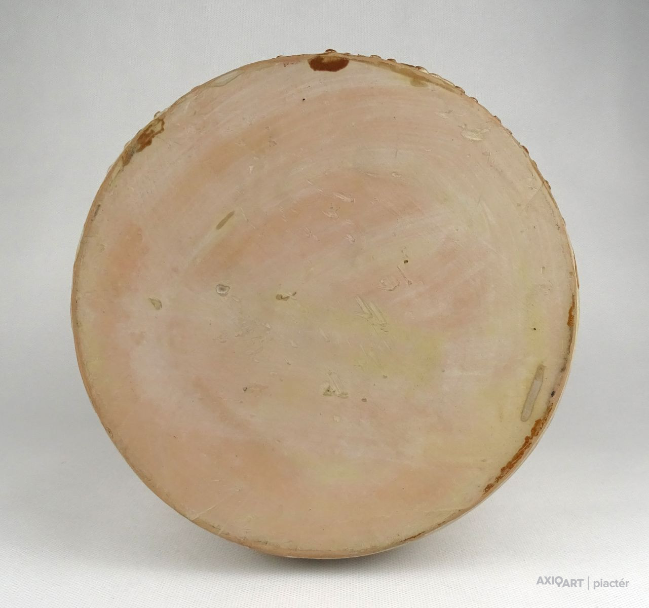 [1D329/BX-9] Hibátlan állapotú, jelzett Kiss Roóz fali kerámia, kisplasztika, falra akasztási lehetőséggel. Hátoldalán jelzés: KISS ROÓZ Mellette zsűricímke rajta felirat: IPARMŰVÉSZETI VÁLLALAT ZSŰRISZÁM: 111005/69 Magasság: 14 cm Szélesség: 14.5 cm Súly: 0.295 kg Kiss Roóz Ilona keramikus Születési hely: Szatmárnémeti [Satu Mare, RO] Születési dátum: 1920 Kiállítások az adatbázisban:  Kiss Roóz Ilona életműkiállítása Mesterei: Orbán Antal, Ohmann Béla. 1939-43: Iparművészeti Iskola, mesterei: Orbán Antal, Ohmann Béla. 1956, 1962: Munkácsy-díj; 1980: érdemes művész; 1984: SZOT-díj; 1994: MSZOSZ díja; 1995: Magyar Köztársasági Érdemrend Középkeresztje. A magyar kerámia Kovács Margit által teremtett naiv-népies irányzatának jeles művelője. Edényeit, kisplasztikáit, ill. murális alkotásait vidám színvilág és kedves humor jellemzi. 1948 és 1952 között tanított az Iparművészeti Főiskolán, azóta szabadfoglalkozású. Egyéni kiállítások 1966 • Csók Galéria, Budapest 1971 • Csók Galéria, Budapest 1980 • Budavári Ipaművészeti Bolt, Budapest 1984 • Petőfi Művelődési Ház, Tiszaluc 1989 • Kispréposti Palota, Eger (állandó kiállítás) 1992 • Bécs 1995 • Minigaléria, Miskolc 1996 • Petőfi Művelődési Ház, Tiszaluc 1997 • Derkovits Művelődési Központ, Tiszaújváros. Válogatott csoportos kiállítások 1947 • Karácsonyi kiállítás, Budapest • Fővárosi Művelődési Központ 1952 • Iparművészeti kiállítás, Ernst Múzeum, Budapest 1956 • Iparművészeti kiállítás, Iparművészeti Múzeum, Budapest 1958 • Magyar kerámia kiállítás, Vallauris 1959 • Magyar képzőművésznők kiállítása, Ernst Múzeum, Budapest 1959 • IV. Országos Iparművészeti Kiállítás, Műcsarnok, Budapest 1963 • Modern magyar kerámia, Royal Festival Hall, London 1965 • Országos Iparművészeti Kiállítás, Műcsarnok, Budapest 1968, 1970 • I., II. Országos Kerámia Biennálé, Pécs 1973 • Magyar kerámia, Ankara, Isztambul 1975 • Tárgy és alkotója, Iparművészeti Múzeum, Budapest 1982 • Magyar kézműves kerámia, Siklós 1995 • XX. századi magyar keramikusok, Iparművészeti Múzeum, Budapest • Az agyag mesterei, Vigadó Galéria, Budapest 1998 • Őszi Kerámia Kiállítás, Olaf Palme Ház, Budapest Művek közgyűjteményekben Köztéri művei kerámia dombormű (1958, Pereces, bölcsőde) kerámia napóra (1959, Székesfehérvár, Béke téri iskola) csempeburkolat (1961, Szeged, rendelőintézet) falikép (kerámia, 1962, Sopron, Gyermekszanatórium) kerámia falikép (1966, Békéscsaba, bölcsőde) Irodalom GÁL J.: ~ 77 éves. Beszélgetés a művésszel, Magyar Iparművészet, 1997/4. KESZTHELYI K.-LACZKÓ I.: A magyar kerámiaművészet I., Alkotók, adatok 1945-1998, Budapest, 1999. Vadas József + MAOE Forrás: artportal