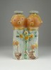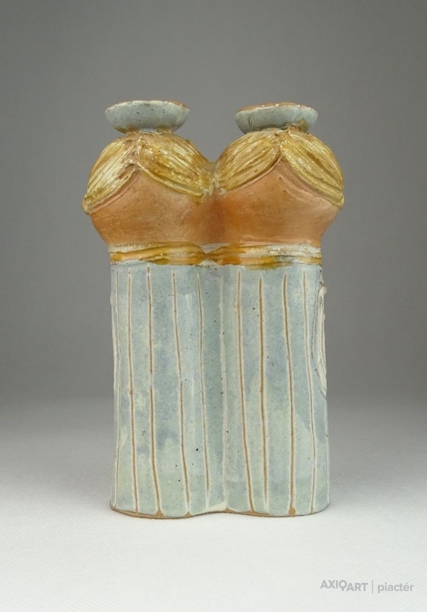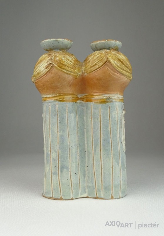 [0S003/X046] Hibátlan állapotú, kétalakos, kertészkedő, jelzett kerámia figura pár, gyertyatartó figura. Alján jelzés: KISS ROÓZ Magasság: 17.5 cm Szélesség: 11.5 cm Súly: 0.407 kg Kiss Roóz Ilona keramikus Születési hely: Szatmárnémeti [Satu Mare, RO] Születési dátum: 1920 Kiállítások az adatbázisban:  Kiss Roóz Ilona életműkiállítása Mesterei: Orbán Antal, Ohmann Béla. 1939-43: Iparművészeti Iskola, mesterei: Orbán Antal, Ohmann Béla. 1956, 1962: Munkácsy-díj; 1980: érdemes művész; 1984: SZOT-díj; 1994: MSZOSZ díja; 1995: Magyar Köztársasági Érdemrend Középkeresztje. A magyar kerámia Kovács Margit által teremtett naiv-népies irányzatának jeles művelője. Edényeit, kisplasztikáit, ill. murális alkotásait vidám színvilág és kedves humor jellemzi. 1948 és 1952 között tanított az Iparművészeti Főiskolán, azóta szabadfoglalkozású. Egyéni kiállítások 1966 • Csók Galéria, Budapest 1971 • Csók Galéria, Budapest 1980 • Budavári Ipaművészeti Bolt, Budapest 1984 • Petőfi Művelődési Ház, Tiszaluc 1989 • Kispréposti Palota, Eger (állandó kiállítás) 1992 • Bécs 1995 • Minigaléria, Miskolc 1996 • Petőfi Művelődési Ház, Tiszaluc 1997 • Derkovits Művelődési Központ, Tiszaújváros. Válogatott csoportos kiállítások 1947 • Karácsonyi kiállítás, Budapest • Fővárosi Művelődési Központ 1952 • Iparművészeti kiállítás, Ernst Múzeum, Budapest 1956 • Iparművészeti kiállítás, Iparművészeti Múzeum, Budapest 1958 • Magyar kerámia kiállítás, Vallauris 1959 • Magyar képzőművésznők kiállítása, Ernst Múzeum, Budapest 1959 • IV. Országos Iparművészeti Kiállítás, Műcsarnok, Budapest 1963 • Modern magyar kerámia, Royal Festival Hall, London 1965 • Országos Iparművészeti Kiállítás, Műcsarnok, Budapest 1968, 1970 • I., II. Országos Kerámia Biennálé, Pécs 1973 • Magyar kerámia, Ankara, Isztambul 1975 • Tárgy és alkotója, Iparművészeti Múzeum, Budapest 1982 • Magyar kézműves kerámia, Siklós 1995 • XX. századi magyar keramikusok, Iparművészeti Múzeum, Budapest • Az agyag mesterei, Vigadó Galéria, Budapest 1998 • Őszi Kerámia Kiállítás, Olaf Palme Ház, Budapest Művek közgyűjteményekben Köztéri művei kerámia dombormű (1958, Pereces, bölcsőde) kerámia napóra (1959, Székesfehérvár, Béke téri iskola) csempeburkolat (1961, Szeged, rendelőintézet) falikép (kerámia, 1962, Sopron, Gyermekszanatórium) kerámia falikép (1966, Békéscsaba, bölcsőde) Irodalom GÁL J.: ~ 77 éves. Beszélgetés a művésszel, Magyar Iparművészet, 1997/4. KESZTHELYI K.-LACZKÓ I.: A magyar kerámiaművészet I., Alkotók, adatok 1945-1998, Budapest, 1999. Vadas József + MAOE Forrás: artportal.hu