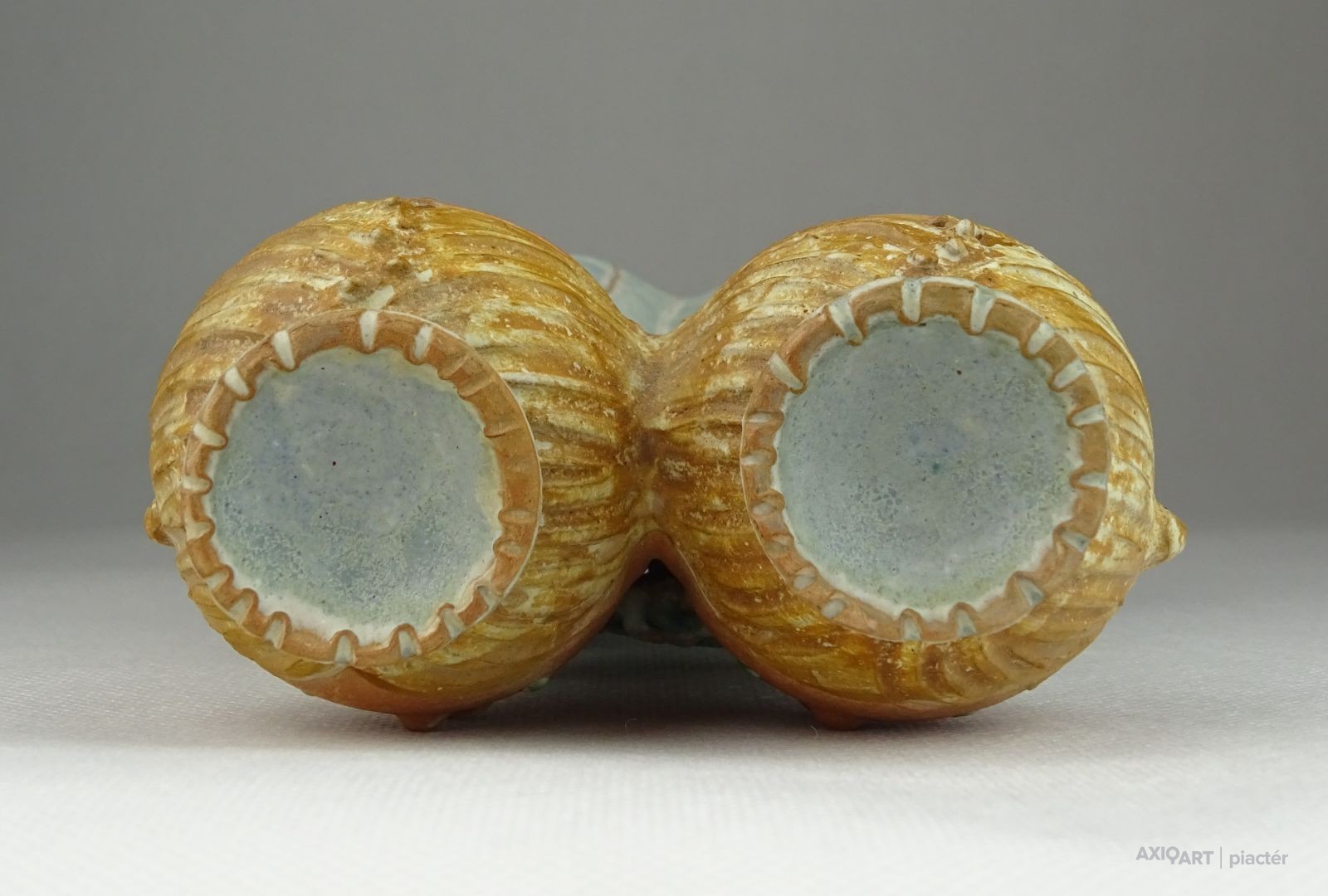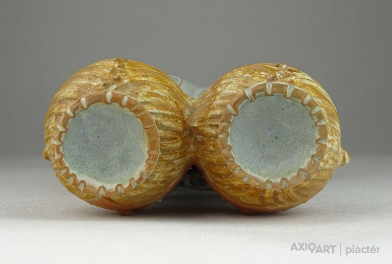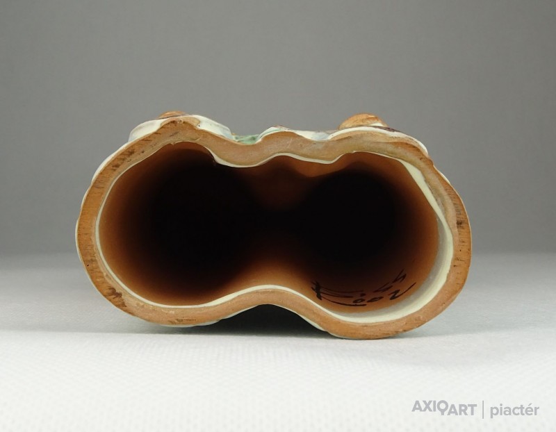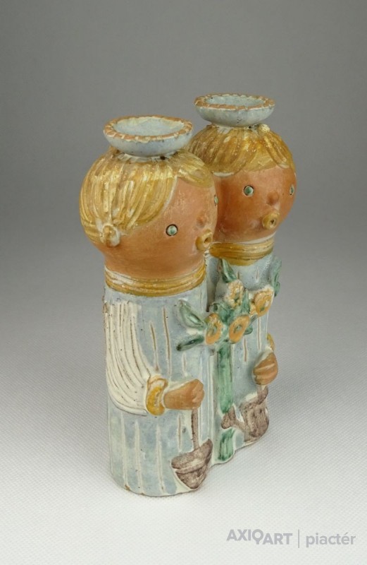 [0U704/BX-9] Hibátlan állapotú, jelzett, háromalakos kerámia figurális mécsestartó figura. Jelzés: KISS ROÓZ Magasság: 19 cm Szélesség: 6 cm Hosszúság: 16 cm Súly: 0.639 kg Kiss Roóz Ilona keramikus Születési hely: Szatmárnémeti [Satu Mare, RO] Születési dátum: 1920 Kiállítások az adatbázisban:  Kiss Roóz Ilona életműkiállítása Mesterei: Orbán Antal, Ohmann Béla. 1939-43: Iparművészeti Iskola, mesterei: Orbán Antal, Ohmann Béla. 1956, 1962: Munkácsy-díj; 1980: érdemes művész; 1984: SZOT-díj; 1994: MSZOSZ díja; 1995: Magyar Köztársasági Érdemrend Középkeresztje. A magyar kerámia Kovács Margit által teremtett naiv-népies irányzatának jeles művelője. Edényeit, kisplasztikáit, ill. murális alkotásait vidám színvilág és kedves humor jellemzi. 1948 és 1952 között tanított az Iparművészeti Főiskolán, azóta szabadfoglalkozású. Egyéni kiállítások 1966 • Csók Galéria, Budapest 1971 • Csók Galéria, Budapest 1980 • Budavári Ipaművészeti Bolt, Budapest 1984 • Petőfi Művelődési Ház, Tiszaluc 1989 • Kispréposti Palota, Eger (állandó kiállítás) 1992 • Bécs 1995 • Minigaléria, Miskolc 1996 • Petőfi Művelődési Ház, Tiszaluc 1997 • Derkovits Művelődési Központ, Tiszaújváros. Válogatott csoportos kiállítások 1947 • Karácsonyi kiállítás, Budapest • Fővárosi Művelődési Központ 1952 • Iparművészeti kiállítás, Ernst Múzeum, Budapest 1956 • Iparművészeti kiállítás, Iparművészeti Múzeum, Budapest 1958 • Magyar kerámia kiállítás, Vallauris 1959 • Magyar képzőművésznők kiállítása, Ernst Múzeum, Budapest 1959 • IV. Országos Iparművészeti Kiállítás, Műcsarnok, Budapest 1963 • Modern magyar kerámia, Royal Festival Hall, London 1965 • Országos Iparművészeti Kiállítás, Műcsarnok, Budapest 1968, 1970 • I., II. Országos Kerámia Biennálé, Pécs 1973 • Magyar kerámia, Ankara, Isztambul 1975 • Tárgy és alkotója, Iparművészeti Múzeum, Budapest 1982 • Magyar kézműves kerámia, Siklós 1995 • XX. századi magyar keramikusok, Iparművészeti Múzeum, Budapest • Az agyag mesterei, Vigadó Galéria, Budapest 1998 • Őszi Kerámia Kiállítás, Olaf Palme Ház, Budapest Művek közgyűjteményekben Köztéri művei kerámia dombormű (1958, Pereces, bölcsőde) kerámia napóra (1959, Székesfehérvár, Béke téri iskola) csempeburkolat (1961, Szeged, rendelőintézet) falikép (kerámia, 1962, Sopron, Gyermekszanatórium) kerámia falikép (1966, Békéscsaba, bölcsőde) Irodalom GÁL J.: ~ 77 éves. Beszélgetés a művésszel, Magyar Iparművészet, 1997/4. KESZTHELYI K.-LACZKÓ I.: A magyar kerámiaművészet I., Alkotók, adatok 1945-1998, Budapest, 1999. Vadas József + MAOE Forrás: artportal.hu