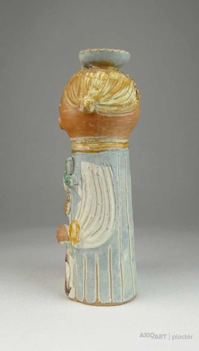 [0S004/X046] Hibátlan állapotú, kisméretű, jelzett kerámia nő figura, díszváza. Jelzés: KISS ROÓZ Magasság: 14.5 cm Szélesség: 7 cm Súly: 0.298 kg Kiss Roóz Ilona keramikus Születési hely: Szatmárnémeti [Satu Mare, RO] Születési dátum: 1920 Kiállítások az adatbázisban:  Kiss Roóz Ilona életműkiállítása Mesterei: Orbán Antal, Ohmann Béla. 1939-43: Iparművészeti Iskola, mesterei: Orbán Antal, Ohmann Béla. 1956, 1962: Munkácsy-díj; 1980: érdemes művész; 1984: SZOT-díj; 1994: MSZOSZ díja; 1995: Magyar Köztársasági Érdemrend Középkeresztje. A magyar kerámia Kovács Margit által teremtett naiv-népies irányzatának jeles művelője. Edényeit, kisplasztikáit, ill. murális alkotásait vidám színvilág és kedves humor jellemzi. 1948 és 1952 között tanított az Iparművészeti Főiskolán, azóta szabadfoglalkozású. Egyéni kiállítások 1966 • Csók Galéria, Budapest 1971 • Csók Galéria, Budapest 1980 • Budavári Ipaművészeti Bolt, Budapest 1984 • Petőfi Művelődési Ház, Tiszaluc 1989 • Kispréposti Palota, Eger (állandó kiállítás) 1992 • Bécs 1995 • Minigaléria, Miskolc 1996 • Petőfi Művelődési Ház, Tiszaluc 1997 • Derkovits Művelődési Központ, Tiszaújváros. Válogatott csoportos kiállítások 1947 • Karácsonyi kiállítás, Budapest • Fővárosi Művelődési Központ 1952 • Iparművészeti kiállítás, Ernst Múzeum, Budapest 1956 • Iparművészeti kiállítás, Iparművészeti Múzeum, Budapest 1958 • Magyar kerámia kiállítás, Vallauris 1959 • Magyar képzőművésznők kiállítása, Ernst Múzeum, Budapest 1959 • IV. Országos Iparművészeti Kiállítás, Műcsarnok, Budapest 1963 • Modern magyar kerámia, Royal Festival Hall, London 1965 • Országos Iparművészeti Kiállítás, Műcsarnok, Budapest 1968, 1970 • I., II. Országos Kerámia Biennálé, Pécs 1973 • Magyar kerámia, Ankara, Isztambul 1975 • Tárgy és alkotója, Iparművészeti Múzeum, Budapest 1982 • Magyar kézműves kerámia, Siklós 1995 • XX. századi magyar keramikusok, Iparművészeti Múzeum, Budapest • Az agyag mesterei, Vigadó Galéria, Budapest 1998 • Őszi Kerámia Kiállítás, Olaf Palme Ház, Budapest Művek közgyűjteményekben Köztéri művei kerámia dombormű (1958, Pereces, bölcsőde) kerámia napóra (1959, Székesfehérvár, Béke téri iskola) csempeburkolat (1961, Szeged, rendelőintézet) falikép (kerámia, 1962, Sopron, Gyermekszanatórium) kerámia falikép (1966, Békéscsaba, bölcsőde) Irodalom GÁL J.: ~ 77 éves. Beszélgetés a művésszel, Magyar Iparművészet, 1997/4. KESZTHELYI K.-LACZKÓ I.: A magyar kerámiaművészet I., Alkotók, adatok 1945-1998, Budapest, 1999. Vadas József + MAOE Forrás: artportal.hu