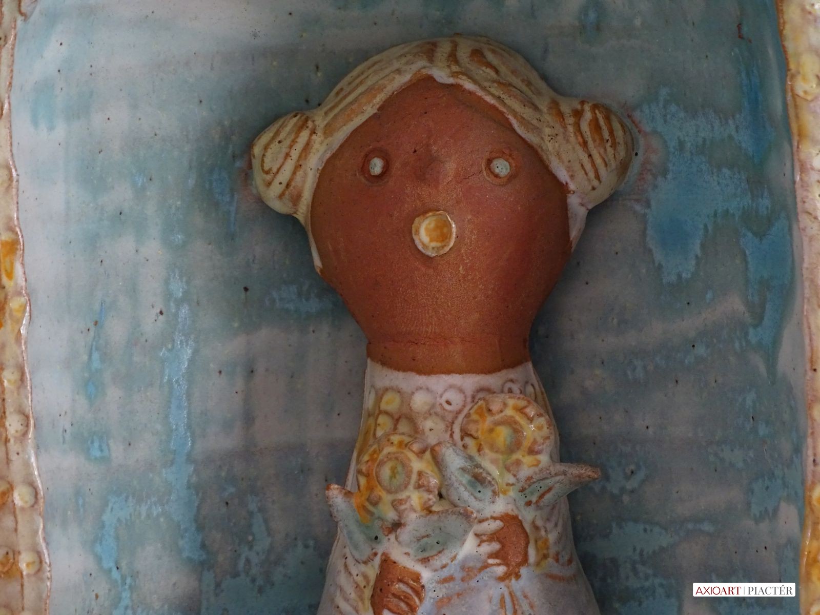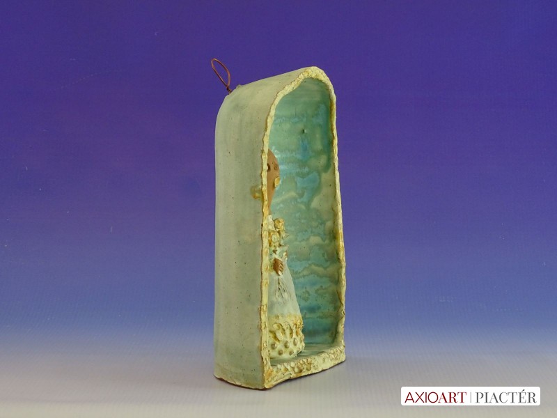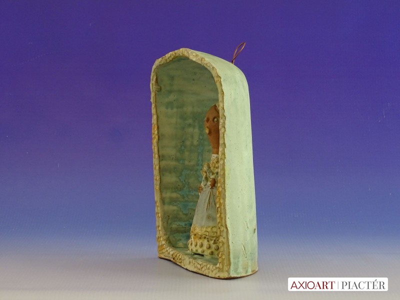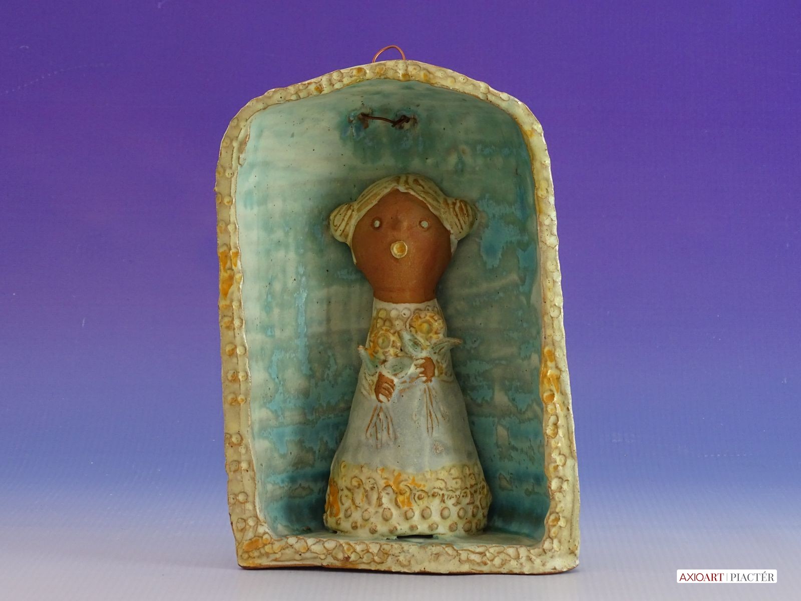 [0I400/BX-9] Hibátlan állapotú, jelzett Kiss Roóz fali kerámia, kisplasztika, falra akasztási lehetőséggel. Alján jelzés: KISS ROÓZ Magasság: 20 cm Szélesség: 13.7 cm Súly: 0.782 kg Kiss Roóz Ilona keramikus Születési hely: Szatmárnémeti [Satu Mare, RO] Születési dátum: 1920 Kiállítások az adatbázisban:  Kiss Roóz Ilona életműkiállítása Mesterei: Orbán Antal, Ohmann Béla. 1939-43: Iparművészeti Iskola, mesterei: Orbán Antal, Ohmann Béla. 1956, 1962: Munkácsy-díj; 1980: érdemes művész; 1984: SZOT-díj; 1994: MSZOSZ díja; 1995: Magyar Köztársasági Érdemrend Középkeresztje. A magyar kerámia Kovács Margit által teremtett naiv-népies irányzatának jeles művelője. Edényeit, kisplasztikáit, ill. murális alkotásait vidám színvilág és kedves humor jellemzi. 1948 és 1952 között tanított az Iparművészeti Főiskolán, azóta szabadfoglalkozású. Egyéni kiállítások 1966 • Csók Galéria, Budapest 1971 • Csók Galéria, Budapest 1980 • Budavári Ipaművészeti Bolt, Budapest 1984 • Petőfi Művelődési Ház, Tiszaluc 1989 • Kispréposti Palota, Eger (állandó kiállítás) 1992 • Bécs 1995 • Minigaléria, Miskolc 1996 • Petőfi Művelődési Ház, Tiszaluc 1997 • Derkovits Művelődési Központ, Tiszaújváros. Válogatott csoportos kiállítások 1947 • Karácsonyi kiállítás, Budapest • Fővárosi Művelődési Központ 1952 • Iparművészeti kiállítás, Ernst Múzeum, Budapest 1956 • Iparművészeti kiállítás, Iparművészeti Múzeum, Budapest 1958 • Magyar kerámia kiállítás, Vallauris 1959 • Magyar képzőművésznők kiállítása, Ernst Múzeum, Budapest 1959 • IV. Országos Iparművészeti Kiállítás, Műcsarnok, Budapest 1963 • Modern magyar kerámia, Royal Festival Hall, London 1965 • Országos Iparművészeti Kiállítás, Műcsarnok, Budapest 1968, 1970 • I., II. Országos Kerámia Biennálé, Pécs 1973 • Magyar kerámia, Ankara, Isztambul 1975 • Tárgy és alkotója, Iparművészeti Múzeum, Budapest 1982 • Magyar kézműves kerámia, Siklós 1995 • XX. századi magyar keramikusok, Iparművészeti Múzeum, Budapest • Az agyag mesterei, Vigadó Galéria, Budapest 1998 • Őszi Kerámia Kiállítás, Olaf Palme Ház, Budapest Művek közgyűjteményekben Köztéri művei kerámia dombormű (1958, Pereces, bölcsőde) kerámia napóra (1959, Székesfehérvár, Béke téri iskola) csempeburkolat (1961, Szeged, rendelőintézet) falikép (kerámia, 1962, Sopron, Gyermekszanatórium) kerámia falikép (1966, Békéscsaba, bölcsőde) Irodalom GÁL J.: ~ 77 éves. Beszélgetés a művésszel, Magyar Iparművészet, 1997/4. KESZTHELYI K.-LACZKÓ I.: A magyar kerámiaművészet I., Alkotók, adatok 1945-1998, Budapest, 1999. Vadas József + MAOE Forrás: artportal.hu