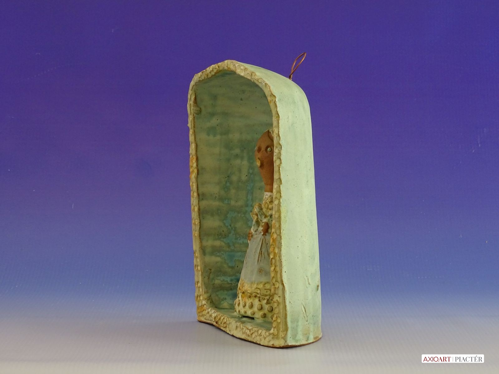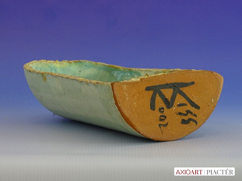 [0U704/BX-9] Hibátlan állapotú, jelzett, háromalakos kerámia figurális mécsestartó figura. Jelzés: KISS ROÓZ Magasság: 19 cm Szélesség: 6 cm Hosszúság: 16 cm Súly: 0.639 kg Kiss Roóz Ilona keramikus Születési hely: Szatmárnémeti [Satu Mare, RO] Születési dátum: 1920 Kiállítások az adatbázisban:  Kiss Roóz Ilona életműkiállítása Mesterei: Orbán Antal, Ohmann Béla. 1939-43: Iparművészeti Iskola, mesterei: Orbán Antal, Ohmann Béla. 1956, 1962: Munkácsy-díj; 1980: érdemes művész; 1984: SZOT-díj; 1994: MSZOSZ díja; 1995: Magyar Köztársasági Érdemrend Középkeresztje. A magyar kerámia Kovács Margit által teremtett naiv-népies irányzatának jeles művelője. Edényeit, kisplasztikáit, ill. murális alkotásait vidám színvilág és kedves humor jellemzi. 1948 és 1952 között tanított az Iparművészeti Főiskolán, azóta szabadfoglalkozású. Egyéni kiállítások 1966 • Csók Galéria, Budapest 1971 • Csók Galéria, Budapest 1980 • Budavári Ipaművészeti Bolt, Budapest 1984 • Petőfi Művelődési Ház, Tiszaluc 1989 • Kispréposti Palota, Eger (állandó kiállítás) 1992 • Bécs 1995 • Minigaléria, Miskolc 1996 • Petőfi Művelődési Ház, Tiszaluc 1997 • Derkovits Művelődési Központ, Tiszaújváros. Válogatott csoportos kiállítások 1947 • Karácsonyi kiállítás, Budapest • Fővárosi Művelődési Központ 1952 • Iparművészeti kiállítás, Ernst Múzeum, Budapest 1956 • Iparművészeti kiállítás, Iparművészeti Múzeum, Budapest 1958 • Magyar kerámia kiállítás, Vallauris 1959 • Magyar képzőművésznők kiállítása, Ernst Múzeum, Budapest 1959 • IV. Országos Iparművészeti Kiállítás, Műcsarnok, Budapest 1963 • Modern magyar kerámia, Royal Festival Hall, London 1965 • Országos Iparművészeti Kiállítás, Műcsarnok, Budapest 1968, 1970 • I., II. Országos Kerámia Biennálé, Pécs 1973 • Magyar kerámia, Ankara, Isztambul 1975 • Tárgy és alkotója, Iparművészeti Múzeum, Budapest 1982 • Magyar kézműves kerámia, Siklós 1995 • XX. századi magyar keramikusok, Iparművészeti Múzeum, Budapest • Az agyag mesterei, Vigadó Galéria, Budapest 1998 • Őszi Kerámia Kiállítás, Olaf Palme Ház, Budapest Művek közgyűjteményekben Köztéri művei kerámia dombormű (1958, Pereces, bölcsőde) kerámia napóra (1959, Székesfehérvár, Béke téri iskola) csempeburkolat (1961, Szeged, rendelőintézet) falikép (kerámia, 1962, Sopron, Gyermekszanatórium) kerámia falikép (1966, Békéscsaba, bölcsőde) Irodalom GÁL J.: ~ 77 éves. Beszélgetés a művésszel, Magyar Iparművészet, 1997/4. KESZTHELYI K.-LACZKÓ I.: A magyar kerámiaművészet I., Alkotók, adatok 1945-1998, Budapest, 1999. Vadas József + MAOE Forrás: artportal.hu