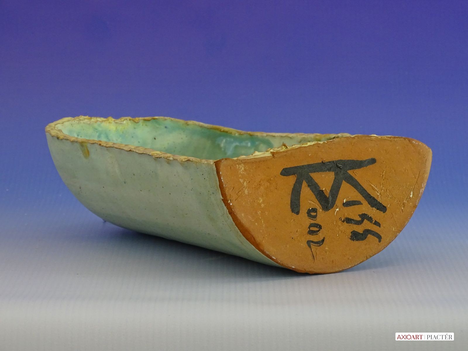 [1S294/Z059] Jelzett Kis Roóz Ilona kerámia figura. Felső peremén néhány kisebb elfestett lepattanás található, lásd fotó. Alján jelzés: KISS ROÓZ Magasság: 12.5 cm Szélesség: 11 cm Súly: 0.485 kg Kiss Roóz Ilona keramikus Születési hely: Szatmárnémeti [Satu Mare, RO] Születési dátum: 1920 Kiállítások az adatbázisban:  Kiss Roóz Ilona életműkiállítása Mesterei: Orbán Antal, Ohmann Béla. 1939-43: Iparművészeti Iskola, mesterei: Orbán Antal, Ohmann Béla. 1956, 1962: Munkácsy-díj; 1980: érdemes művész; 1984: SZOT-díj; 1994: MSZOSZ díja; 1995: Magyar Köztársasági Érdemrend Középkeresztje. A magyar kerámia Kovács Margit által teremtett naiv-népies irányzatának jeles művelője. Edényeit, kisplasztikáit, ill. murális alkotásait vidám színvilág és kedves humor jellemzi. 1948 és 1952 között tanított az Iparművészeti Főiskolán, azóta szabadfoglalkozású. Egyéni kiállítások 1964 ? Katona József Múzeum, Kecskemét 1973 ? Derkovits Galéria, Szombathely 1977 ? Csepel Vas és Fémművek, Budapest 1981 ? Kaesz Gyula Szakmunkásképző Intézet, Budapest 1983 ? Nógrádi Sándor Múzeum, Salgótarján 1987 ? Petőfi Művelődési Ház, Tiszaluc 1994 ? Petőfi Művelődési Ház, Tiszaluc 1995 ? Csók Galéria, Budapest [Pannonhalmi Zsuzsával és Sarkantyu Judittal] Válogatott csoportos kiállítások 1952 ? Iparművészeti kiállítás, Ernst Múzeum, Budapest IV. Országos Iparművészeti Kiállítás, Műcsarnok, Budapest Országos Iparművészeti Kiállítás, Műcsarnok, Budapest I., II. Országos Kerámia Biennálé, Pécs Magyar kerámia, Ankara, Isztambul XX. századi magyar keramikusok, Iparművészeti Múzeum, Budapest ? Az agyag mesterei, Vigadó Galéria, Budapest Őszi Kerámia Kiállítás, Olaf Palme Ház, Budapest Művek közgyűjteményekben Déri Múzeum, Debrecen ? Iparművészeti Múzeum, Budapest ? Janus Pannonius Múzeum, Pécs ? Kispréposti Palota, önálló gyűjtemény, Eger. Köztéri művei kerámia dombormű (1958, Pereces, bölcsőde) kerámia napóra (1959, Székesfehérvár, Béke téri iskola) csempeburkolat (1961, Szeged, rendelőintézet) falikép (kerámia, 1962, Sopron, Gyermekszanatórium) kerámia falikép (1966, Békéscsaba, bölcsőde) Irodalom GÁL J.: ~ 77 éves. Beszélgetés a művésszel, Magyar Iparművészet, 1997/4. KESZTHELYI K.-LACZKÓ I.: A magyar kerámiaművészet I., Alkotók, adatok 1945-1998, Budapest, 1999. Vadas József + MAOE Forrás: artportal