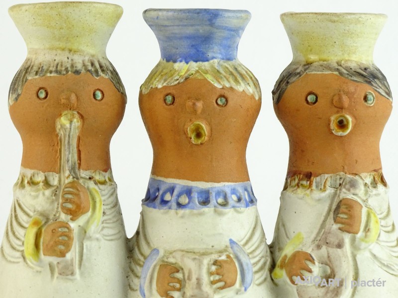 Hibátlan állapotú, három alakos, jelzett kerámia figurális gyertyatartó.