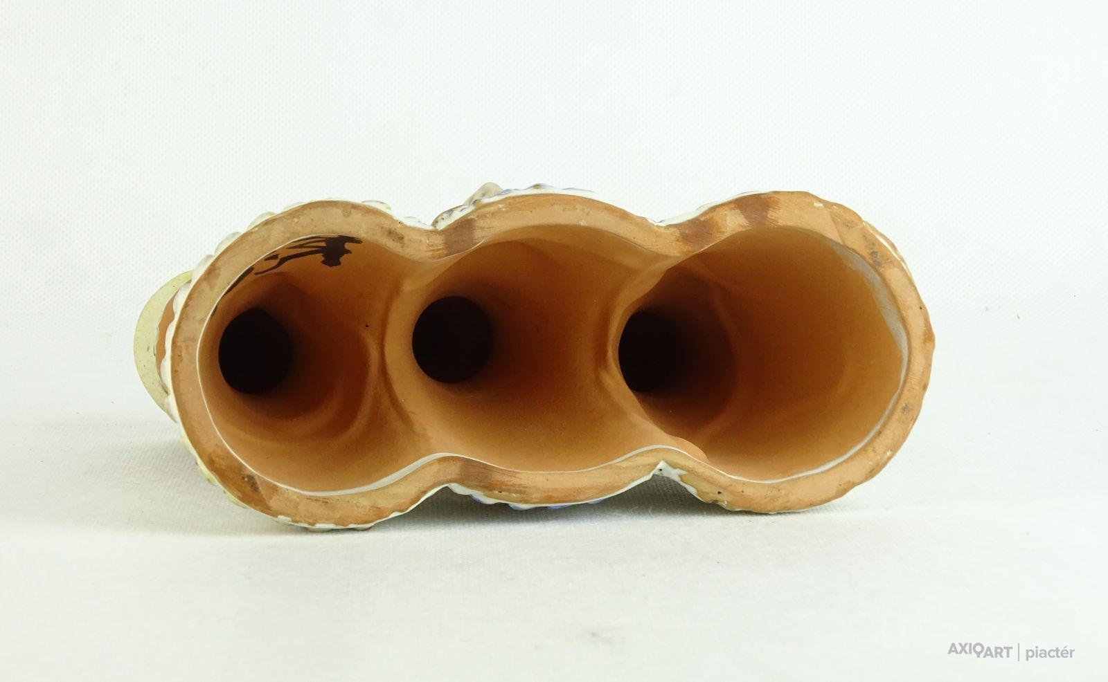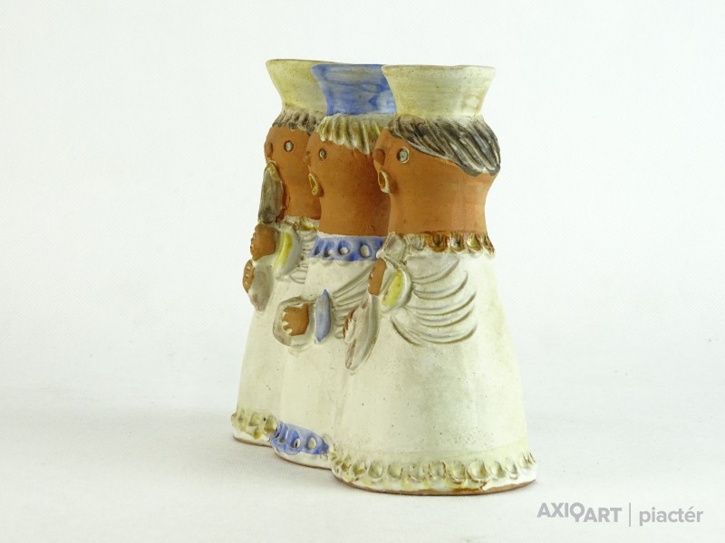 [0U704/BX-9] Hibátlan állapotú, jelzett, háromalakos kerámia figurális mécsestartó figura. Jelzés: KISS ROÓZ Magasság: 19 cm Szélesség: 6 cm Hosszúság: 16 cm Súly: 0.639 kg Kiss Roóz Ilona keramikus Születési hely: Szatmárnémeti [Satu Mare, RO] Születési dátum: 1920 Kiállítások az adatbázisban:  Kiss Roóz Ilona életműkiállítása Mesterei: Orbán Antal, Ohmann Béla. 1939-43: Iparművészeti Iskola, mesterei: Orbán Antal, Ohmann Béla. 1956, 1962: Munkácsy-díj; 1980: érdemes művész; 1984: SZOT-díj; 1994: MSZOSZ díja; 1995: Magyar Köztársasági Érdemrend Középkeresztje. A magyar kerámia Kovács Margit által teremtett naiv-népies irányzatának jeles művelője. Edényeit, kisplasztikáit, ill. murális alkotásait vidám színvilág és kedves humor jellemzi. 1948 és 1952 között tanított az Iparművészeti Főiskolán, azóta szabadfoglalkozású. Egyéni kiállítások 1966 • Csók Galéria, Budapest 1971 • Csók Galéria, Budapest 1980 • Budavári Ipaművészeti Bolt, Budapest 1984 • Petőfi Művelődési Ház, Tiszaluc 1989 • Kispréposti Palota, Eger (állandó kiállítás) 1992 • Bécs 1995 • Minigaléria, Miskolc 1996 • Petőfi Művelődési Ház, Tiszaluc 1997 • Derkovits Művelődési Központ, Tiszaújváros. Válogatott csoportos kiállítások 1947 • Karácsonyi kiállítás, Budapest • Fővárosi Művelődési Központ 1952 • Iparművészeti kiállítás, Ernst Múzeum, Budapest 1956 • Iparművészeti kiállítás, Iparművészeti Múzeum, Budapest 1958 • Magyar kerámia kiállítás, Vallauris 1959 • Magyar képzőművésznők kiállítása, Ernst Múzeum, Budapest 1959 • IV. Országos Iparművészeti Kiállítás, Műcsarnok, Budapest 1963 • Modern magyar kerámia, Royal Festival Hall, London 1965 • Országos Iparművészeti Kiállítás, Műcsarnok, Budapest 1968, 1970 • I., II. Országos Kerámia Biennálé, Pécs 1973 • Magyar kerámia, Ankara, Isztambul 1975 • Tárgy és alkotója, Iparművészeti Múzeum, Budapest 1982 • Magyar kézműves kerámia, Siklós 1995 • XX. századi magyar keramikusok, Iparművészeti Múzeum, Budapest • Az agyag mesterei, Vigadó Galéria, Budapest 1998 • Őszi Kerámia Kiállítás, Olaf Palme Ház, Budapest Művek közgyűjteményekben Köztéri művei kerámia dombormű (1958, Pereces, bölcsőde) kerámia napóra (1959, Székesfehérvár, Béke téri iskola) csempeburkolat (1961, Szeged, rendelőintézet) falikép (kerámia, 1962, Sopron, Gyermekszanatórium) kerámia falikép (1966, Békéscsaba, bölcsőde) Irodalom GÁL J.: ~ 77 éves. Beszélgetés a művésszel, Magyar Iparművészet, 1997/4. KESZTHELYI K.-LACZKÓ I.: A magyar kerámiaművészet I., Alkotók, adatok 1945-1998, Budapest, 1999. Vadas József + MAOE Forrás: artportal.hu