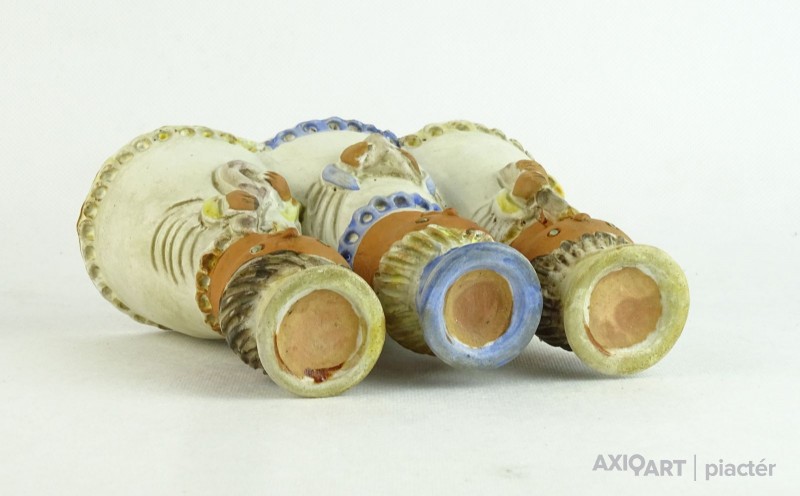 [0L825/BX-9] Hibátlan állapotú, három alakos, jelzett kerámia figurális gyertyatartó. Jelzés: KISS ROÓZ Magasság: 16.5 cm Szélesség: 8 cm Hosszúság: 19.5 cm Súly: 0.818 kg Kiss Roóz Ilona keramikus Születési hely: Szatmárnémeti [Satu Mare, RO] Születési dátum: 1920 Kiállítások az adatbázisban:  Kiss Roóz Ilona életműkiállítása Mesterei: Orbán Antal, Ohmann Béla. 1939-43: Iparművészeti Iskola, mesterei: Orbán Antal, Ohmann Béla. 1956, 1962: Munkácsy-díj; 1980: érdemes művész; 1984: SZOT-díj; 1994: MSZOSZ díja; 1995: Magyar Köztársasági Érdemrend Középkeresztje. A magyar kerámia Kovács Margit által teremtett naiv-népies irányzatának jeles művelője. Edényeit, kisplasztikáit, ill. murális alkotásait vidám színvilág és kedves humor jellemzi. 1948 és 1952 között tanított az Iparművészeti Főiskolán, azóta szabadfoglalkozású. Egyéni kiállítások 1966 • Csók Galéria, Budapest 1971 • Csók Galéria, Budapest 1980 • Budavári Ipaművészeti Bolt, Budapest 1984 • Petőfi Művelődési Ház, Tiszaluc 1989 • Kispréposti Palota, Eger (állandó kiállítás) 1992 • Bécs 1995 • Minigaléria, Miskolc 1996 • Petőfi Művelődési Ház, Tiszaluc 1997 • Derkovits Művelődési Központ, Tiszaújváros. Válogatott csoportos kiállítások 1947 • Karácsonyi kiállítás, Budapest • Fővárosi Művelődési Központ 1952 • Iparművészeti kiállítás, Ernst Múzeum, Budapest 1956 • Iparművészeti kiállítás, Iparművészeti Múzeum, Budapest 1958 • Magyar kerámia kiállítás, Vallauris 1959 • Magyar képzőművésznők kiállítása, Ernst Múzeum, Budapest 1959 • IV. Országos Iparművészeti Kiállítás, Műcsarnok, Budapest 1963 • Modern magyar kerámia, Royal Festival Hall, London 1965 • Országos Iparművészeti Kiállítás, Műcsarnok, Budapest 1968, 1970 • I., II. Országos Kerámia Biennálé, Pécs 1973 • Magyar kerámia, Ankara, Isztambul 1975 • Tárgy és alkotója, Iparművészeti Múzeum, Budapest 1982 • Magyar kézműves kerámia, Siklós 1995 • XX. századi magyar keramikusok, Iparművészeti Múzeum, Budapest • Az agyag mesterei, Vigadó Galéria, Budapest 1998 • Őszi Kerámia Kiállítás, Olaf Palme Ház, Budapest Művek közgyűjteményekben Köztéri művei kerámia dombormű (1958, Pereces, bölcsőde) kerámia napóra (1959, Székesfehérvár, Béke téri iskola) csempeburkolat (1961, Szeged, rendelőintézet) falikép (kerámia, 1962, Sopron, Gyermekszanatórium) kerámia falikép (1966, Békéscsaba, bölcsőde) Irodalom GÁL J.: ~ 77 éves. Beszélgetés a művésszel, Magyar Iparművészet, 1997/4. KESZTHELYI K.-LACZKÓ I.: A magyar kerámiaművészet I., Alkotók, adatok 1945-1998, Budapest, 1999. Vadas József + MAOE Forrás: artportal.hu
