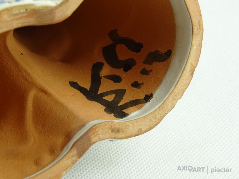 [1S294/Z059] Jelzett Kis Roóz Ilona kerámia figura. Felső peremén néhány kisebb elfestett lepattanás található, lásd fotó. Alján jelzés: KISS ROÓZ Magasság: 12.5 cm Szélesség: 11 cm Súly: 0.485 kg Kiss Roóz Ilona keramikus Születési hely: Szatmárnémeti [Satu Mare, RO] Születési dátum: 1920 Kiállítások az adatbázisban:  Kiss Roóz Ilona életműkiállítása Mesterei: Orbán Antal, Ohmann Béla. 1939-43: Iparművészeti Iskola, mesterei: Orbán Antal, Ohmann Béla. 1956, 1962: Munkácsy-díj; 1980: érdemes művész; 1984: SZOT-díj; 1994: MSZOSZ díja; 1995: Magyar Köztársasági Érdemrend Középkeresztje. A magyar kerámia Kovács Margit által teremtett naiv-népies irányzatának jeles művelője. Edényeit, kisplasztikáit, ill. murális alkotásait vidám színvilág és kedves humor jellemzi. 1948 és 1952 között tanított az Iparművészeti Főiskolán, azóta szabadfoglalkozású. Egyéni kiállítások 1964 ? Katona József Múzeum, Kecskemét 1973 ? Derkovits Galéria, Szombathely 1977 ? Csepel Vas és Fémművek, Budapest 1981 ? Kaesz Gyula Szakmunkásképző Intézet, Budapest 1983 ? Nógrádi Sándor Múzeum, Salgótarján 1987 ? Petőfi Művelődési Ház, Tiszaluc 1994 ? Petőfi Művelődési Ház, Tiszaluc 1995 ? Csók Galéria, Budapest [Pannonhalmi Zsuzsával és Sarkantyu Judittal] Válogatott csoportos kiállítások 1952 ? Iparművészeti kiállítás, Ernst Múzeum, Budapest IV. Országos Iparművészeti Kiállítás, Műcsarnok, Budapest Országos Iparművészeti Kiállítás, Műcsarnok, Budapest I., II. Országos Kerámia Biennálé, Pécs Magyar kerámia, Ankara, Isztambul XX. századi magyar keramikusok, Iparművészeti Múzeum, Budapest ? Az agyag mesterei, Vigadó Galéria, Budapest Őszi Kerámia Kiállítás, Olaf Palme Ház, Budapest Művek közgyűjteményekben Déri Múzeum, Debrecen ? Iparművészeti Múzeum, Budapest ? Janus Pannonius Múzeum, Pécs ? Kispréposti Palota, önálló gyűjtemény, Eger. Köztéri művei kerámia dombormű (1958, Pereces, bölcsőde) kerámia napóra (1959, Székesfehérvár, Béke téri iskola) csempeburkolat (1961, Szeged, rendelőintézet) falikép (kerámia, 1962, Sopron, Gyermekszanatórium) kerámia falikép (1966, Békéscsaba, bölcsőde) Irodalom GÁL J.: ~ 77 éves. Beszélgetés a művésszel, Magyar Iparművészet, 1997/4. KESZTHELYI K.-LACZKÓ I.: A magyar kerámiaművészet I., Alkotók, adatok 1945-1998, Budapest, 1999. Vadas József + MAOE Forrás: artportal