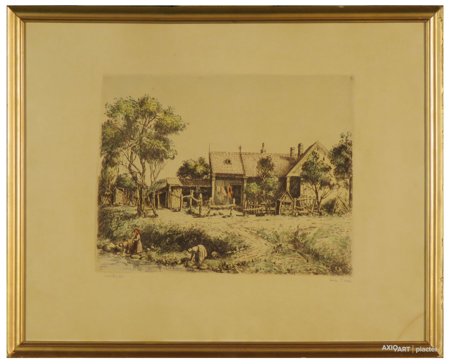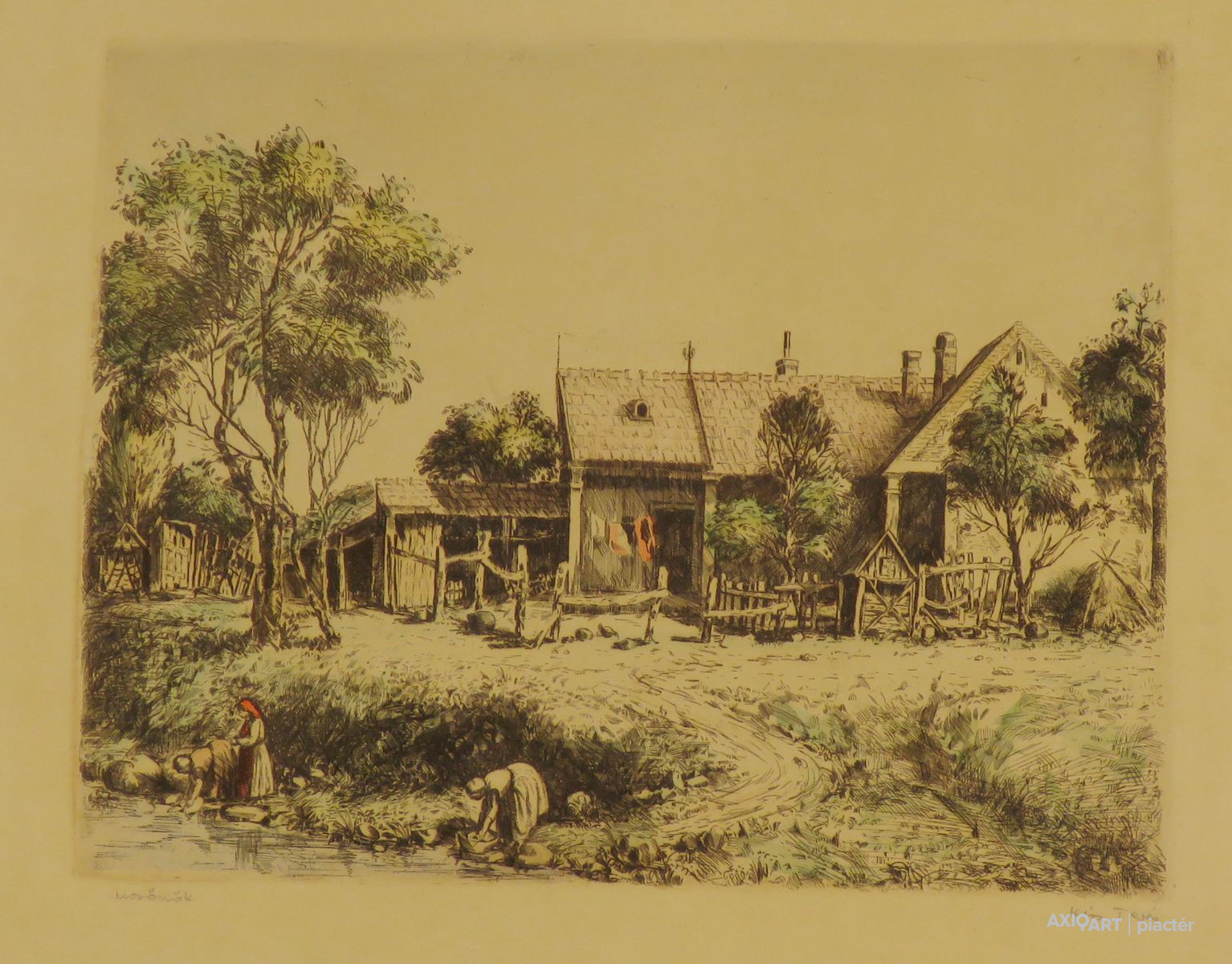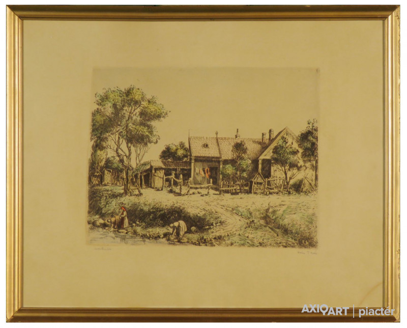 [FKB844/Bp40/44] A kép mérete: 24 x 31 cm keret nélkül. Készült: Színes rézkarc, Papír A kép Kiss Terézia (Vecsés, 1928) alkotása. Jelezve lent "Mosónők, Kiss Teréz (ceruzával)" A festmény jó állapotban van. Keret: Sérült Magyar festők és grafikusok életrajzi lexikona I-II. Festő és grafikus. A budapesti Képzőművészeti Főiskolán Berény Róbert és Domanovszky Endre voltak a mesterei. Tanulmányúton járt Olasz-, Francia- és Spanyolországban. Lírai hangvételű és természetelvű művész. Vízfestményekkel és kisgrafikákkal is foglalkozik. (MÉ) Magyar festők és grafikusok adattára 1948-1953-ban végzett a főiskolán Berény Róbert és Domanovszky Endre növendékeként. Tanulmányúton Olasz-, Francia- és Spanyolországban járt. 1966-ban önálló kiállítással mutatkozott be. - Lírai hangvételű, természetelvű művész. Vízfestményekkel, kisgrafikákkal is foglalkozik. - Irod.: P. Sz. T.: Művész életrajzok. Bp. 1985. Magyar festők és grafikusok életrajzi lexikona I-II. Műgyűjtők és kereskedők kézikönyve Festő és grafikus. A bp.-i Képzőművészeti Főiskolán Berény Róbert és Domanovszky Endre voltak a mesterei. Tanulmányúton járt Olasz-, Francia- és Spanyolországban. Lírai hangvételű és természetelvű művész. Vízfestményekkel és kisgrafikákkal is foglalkozik. (MÉ) Művész életrajzok kortárs magyar képzőművészek 1953-ban végzett a Képzőművészeti Főiskolán Berény Róbert és Domanovszky Endre növendékeként. Tanulmányúton Olasz-, Francia- és Spanyolországban járt. Csoportos kiállítások mellet 1966-ban és 1978-ban Budapesten, 1977-ben Simontornyán voltak önálló kiállításai. - Lírai hangvételű, természetelvű művész, kedvelt műfaja a tájkép és a figurális kompozíció. Akvarellel, kisgrafikával is foglalkozik.