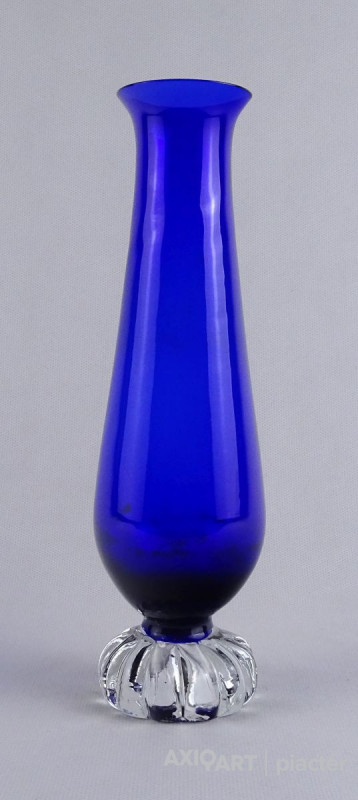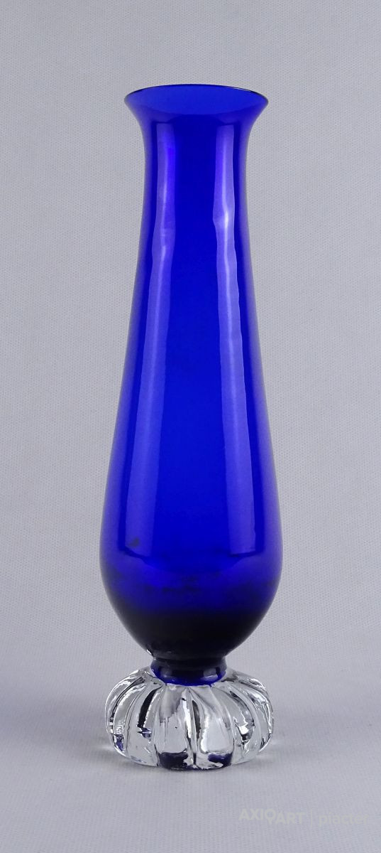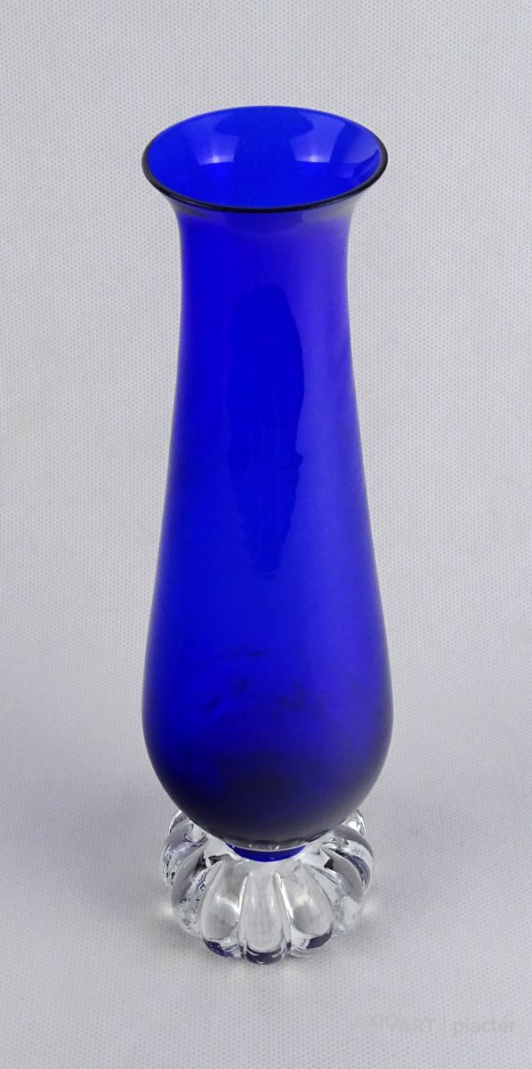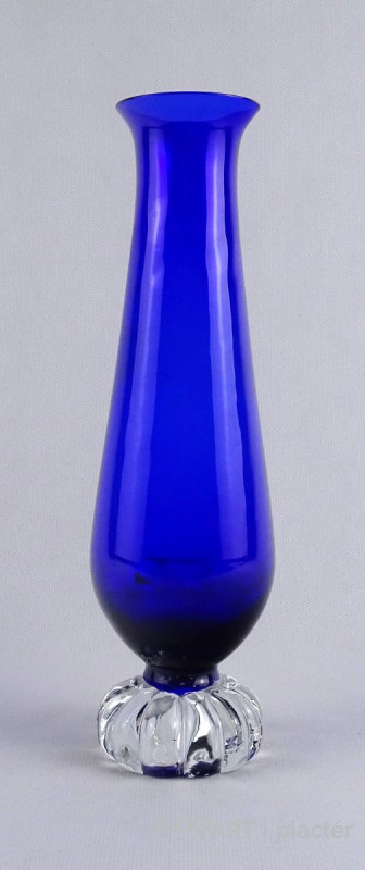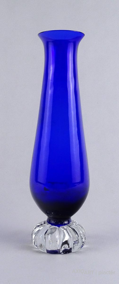 [1O212/Z046] Hibátlan állapotú, színezett fúvott üveg váza, talpas üveg váza vagy üveg kupa. Skandináv design üveg. Talpán a fúvás szakítás nyoma szépen kivehető. Magasság: 14 cm Szélesség: 6.5 cm Súly: 0.215 kg Erik Höglund  Ugrás a navigációhozUgrás a kereséshez A papról (1902–1971) lásd Erik Höglund (pap) . Erik Höglund Született 1932. január 31. Karlskrona , Blekinge megye Halál 1998. január 27. (65 éves) Maria Magdalena plébánia , Stockholm Állampolgárság svéd Foglalkozás/megbízás Tervező, művész Ismert Tervezés Koszta Boda számára Feleség Maerit Levin (sz. 1953–1967; elvált) Ingrid Höglund (sz. 1974–1998; halála) Partner Monica Backström (partner 1968-1972) Rokonok Anna Höglund (lánya) Erika Höglund (lánya) Albin Höglund (fia)  Erik Sylvester Höglund , 1932. január 31-én született Karlskronában , 1998. január 27-én halt meg a stockholmi Maria Magdalena plébánián , svéd szobrász , festő , grafikus és üvegművész . Életrajz  Erik Höglund Torsten Höglund és Jenny Jonsson könyvelő fia, valamint Tore Enar Höglund szobrász és grafikus öccse volt . Tanulmányait a stockholmi Konstfackban végezte , először dekorfestészetet Fritz Sjöströmnek , majd szobrászatot Robert Nilssonnak , végül 1951–1952-ben Harald Sallbergnek grafikát . Erik Rosén , a Boda Üveggyár 1953 és 1973 között dolgozó tervezője fogadta be , és ez idő alatt jött el, hogy átalakítsa a svéd műüveggyártást az üvegtermékek kinézetére vonatkozó új ötletek bevezetésével. Ösztöndíja többek között metszetekkel kapcsolatban, a színek és a földes, aszimmetrikus dizájn sikeres lett a külpiacon. Bodán töltött ideje alatt fenyővel, vasalással és bútorokkal is foglalkozott. Később más üveggyárakkal is együttműködött, például a Pukeberggel , a Lindshammarral és a Studioglas Strömbergshyttannal . 1968-ban Monica Backström üvegművésszel megalapította a Backström & Höglund Design AB formatervező céget, amely bútorok, háztartási eszközök és használati tárgyak tervezésével foglalkozik. Höglund tagja volt a Vet Hut AB-nek is, amelyet 1971-ben alapított a Boda glasbruk tíz tervezője szokásos munkájuk mellett: Erik Höglund, Monica Backström, Ann Wolff , Göran Wärff , Bertil Vallien , Ulrica Hydman-Vallien , Per Arne. Lundahl, Liselotte Jörgensdotter, Gunhild Sinnemark és Rolf Sinnemark . Erik Höglund szobrászként számos köztéri dekorációt készített különféle anyagokból, köztük téglából és betonból. Ezt követően gyakran dolgozott együtt olyan építészekkel, mint Jon Höjer a Höjer & Ljungqvistnél , Bengt Gate és Lars Ågren .  Kiállítás  A stockholmi Palmcrantzska gyárban korábban Ulf G. Lindén állandó kiállítása volt Erik Höglund alkotásaival. Ezt a gyűjteményt 2009 szeptemberében a karlskronai Blekinge Múzeumnak adományozták.  Közművek válogatásban  Két állat és egy játék (1966), gránit, Bredängs Torg Stockholmban. Fiskargumman a karlskronai halpiacon. Négyzet alakú oszlop Gävle-ben Erik Höglund mintegy 150 köztéri dekorációt készített üvegből, bronzból, kovácsolásból, téglából, gránitból és betonból. Kerékpárosok I (1956), bronz, a trelleborgi oktatási intézmény Kerékpárosok II (1957), bronz, a karlskogai oktatási intézmény Kerékpárosok III (1957), bronz, stockholmi Hökarängens iskola Az élő szó (1958), festmény a nybrói városi könyvtárban Kerékpárosok IV (1958), bronz, Handverkstorget Sandvikenben Kerékpárosok V (1959), Sjöboskolan, Borås Falfestmény üvegablak (1962) a borgholmi templomban Kristallglasskogen (1964), üvegmozaik fal, Ellagårdsskolan Täby községben A tudás fája (1966), vasműves és üveg, Folkets Hus Nybroban Állatszobrok (1964-67), gránit, Hallsberg Két állat és egy játék (1966), gránit, Bredängs torg Stockholmban Tó szökőkúttal (1967), gránit, Trelleborg Ülő terhes nő (1971), bronz, Haganässkolan Älmhultban Hajó halászokkal (1972), vas, üveg és fa, Hotel Witt Kalmarban Négyzet alakú oszlop (1971-74), beton, Stortorget Gävle -ben A súlyemelő (1974), bronz, az östersundi sportcsarnok Gyűrűk a vízen (1976-77), bronz, Rödeby Torg , Karlskrona önkormányzat Az élet játéka , tégladomborműves fal és régi érmék , üveg, mindkettő 1979–1980, Sparbanken Linköpingben Úszók (1980), kovácsoltvas, úszócsarnok Rödebyben , Karlskrona önkormányzat Cirkuszgömb (1980-81), kovácsoltvas, Kristianstad megyei tanács Fiskargumman (1981-82), bronz, halpiac Karlskronában Az olvasócsalád (1983), bronz és üveg, Kalmár Városi Könyvtár Életmentő (1985), réz, úszócsarnok Haganässkolanban Älmhultban Dans bort i vägen (1985), bronz, Torsås volt Anya és gyermeke , bronz, Trelleborg A büszke apa és Két ember , bronz, Eskadern lakónegyed Linköpingben Játssz szobrot téglából, Lönneberga óvoda, Norra Fäladen Lundban  Forrás: wikipédia