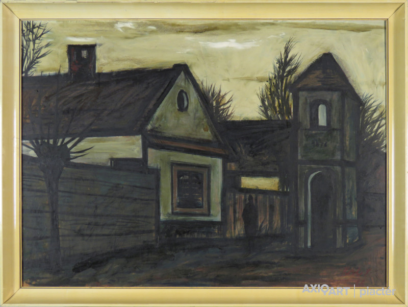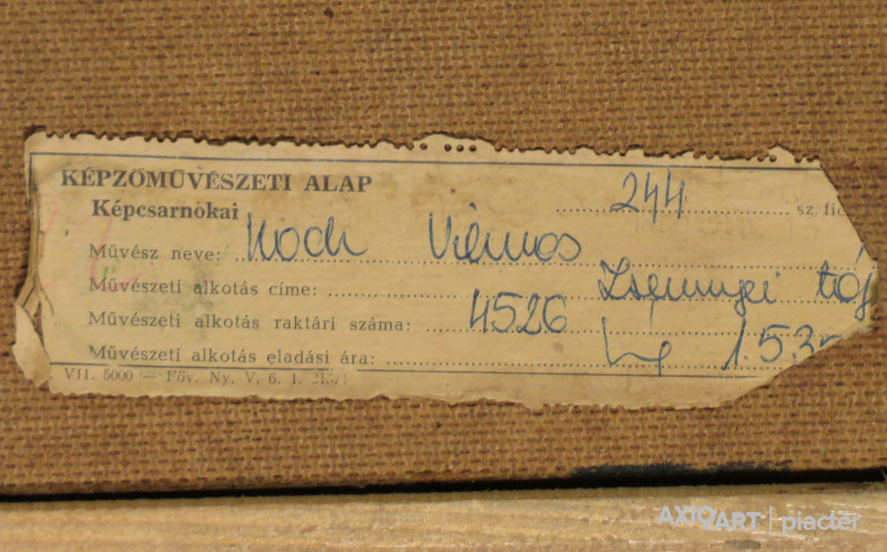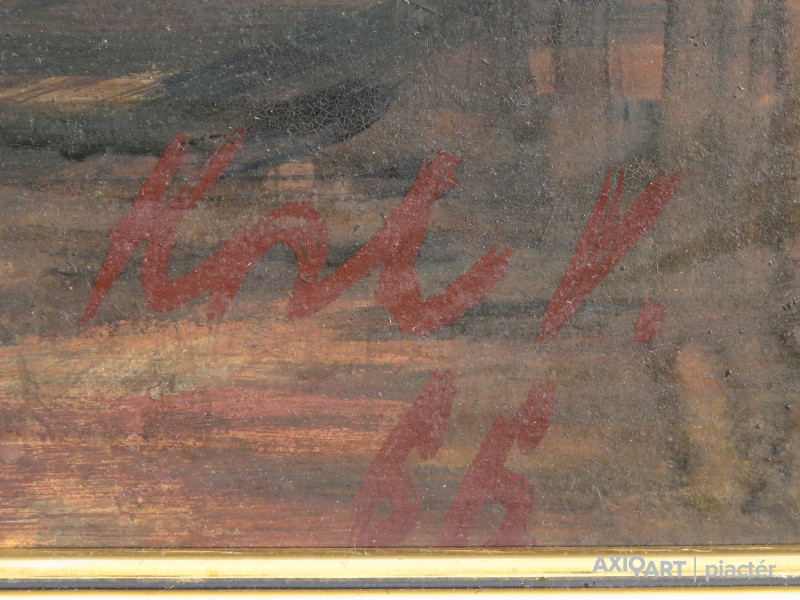 [FKC638/FL-4] A kép mérete: 59 x 80 cm keret nélkül. Készült: Olaj, Farostlemez A kép Koch Vilmos (Budapest, 1927) alkotása. Jelezve jobbra lent "Koch V. 66" A festmény jó állapotban van. Keret: Ép A festmény hátoldalán a Képcsarnok vállalat raglapja található. Magyar festők és grafikusok életrajzi lexikona I-II. Festő. Dobrovszky László szabadiskolájában kezdett festeni. Tanulmányúton járt kelet-európai országokban, Francia- és Olaszországban. Budapesten él, nyaranta zsennyei műtermében dolgozik. Több hazai csoportos (Nemzeti Szalon, Ernst Múzeum, Műcsarnok, 1960-65 között Stúdió kiállítások, Magyar Nemzeti Galéria, Szeged, Szolnok, Csepel) és egyéni (Kulturális Kapcsolatok Intézete, Rákosliget, Miskolc, Szekszárd, Szolnok, Zalaegerszeg, Kaposvár, stb.) bemutatókon szerepelt. Többnyire dekoratív hatású város- és tájképeket, valamint figurális műveket fet. Munkái helyet kaptak a Magyar Nemzeti Galériában és a szolnoki képtárban. (LÁ, MÉ) Magyar festők és grafikusok életrajzi lexikona I-II. Műgyűjtők és kereskedők kézikönyve Festő. Dobrovszky László szabadiskolájában kezdett festeni. Tanulmányúton járt kelet-európai országokban, Francia- és Olaszországban. Több hazai csoportos és egyéni kiállításon szerepelt (Kulturális Kapcsolatok Intézete, Miskolc, Szekszárd, stb.). Főleg dekoratív hatású város- és tájképeket, vallásos figurális műveket fest. (MÉ) Magyar festők és grafikusok adattára Jogi tanulmányok után Dombrovszky László szabadiskolájában kezdte festeni. Tanulmányúton Olasz- és Franciaországban, valamint Csehszlovákiában és Lengyelországban járt. Számos csoportos kiállítás után 1966-ban a Kulturális Kapcsolatok Intézetében, 1973-ban Miskolcon, 1976-ban Szekszárdon állított ki. Főleg dekoratív hatású város- és tájképeket, valamint figurális műveket fest. - P.Sz.T.: Művész életrajzok. Bp. 1985. Művész életrajzok kortárs magyar képzőművészek Jogi tanulmányok után Dombrovszky László szabadiskolájában kezdett el festeni. Tanulmányúton Olasz- és Franciaországban, valamint Csehszlovákiában és Lengyelországban járt. 1957 óta szerepel nyilvánosság előtt; egyéni tárlata 1966-ban a Kulturális Kapcsolatok Intézetében, 1973-ban Miskolcon, 1976-ban Szekszárdon, 1980-ban Kaposvárott, 1982-ben Szolnokon, 1984-ben Zalaegerszegen volt. - Városképeket, tájképeket és figurális kompozíciókat fest; munkáit hangsúlyozott kontúr és dekoratív színvilág, a motívumok konstruktív előadása jellemzi. Kortárs magyar művészeti lexikon I-III. Autodidakta, mestere: Domborvszky László: Tanulmányutak: 1964-ben Olaszország, 1965-ben Párizs. Budapesten él, nyaranta zsennyei műtermében dolgozik. Városképeket, tájképeket és figurális kompozíciókat fest, szerkesztett, dekoratív stílusban. Ek: 1966: KKI; 1968: Műv. H., Rákosliget; 1973: Szőnyi Terem, Miskolc; 1976: Szinyei Terem, Szekszárd; 1980: Vaszary T., Kaposvár; 1982: Aba Novák Terem, Szolnok; 1984: Kisfaludi Strobl Terem, Zalaegerszeg. Vcsk: 1957: Ifjúsági kiállítás, Nemzeti Szalon; 1960: Dolgozó emberek között, Ernst Múzeum; 8. Magyar Képzőművészeti kiállítás, Műcsarnok; 1960-65: Stúdiókiállítások; 1962: Dolgozó emberek között, Ernst Múzeum; 1967: Magyar festők Itáliában, Magyar Nemzeti Galéria; 1968: Országos Képzőművészeti kiállítás, Szeged; 1978, 1981: II., III. Képzőművészeti Triennálé, Szolnoki Galéria, Szolnok; 1985: Vizualart Alkotóközösség, Csepel. Mk: Damjanich János Múzeum, Szolnok; Magyar Nemzeti Galéria. Irod.: D. Fehér Zs.: Koch Vilmosról, MŰV, 1987/7.; Pellionisz V.: Koch Vilmos kiállítása, Új Tükör, 1980. márc. 7.