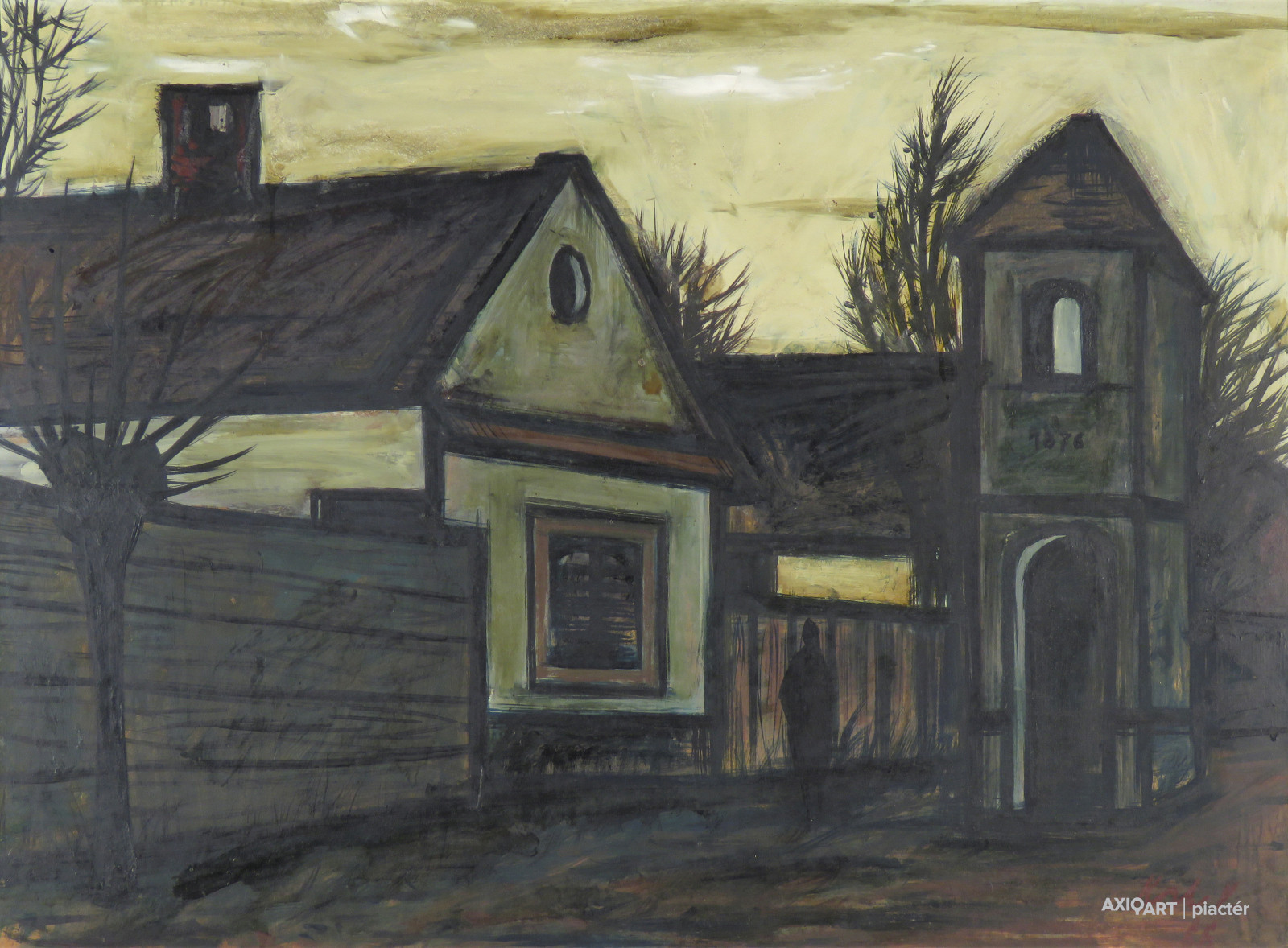 [FK3614/X178] A kép mérete: 50 x 90 cm keret nélkül. Készült: Olaj, Farost A kép Puskás Imre (Szeged, 1933) alkotása. Jelezve jobbra lent "Puskás I." A festmény jó állapotban van. Keret: Ép Hátoldalon autográf írással: 50x90 cm, olaj/farost Puskás Imre Magyar festők és grafikusok életrajzi lexikona I-II. Szeged, 1933 - Festő. A budapesti Iparművészeti Főiskolán végezte tanulmányait 1952-58. Z. Gács György, Rákosi Zoltán, Molnár Béla, Dudás Jenő tanítványa volt. Tanulmányait követően mint textiltervező tevékenykedett másfél évtizeden át. Közben szorgalmasan festette a Szeged környéki falusi, tanyasi világot. 1975 óta szerepel hazai és külhoni kiállításokon (Berlin, Frankfurt, München, New York, Tokió, Prága, Tihany, Veszprém, Miskolc, Nagykanizsa, Szeged, Nyíregyháza, Szombathely, Szolnok, Pécs stb.). Faliszőnyegeket, faliképeket, valamint kötött-anyag és női ruhanemű-terveket alkotott, igazi kifejezőeszköze azonban a festészet, mellyel a '70-es évek óta foglalkozik. Alkotásain a paraszti élet jelenik meg, a tanyasi házak, ezek udvarai, inkább széles ecsetvonásokkal, erős hangulati, érzelmi telítettséggel. (MÉ, Műv. 1971/1) Magyar festők és grafikusok adattára (Szeged, 1933 - ) Mint textiltervező az Iparművészeti Főiskolán tanult és másfél évtizeden át sikeresen dolgozott ezen a pályán. Közben festett is, mert a Szeged-környéki falusi, tanyasi világ táblaképbe kívánkozott. Festőként 1975 óta jelentkezik önálló kiállításokon s képein az alföldi paraszti élet jelenik meg, mindenekelőtt a tanyasi házak, ezek udvarai, többnyire széles ecsetvonásokkal, erős hangulati, érzelmi telítettséggel. Számos külföldi kiállításon szerepelt (Prága, Moszkva, Berlin, Frankfurt, München, New York, Tokió stb.). Egyéni kiállításai: Budapest, 1960, 1961, 1962, 1963, 1965, 1968, 1982, 1983, Tihany, Veszprém 1964, Miskolc, 1976, 1980, Nagykanizsa 1969, Szeged 1970, 1985, 1988, Szombathely 1970, Nyíregyháza 1973, Szolnok 1975, Pécs 1978, Békéscsaba, Bonyhád 1981. - Irod.: P. Sz. T.: Művész életrajzok. Bp. 1985. Magyar festők és grafikusok életrajzi lexikona I-II. Műgyűjtők és kereskedők kézikönyve Szeged, 1933 - Festő, A bp.-i Iparművészeti Főiskolán végezte tanulmányait. Később mint textiltervező dolgozott másfél évtizeden át. Közben festette a Szeged-környéki falusi, tanyasi világot, 1975 óta szerepel hazai és külföldi tárlatokon (Prága, Berlin, Frankfurt, München, New York, Tokio, Tihany, Veszprém, Miskolc, Nagykanizsa, Szeged, Szolnok, Nyíregyháza, Szombathely, Pécs, stb.). Alkotásain a paraszti élet jelenik meg, tanyasi házak, ezek udvarai, többnyire széles ecsetvonásokkal, erős hangulati, érzelmi telítettséggel. (MÉ) Művész életrajzok kortárs magyar képzőművészek Festő, Szeged, 1933 Mint textiltervező az Iparművészeti Főiskolán tanult s másfél évtizeden át sikeresen dolgozott ezen a pályán. Közben festett is, mert a Szeged-környéki falusi, tanyasi világ táblaképbe kívánkozott. Festőként 1975 óta jelentkezik önálló kiállításokon s képein az alföldi paraszti élet jelenik meg, mindenekelőtt a tanyai házak, ezek udvarai, többnyire széles ecsetvonásokkal, erős hangulati, érzelmi telítettséggel. Számos külföldi kiállításon szerepelt, (Prága, Moszkva, Berlin, Frankfurt, München, New York, Tokió stb.). - Egyéni kiállításai: Budapest, 1960, 1961, 1962, 1963, 1965, 1968, 1982, 1983, Tihany, Veszprém 1964, Miskolc 1967, 1980, Nagykanizsa 1969, Szeged, Szombathely 1970, Nyíregyháza 1973, Szolnok 1975, Pécs 1978, Békéscsaba, Bonyhád 1981. Egyéb Puskás Imre festő, textiltervező Születési hely: Szeged Születési dátum: 1933 Mesterei: Z. Gács György, Rákosi Zoltán, Molnár Béla, Dudás Jenő. 1952-58: Magyar Iparművészeti Főiskola (textiltervező szak), mesterei: Z. Gács György, Rákosi Zoltán, Molnár Béla, Dudás Jenő. Pályája első mintegy másfél évtizedében textiltervezéssel foglalkozott. Csőtűs technikával készített, ősi óceániai és kelet-európai motívumokat felhasználó faliszőnyegeket, faliképeket, valamint kötött-anyag és női ruhanemű-terveket alkotott. Igazi kifejezőeszköze azonban a festészet, amellyel a 70-es évek vége óta foglalkozik. Rendszeresen szerepelnek képei a Japánban rendezett csoportos kiállításokon. Képeinek fő témáit a Szeged környéki tanyák házacskáinak ábrázolásai, valamint a Tisza-parti táj sajátos hangulatát megragadó művei adják. Szívesen fest portékat jellegzetes paraszti karakterekről. Egyéni kiállítások 1970 • Képcsarnok, Szeged 1973 • Benczúr Terem, Nyíregyháza 1975 • Aba-Novák Terem, Szolnok 1980 • Szőnyi István Terem, Miskolc 1981 • Művelődési Központ, Bonyhád 1982 • Mednyánszky Terem, Budapest 1983 • Művelődési Ház, Tiszalúc 1984 • Gulácsy Terem, Szeged (leporelló) 1986 • Fórum Hotel Galéria, Budapest 1989 • Művelődési Ház, Veszprém 1993 • Derkovits Terem, Budapest 1997 • Művelődési Ház, Tiszalúc. Válogatott csoportos kiállítások 1959 • 4. Országos Iparművészeti Kiállítás, Műcsarnok, Budapest 1961 • Az Iparművészeti Vállalat Komplex Stúdiójának I. Textil Kiállítása, Csók István Galéria 1967 • A Kör iparművész csoport kiállítása, Szőnyi István Terem, Miskolc 1968 • Textil falikép, Ernst Múzeum, Budapest • A Kör iparművész csoport kiállítása, Ferencvárosi Pincetárlat, Budapest 1970 • I. Fal- és Tértextil Biennálé, Savaria Múzeum, Szombathely 1972 • Textil- és Ötvösbemutató, Csontváry Terem, Budapest 1976-1979 • Tokió 1982 • Kobe • Kiotó • Oita (JP) 1998 • Tokió. Irodalom KOCZOGH Á.: ~, Művészet, 1971/1. CSORBA M.: ~ festőművész kiállítása, Pesti Műsor, 1980. március 19. Gyulai Gergely 1993 • Der
