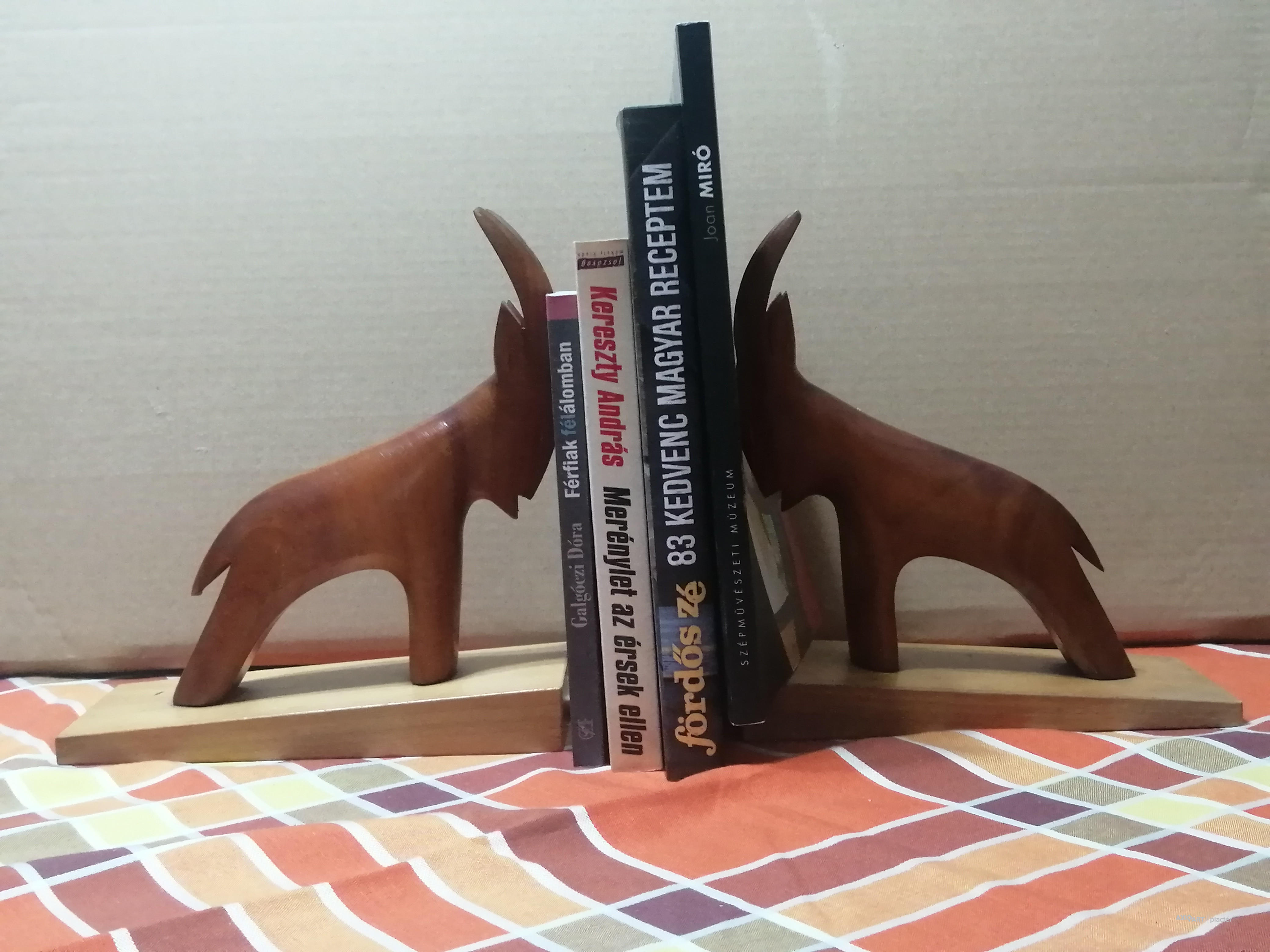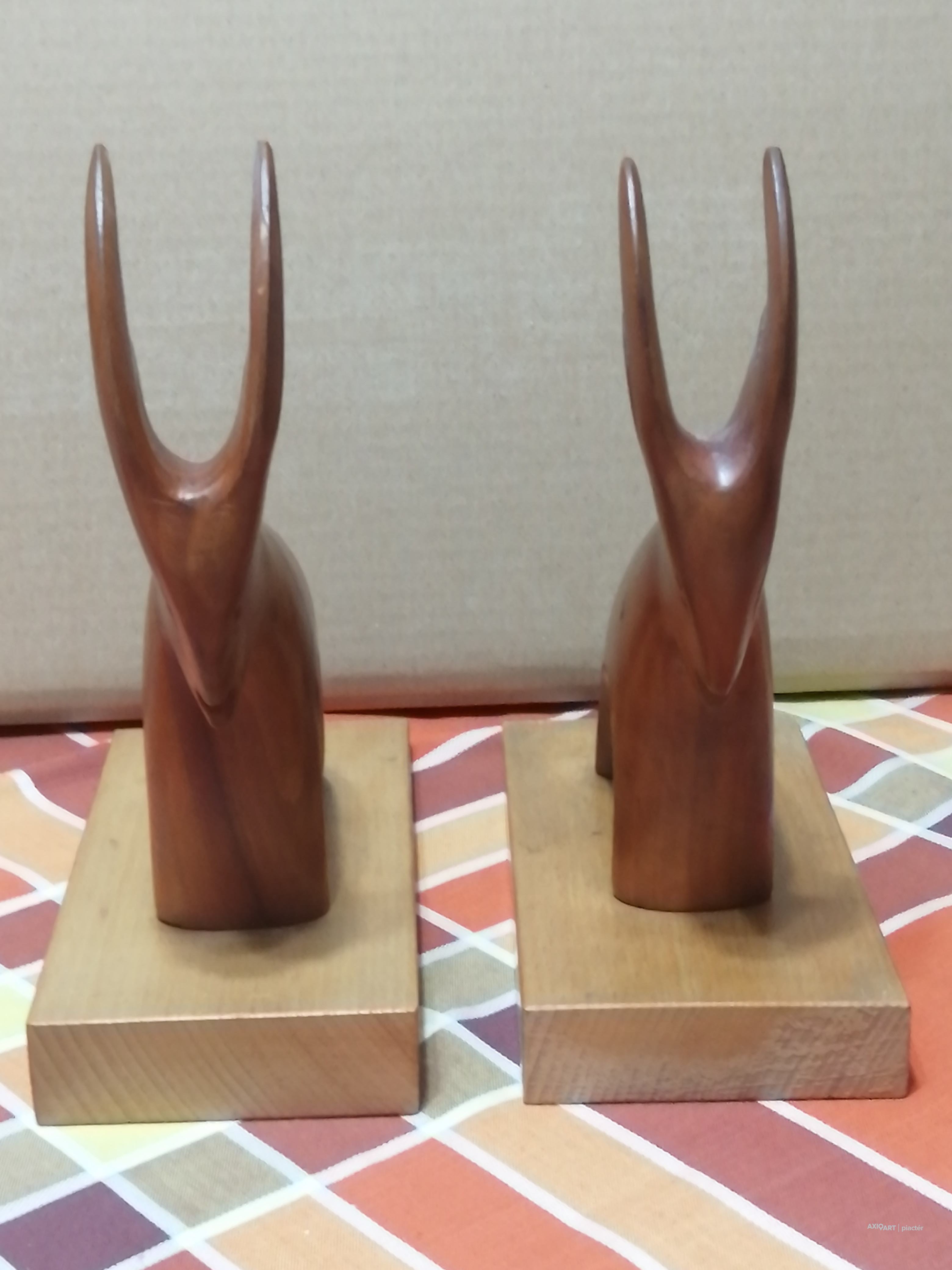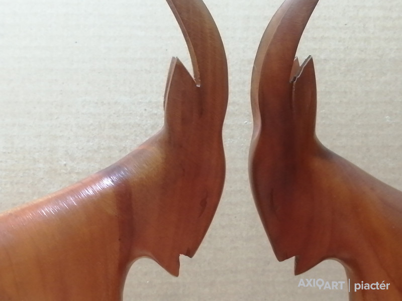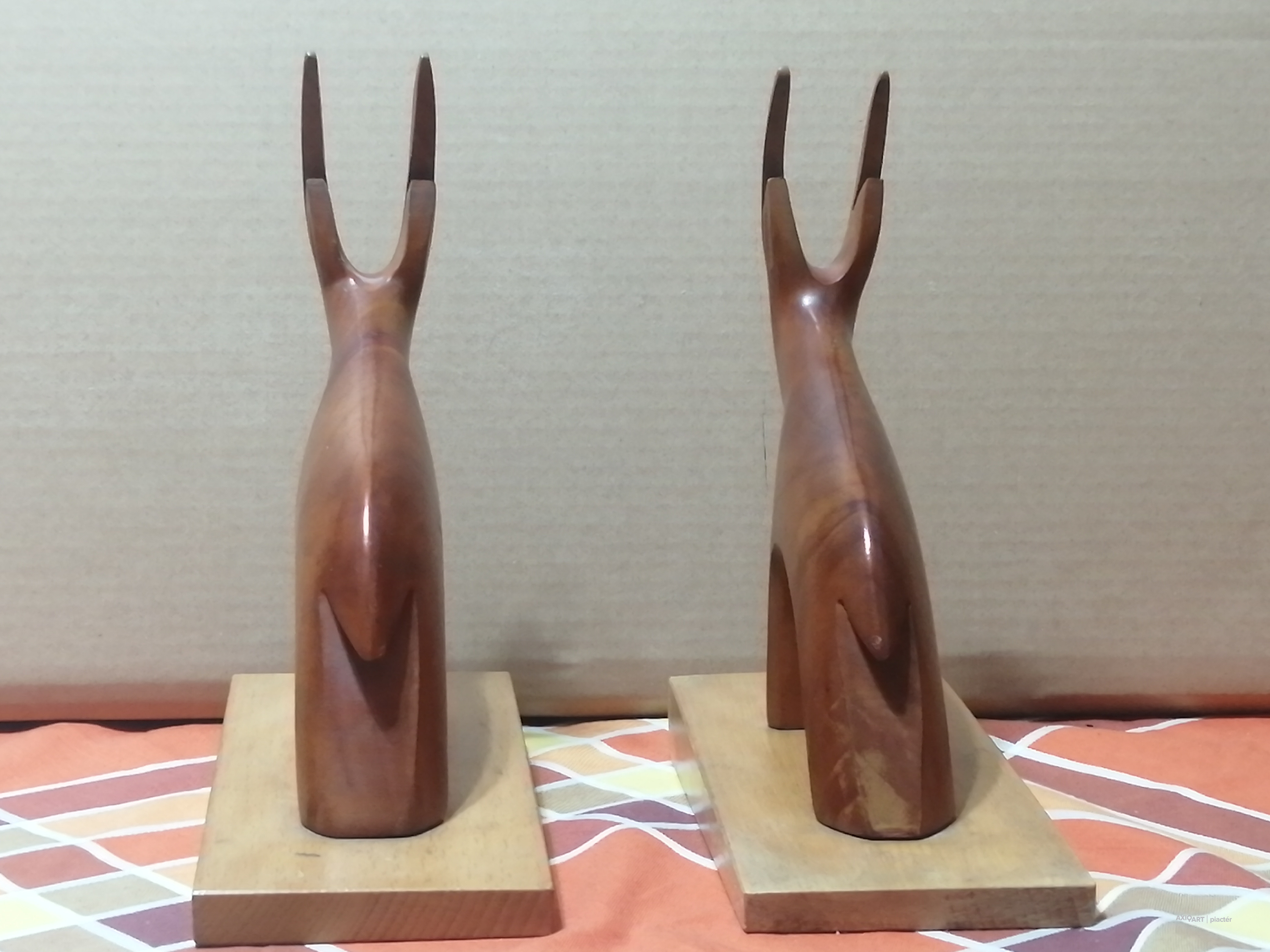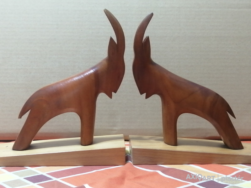 Egy csodálatos, századközepi Stein Böck Hegyikecske Ausztriából. Gyönyörű, leegyszerűsített absztrakt formák, cseresznyefából faragva. Mindkét darab szinte tökéletes másolata egymásnak. A művész ismeretlen, de két különleges tárgyat hagyott ránk, amelyek örömet szereznek új tulajdonosuknak.