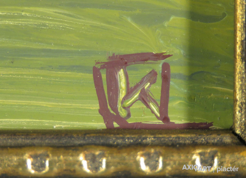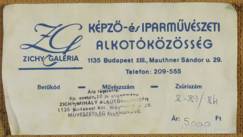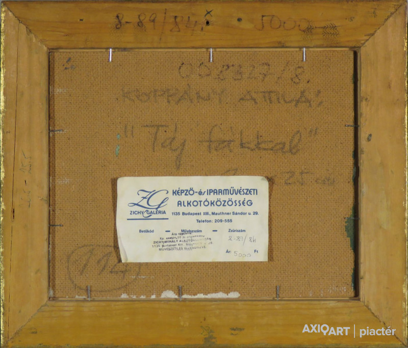 [FKC536/Bp104/46] A kép mérete: 20 x 25 cm keret nélkül. Készült: Olaj, Farostlemez A kép Koppány Attila (Enying, 1947) alkotása. Jelezve jobbra lent "monogrammal" A festmény jó állapotban van. Keret: Ép A festmény hátoldalán Zichy Mihály Alkotóközösség raglapja látható, autográf Koppány Attila: Táj fákkal 20x25 cm felirattal. Magyar festők és grafikusok életrajzi lexikona I-II. Enying, 1947 - Grafikus, festő. Székesfehérvárott Áron Nagy Lajos szabadiskolájában kezdte tanulmányait, majd a budapesti Képzőművészeti Főiskolán tanult sokszorosító grafikát. Egyéni kiállításai voltak Budapesten, több vidéki városban, 1968-ban Velencében, 1988-ban Erfurtban. Rendszeres résztvevője megyei és regionális kiállításoknak, esetenként országos bemutatókat és külföldi csoportos tárlatoknak. A győri Műszaki Főiskola tanszékvezető docense, a Győri Grafikai Műhely alapító tagja. Jó ideig grafikusként jegyezték nevét, műveit rendszeresen közölték lapok, folyóiratok. Pályája rajzokkal, linómetszetű táj-, város- és növényábrázolásokkal indult. Mindemellett a festészettel is intenzíven kezdett foglalkozni. Lecsupaszított, felboncolt, felbomló bioalakzatok rakódtak alkotásai csontvázára. Díjak: Fejér megye pályázati díja, Megyei Tárlat díja, Borsos-érem, 1981-90 között a Műszaki Főiskola ösztöndíja. A székesfehérvári Műszaki Szakközépiskola számára mozaikot készített. A győri Xantus János Múzeum hét lapját őrzi. (S.N.: Műv. 1978/5, DTK, Heitler László adatközlése nyomán)