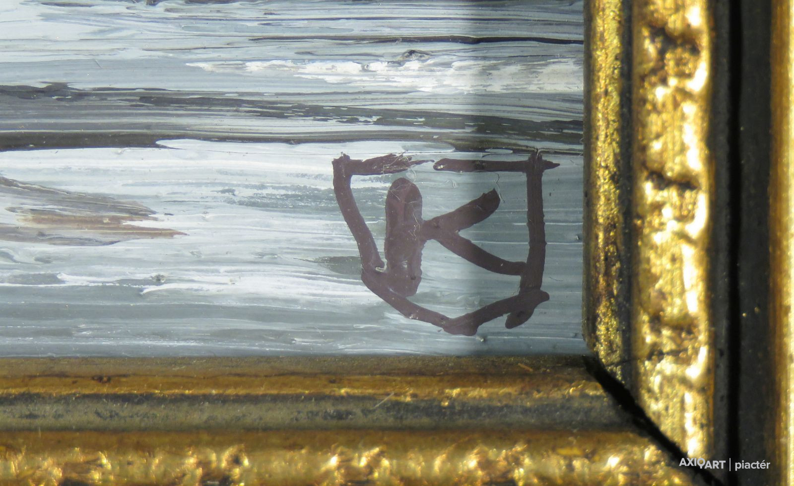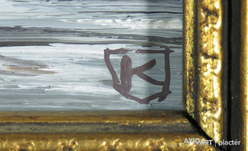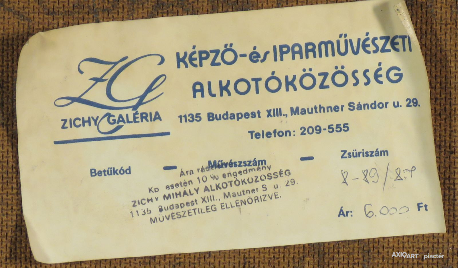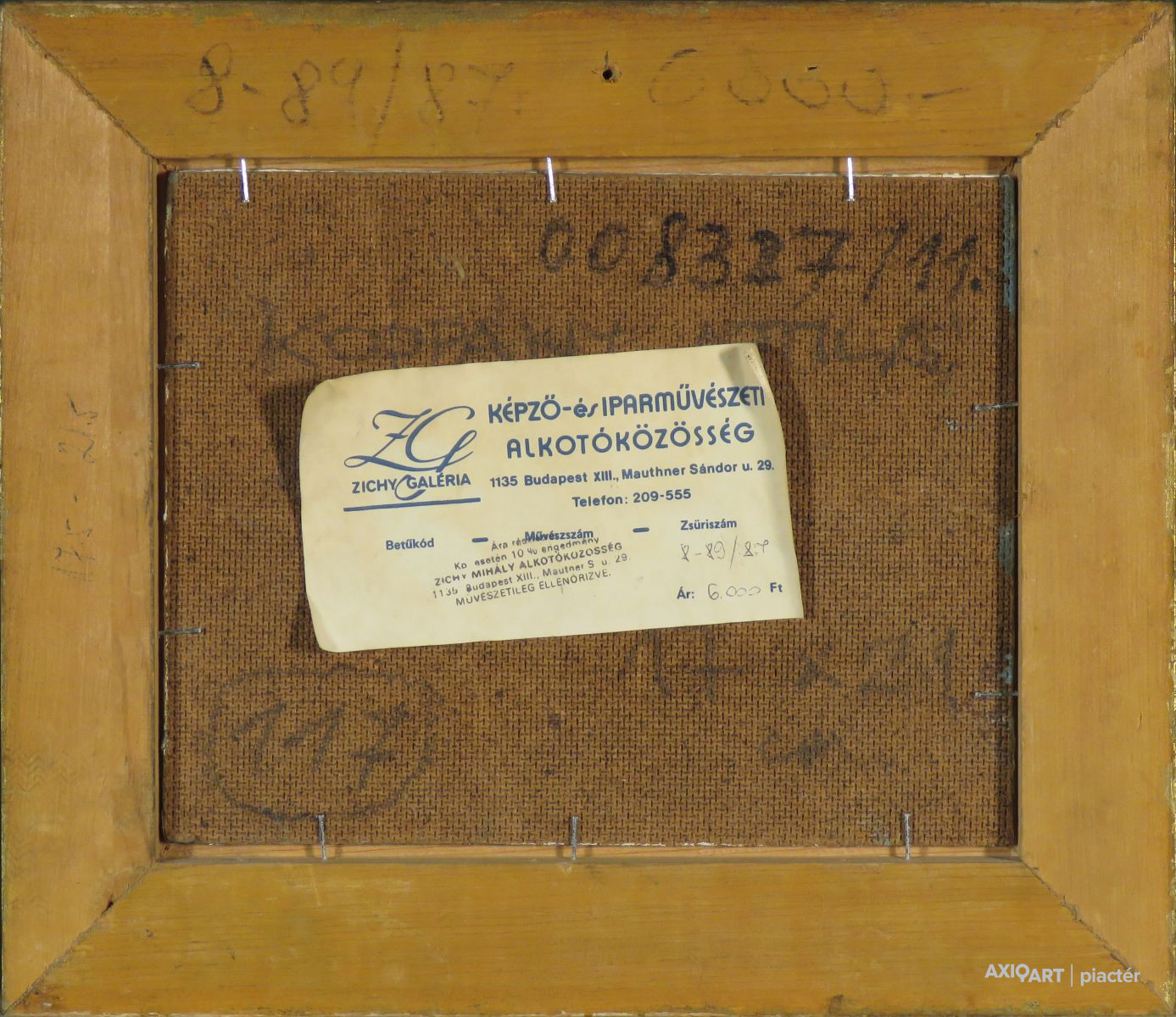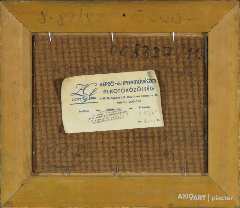 [FKC537/Bp305/216] A kép mérete: 17 x 21 cm keret nélkül. Készült: Olaj, Farostlemez A kép Koppány Attila (Enying, 1947) alkotása. Jelezve jobbra lent "monogrammal" A festmény jó állapotban van. Keret: Ép A festmény hátoldalán autográf írással: Koppány Attila: "Táj" 17x21 cm Magyar festők és grafikusok életrajzi lexikona I-II. Enying, 1947 - Grafikus, festő. Székesfehérvárott Áron Nagy Lajos szabadiskolájában kezdte tanulmányait, majd a budapesti Képzőművészeti Főiskolán tanult sokszorosító grafikát. Egyéni kiállításai voltak Budapesten, több vidéki városban, 1968-ban Velencében, 1988-ban Erfurtban. Rendszeres résztvevője megyei és regionális kiállításoknak, esetenként országos bemutatókat és külföldi csoportos tárlatoknak. A győri Műszaki Főiskola tanszékvezető docense, a Győri Grafikai Műhely alapító tagja. Jó ideig grafikusként jegyezték nevét, műveit rendszeresen közölték lapok, folyóiratok. Pályája rajzokkal, linómetszetű táj-, város- és növényábrázolásokkal indult. Mindemellett a festészettel is intenzíven kezdett foglalkozni. Lecsupaszított, felboncolt, felbomló bioalakzatok rakódtak alkotásai csontvázára. Díjak: Fejér megye pályázati díja, Megyei Tárlat díja, Borsos-érem, 1981-90 között a Műszaki Főiskola ösztöndíja. A székesfehérvári Műszaki Szakközépiskola számára mozaikot készített. A győri Xantus János Múzeum hét lapját őrzi. (S.N.: Műv. 1978/5, DTK, Heitler László adatközlése nyomán)