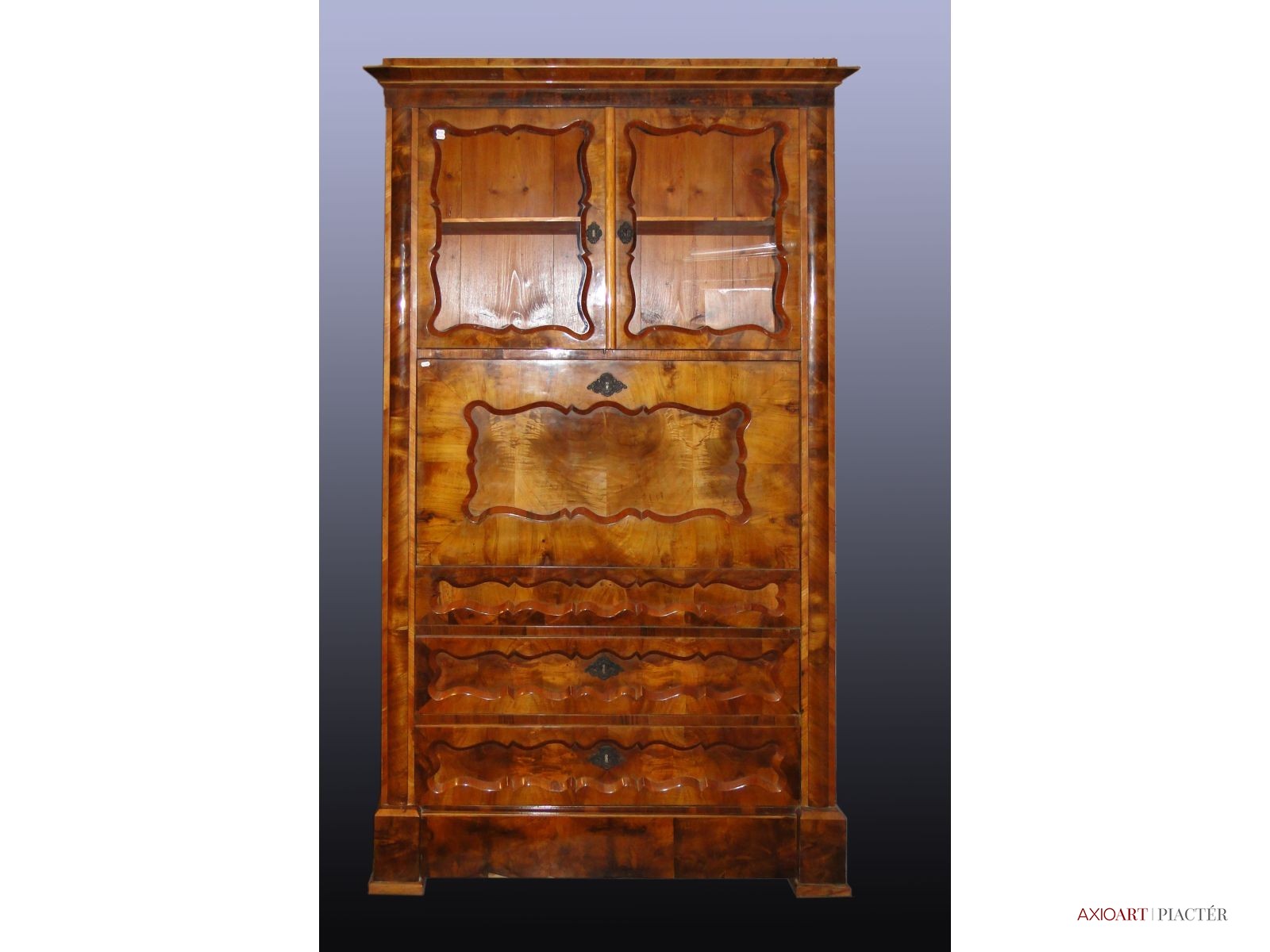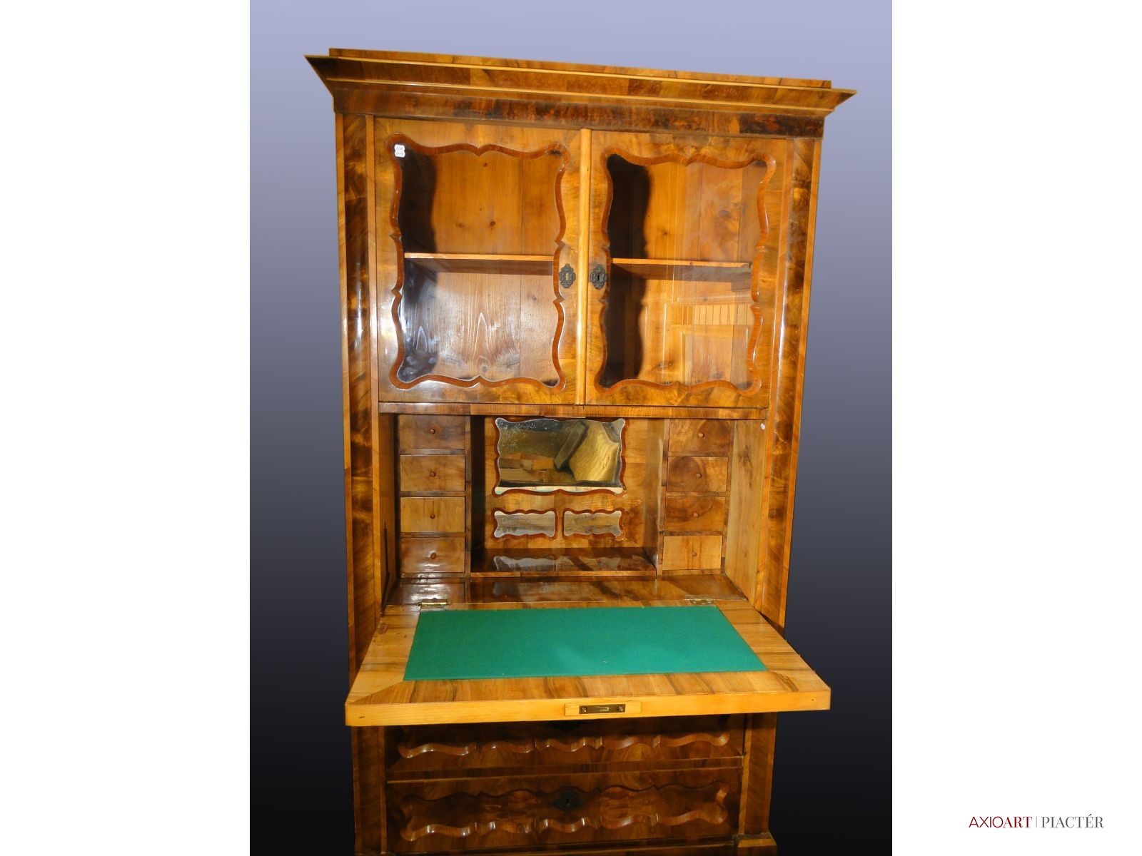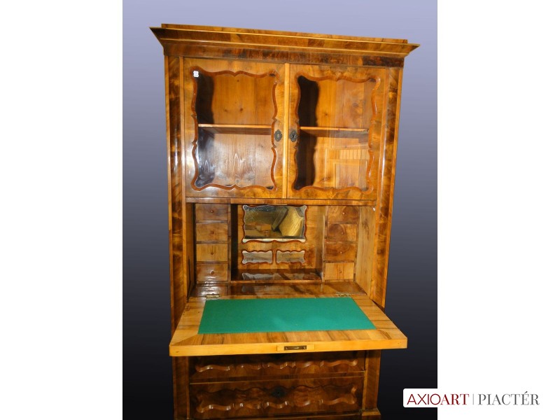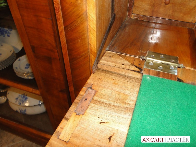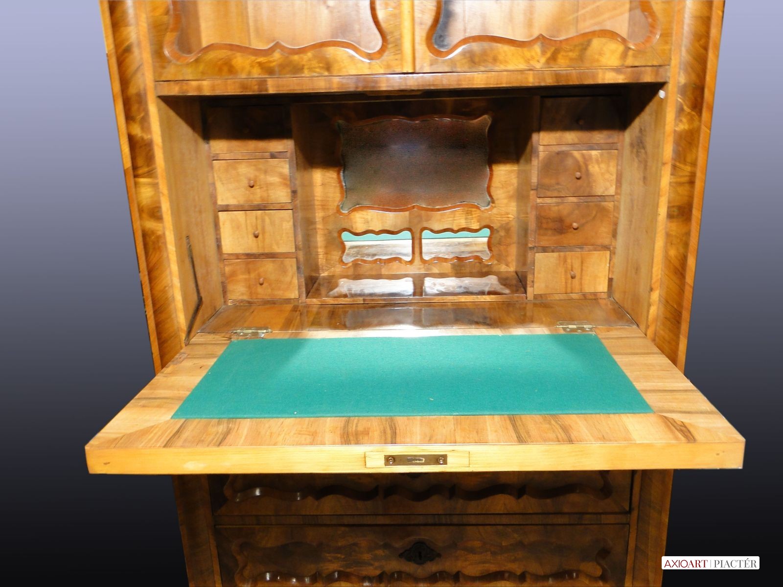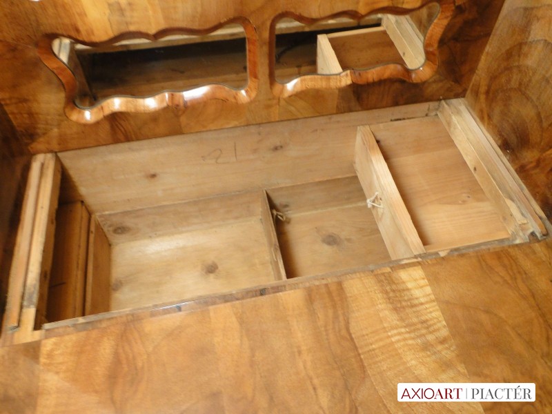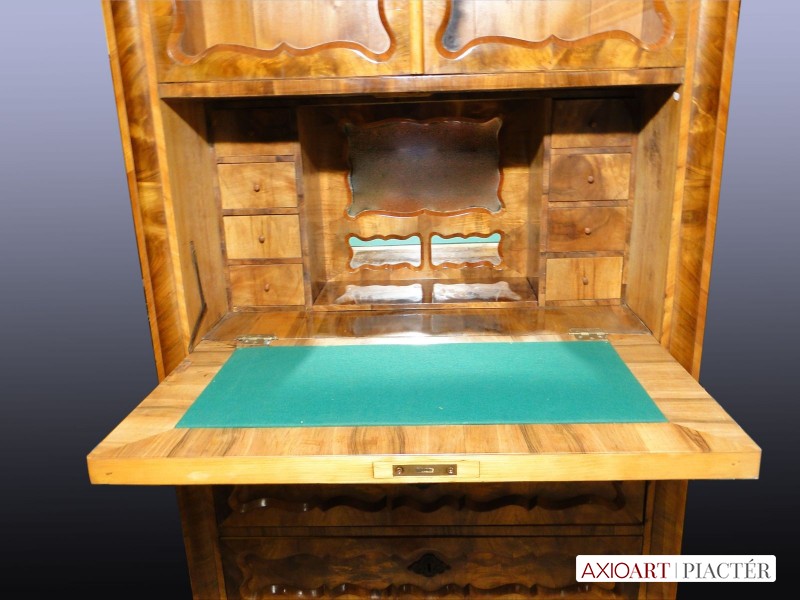 AZ ÍRÓ SZEKRETEREK KÖZÖTT ÓRIÁSINAK MONDHATÓ, VISZONYLAG NAGYON MAGAS ÉS SZÉLES, KOMOLY DARAB. A SZEKRETER RENDELKEZIK 9 REJTETT FIÓKKAL ÉS 10 LÁTHATÓ FIÓKKAL ÉRDEKESSÉGE MÉG HOGY A REJTETT FIÓKOK 2 SZINT MÉLYEN IS MEGTALÁLHATÓAK. A BÚTOR DIÓFÁBÓL VAN, TÖKÉLETES ÁLLAPOTBAN, ELMONDÁSOK ALAPJÁN 20-25 ÉVE ÚJRAPOLITÚROZTÁK. A BÚTOR MIND AZ 5 VERETE KORABELI, EREDETILEG IS A BÚTORHOZ TARTOZOTT, NEM PÓTOLT!