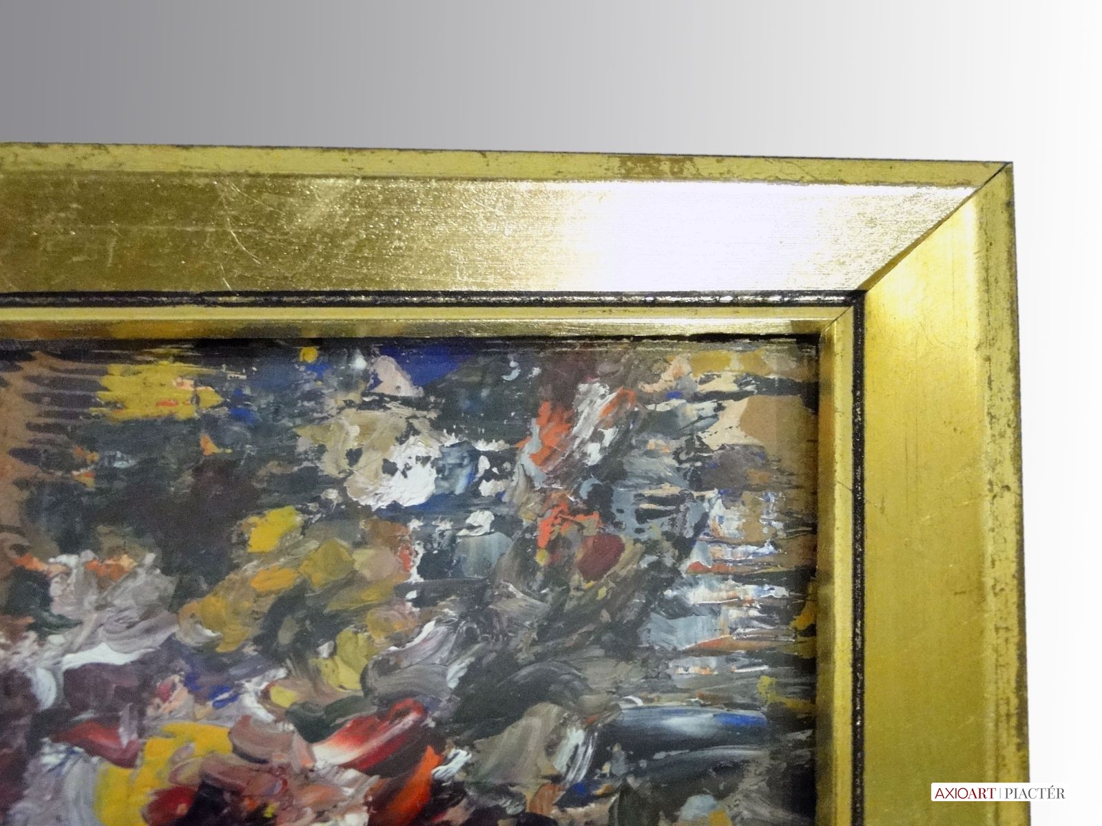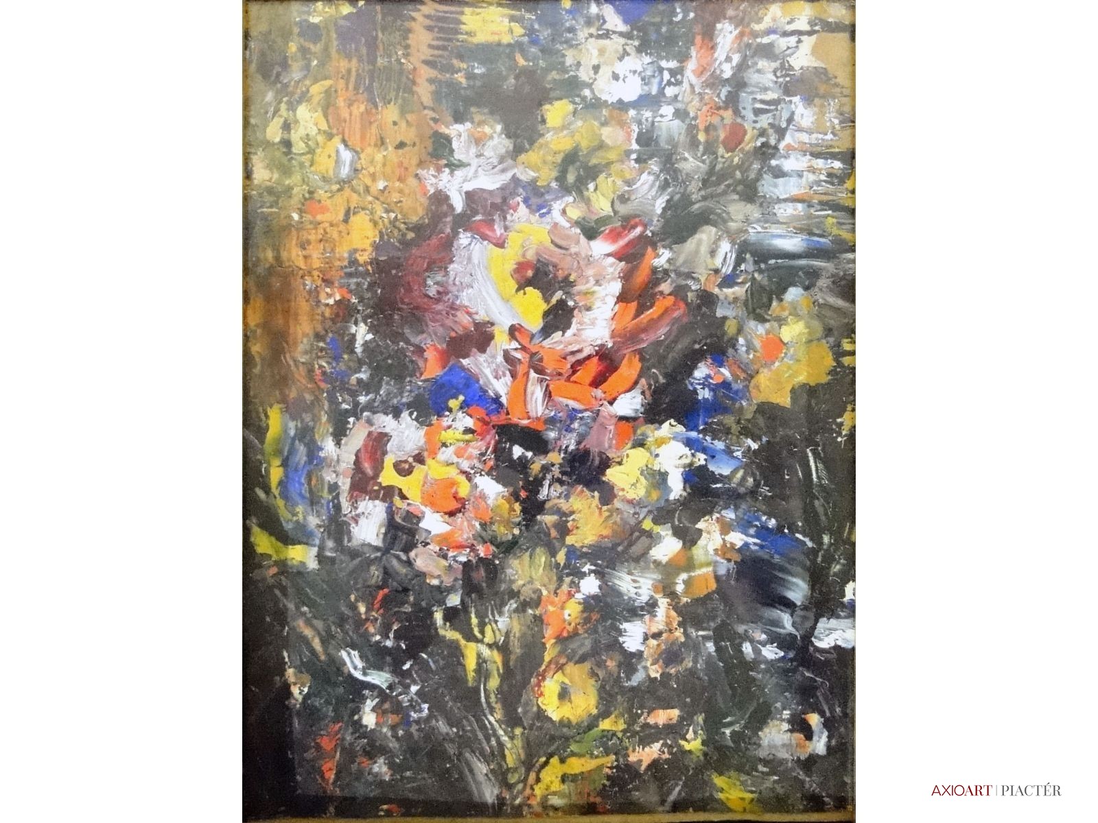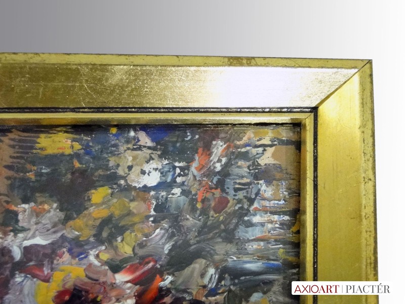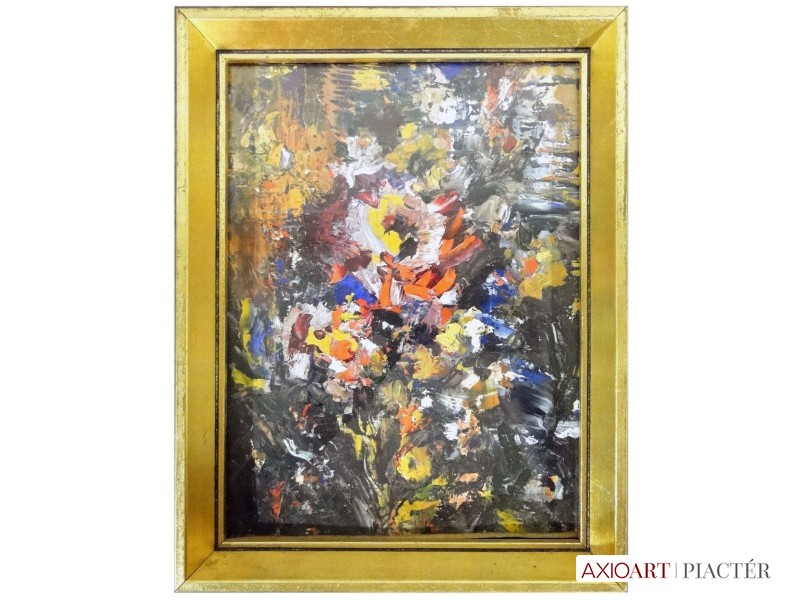 [1Y029/Z018] Olaj farost festmény, üveglap mögött, hibátlan képcsarnokos keretben. Hátoldalán Képcsarnok Vállalat papír címkéje: A művész neve: SCHÉNER MIHÁLY A kép címe: TÁJ Magasság: 66.5 cm Szélesség: 86 cm Súly: 6.54 kg Schéner Mihály festő, grafikus, szobrász, keramikus, bábtervező Medgyesegyháza, 1923-01-9 Elhalálozott: Budapest, 2009. május 11. Honlap: http://www.kormendigaleria.hu/kiadvany.html 1942-1947: Magyar Képzőművészeti Főiskola, tanára: Rudnay Gyula. 1978: Munkácsy-díj; 1984: érdemes művész; 1989: kiváló művész; 1995: Kossuth-díj. 1992-től a Magyar Művészeti Akadémia, 1993-tól a Széchenyi Irodalmi és Művészeti Akadémia tagja. 1956-ig tanított. 1982: Nagyatádi Faszobrász Alkotótelep, 1985: Nemzetközi Acélszobrász Alkotótelep, Dunaújváros. A stílusában felismerhető, mégis sokféle műtárgyat létrehozó ~ gazdag, állandóan alakuló életműve a folyton változó világban helyét kereső, az alkotói szabadságot megvalósító XX. századi képzőművész példázata lehetne. Magát expresszív-szürrealista alkotónak nevezi. Egyaránt dolgozik festékkel, textillel, fával, fémmel. Rajzol, szerkeszt, farag, épít, gyúr, varr és ragaszt, felhasználja a mézesbábok öntőformáit. Festő, rajzoló, textilszobor- és bábkészítő, fazekas, asztalos, esztergályos. Háromlépcsős folyamatban gondolkozik: rajzban tervez, majd fest, szobrot készít, “formába önt”, mindig a végső plasztikai megoldást keresi. Ami állandó és mégis játékosan változékony megjelenésű Schéner művészetében, az a gyermekkori emlékek által meghatározott népi mesterségek iránti tiszteletet kifejező motívumkincs, a tárgyi folklór formakészlete, amely már-már kézjegyként ismétlődik munkáin. Mitologikussá nőtt képzelete új lényeket teremt, pl: a Pigulát, amely disznótestű, emberfejű teremtmény. Schéner festményein a szürrealista motívumokat konstruktív szerkezetbe rendezi, a geometriát és az organikus természeti motívumokat egyaránt beépíti műveibe. A népi, népművészeti formakincsből merített lovas huszárok, betyárok, szegénylegények cifra szűr mentéje, piros csákója, fekete csizmája, az önálló életet élő zsinórdíszek és mézeskalács bábok, a kiskocsik a gyermekkori vásárok, búcsúk színes forgatagába vezet. A primér motívumokat aztán felváltják a vastagon felhordott felületbe karcolt jelek, vonalhálózatok, amelyek a játszó gyermek homokba rajzolt ábráit, a pásztorember fába vésett üzeneteit, az ősember barlang falába rótt mágikus jeleneteit idézik meg. A művész pillanatnyi érdeklődésének megfelelően a színek búvópatakként tűnnek el és jelennek meg ismét. A 60-as években leginkább a formákkal való játék érdekelte, a festmények felülete egyre gazdagodott: a táblaképek felületén applikációk jelentek meg, vagy lemállasztott rétegek hagyták maguk után hiányukat, motívumok nélküli ősformák, archetipikus képzetek bukkantak fel művészetében. A véletlenszerűnek látszó rétegekkel való játék azonban tudatos komponálás eredménye, amely később nyilvánvaló ritmusnak és formai szerkesztettségnek adja át a helyét, mint a Törvénytáblák c. sorozaton. A különböző művészi kifejezési formák egymásra termékenyítő hatással vannak, át- meg áthatják egymást. Textilszobrai, amelyekkel új műfajt teremtett, ugyanazzal az automatikus, expresszív-szürrealista módszerrel készülnek, mint festményei. A hagyományosan a népművészetben alkalmazott anyag, a filc lehetőséget ad a népi formakincs felelevenítésére, amely azonban a művész különös szürrealista átiratában jelenik meg. A szívekkel kivarrt, zsinórdíszes Posztókotlós c. művén mézesbábok lógnak, hátán huszárok lovagolnak. Egész sor textilből készült kéz-plasztikát alkot, amelyeket az ujjakra rávarrt díszekkel öltöztet, személyesít meg. A színes-különös világból aztán ~ újra puritán képi és formai rendbe juttatja el a nézőt, majd nemsokára tépett, gyűrt, vágott, csorgatott, repedezni hagyott szenvedélyesen vonagló képi felületeket hagy hátra. Schéner készített apró gyermekjátékokat, térstruktúra-tereket, mászókákat is. A magyar népi formák mellett szürreális játékaiban gyakran alkalmaz görög mitológiai alakokat, “elkentaurosodott” lovakat, Gorgó-fejeket, sellőket, hárpiákat, Pán-ábrázolásokat. Schéner nemcsak saját művészetéről publikál, hanem művésztársairól is számos írása jelenik meg, elsősorban az Új Auróra c. folyóiratban, amelynek egy ideig főmunkatársa volt. Irodalom kiállítása, Magyar Építőművészet, 1962/4. Húsz év után, Művészet, 1965/4. BOZÓKY M.: ~, Tiszatáj, 1968/5. PERNECZKY G.: Nincs uborkaszezon, Élet és Irodalom, 1969. augusztus 8. BARÁNSZKY-JÓB L.: ~, Művészet, 1969/9. LÁSZLÓ GY.: ~ kaposvári kiállítása, Jelenkor, 1969/4. MAJOR M.: Pásztorok, betyárok, huszárok - kezek, Tükör, 1970. szeptember 15. FRANK J.: Bemutatjuk ~t, Élet és Irodalom, 1972. május 6. ról kiállítása ürügyén, Képzőművészeti Almanach, Budapest, 1972 Sötétkék kokasok, Élet és Irodalom, 1973. szeptember 9. MAJOR M.: ~ játékai, Élet és Irodalom, 1974. július 27. BARTA J.: Egy különös művész, Alföld, 1974/6. VADAS J.: Szárnykészítők, Élet és Irodalom, 1975. október 4. JUHÁSZ F.: A halál ellen játszani, Élet és Irodalom, 1975. május 17. PAP G.: Kincsek és műkincsek, Művészet, 1975/6. P. SZŰCS J.: Az utak kettéválnak, Művészet, 1978/3. Békési művészet, Művészet, 1978/7. SZAMOSI F.: ~ [kismonográfia], Budapest, 1978 VADAS J.: Játék a játékkal, Élet és Irodalom, 1979. augusztus 18. NÉMETH L.: ~ műveiről, Művészet, 1979/4. MIKLÓS P.: Mit akar ez a múzeum?, Művésze
