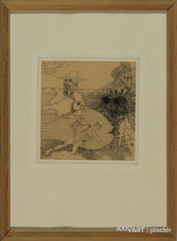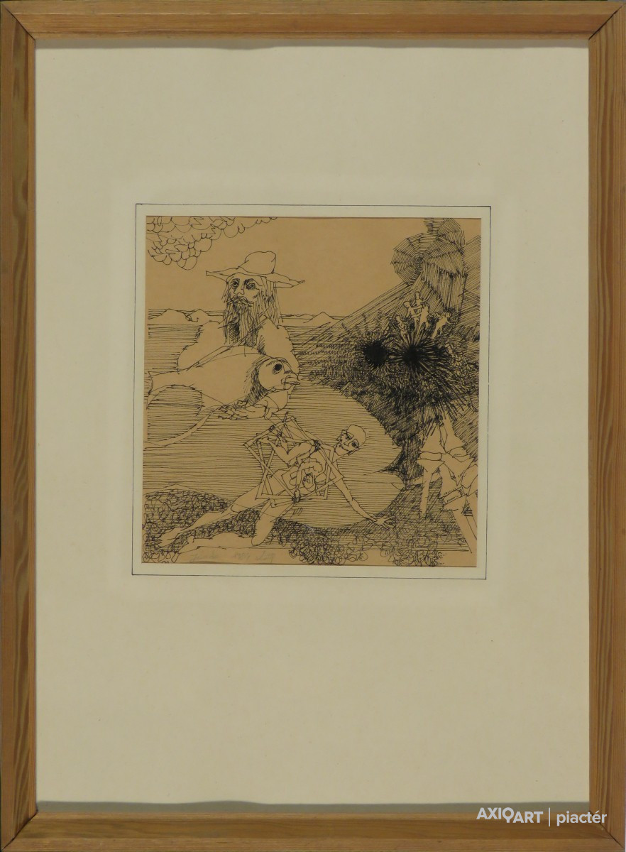 [FKB308/Bp72/505] A kép mérete: 27,5 x 18 cm keret nélkül. Készült: Tus, Papír A kép Sáros András Miklós (Höchstadt an der Aisch, 1945) alkotása. Jelezve hátul lent "Sáros András Mi" A festmény jó állapotban van. Keret: Paszpartúban Művész életrajzok kortárs magyar képzőművészek 1968-ban végzett a főiskola sokszorosító-grafikai szakán Ék Sándor és Fónyi Géza növendékeként. 1966 óta kiállító művész, eddig mintegy 15 egyéni kiállítása volt, a legfontosabban a Ferencvárosi Pincetárlaton (1969), Vácott (1974), Szolnokon (1976), Hódmezővásárhelyen (1978), a Helikon Galériában (1980), Miskolcon (1982), továbbá Helsinkiben (1981). 1975-1978-ban Derkovits-ösztöndíjat kapott, 1983-ban Munkácsy-díjjal tüntették ki. 10 különböző kiállítási és pályázati díj tulajdonosa, a trieszti tudományos-fantasztikus világkiállítás (1972) kitüntetettje. - Elsősorban a rézkarcot és a litográfiát műveli, érdeklődésének középpontjában az ember, az élő dolgok s a képben kifejezhető társadalmi és lélektani problémák állnak. Stílusa az újrealizmus szenvtelen éleslátásának, pátosztalan előadásmódjának jegyében fogant. Munkáit gyakorta irodalmi élmények ihletik. Magyar festők és grafikusok adattára 1968-ban végzett a Képzőművészeti Főiskola sokszorosító grafikai tanszakán Ék Sándor és Fónyi Géza növendékeként. 1966 óta kiállító művész, 1969-ben a Ferencvárosi Pincetárlatban, 1970-ben Jászberényben, 1972-ben Tokajban, 1974-ben Vácott és Dunakeszin jelentkezett önálló kiállítással. 1972-ben díjat nyert a trieszti tudományos-fantasztikus világkiállításon. - Elsősorban a rézkarcot és a litográfiát műveli, érdeklődésének középpontjában az ember, az élő dolgok s a képben kifejezhető társadalmi és lélektani problémák állnak. Stílusa az újrealizmus szenvtelen éleslátásának, őszinte, pátosztalan előadásmódjának jegyében fogant. Művészi munkásságát 1983-ban Munkácsy-díjjal jutalmazták. - Irod.: P. Sz. T.: Művész életrajzok. Bp. 1985.; Sinkovits Péter: Hétköznapi reneszánsz. Beszélgetés Sáros András Miklóssal. Művészet, 1985. 10. Magyar festők és grafikusok életrajzi lexikona I-II. Műgyűjtők és kereskedők kézikönyve Grafikus. A bp.-i Képzőművészeti Főiskola sokszorosító grafika tanszakán Ék Sándor és Fónyi Géza tanítványa volt. A főiskola elvégzését követően műhelymunkára lehetőséget a Fatal Művészek Stúdiója biztosított. Derkovits-ösztöndíjban részesült. 1966 óta számos hazai és külhoni kiállításon szerepelt. 1972-ben díjat nyert a Trieszti Tudományos-Fantasztikus Világkiállításon. Főleg a rézkarcot és a litográfiát műveli. Érdeklődésének középpontjában az ember és a képekben kifejezhető társadalmi és lélektani problémák állnak. Stílusa az új realizmus szenvtelen éleslátásának, őszinte, pátosztalan előadásmódjának jegyében fogant. 1983-ban Munkácsy-díjat kapott. 1989-ben az Eötvös József Alapítvány 12 havi ösztöndíját, és a Neufeld Anna Alapítvány díját kapta meg. (MÉ, GM, S. P.: Műv.-1985/10) Magyar festők és grafikusok életrajzi lexikona I-II. Grafikus. 1963-1968 között a Budapesti Képzőművészeti Főiskola sokszorosító grafika tanszakán Ék Sándor és Fónyi Géza növendéke volt. A főiskola elvégzését követően műhelymunkára lehetőséget a Fiatal Művészek Stúdiója biztosított. 1966 óta számos egyéni (Ferencvárosi Pincetárlat, Stúdió Galéria, Helikon Galéria, Kossuth Klub, Józsefvárosi Galéria, Balassi Galéria, Újpest Galéria, Jászberény, Tokaj, Zebegény, Vác, Nyírbátor, Szolnok, Vásárosnamény, Hajdúszoboszló, Hódmezővásárhely, Miskolc, Szentendre, Martfű, Helsinki, Hamburg) és csoportos (Óbuda Galéria, Műcsarnok, Ernst Múzeum, Ludwig Múzeum, Szentendre, Sopron, Kecskemét, Vác, Pécs, Győr, Pozsony, Besztercebánya, Dunaszerdahely, Szabadka, Brescia, Stockholm, München, Stuttgart, Berlin, Duisburg, Fredrikstadt, Ankara, Párizs, Saint Etienne, Isztambul, stb.) bemutatón szerepelt. 1972-81 között rendszeresen részt vett a PKS éves tárlatain, 1972-79 között a szolnoki tárlatokon, 1973-76 között a Váci Műhely kiállításain, 1972-80 között a Vásárhelyi Őszi Tárlatokon, 1973-2000 között a miskolci Országos Grafikai Biennálékon. 1992-től tagja a Magyar Grafikusok Szövetségének. Számos művészeti díjjal jutalmazták itthon és külföldön, többek között 1983-ban a Munkácsy-díjat nyerte el. Főként ceruzarajzokat, litográfiákat, többszínnyomású aquatintákat és rézkarcokat készít. Érdeklődésének központjában az ember, s a képekben kifejezhető társadalmi és lélektani problémák állnak. Stílusa az új realizmus szenvtelen éleslátásának, őszinte, pátosztalan előadásmódjának jegyében fogant. Műveit őrzi a Magyar Nemzeti Galéria, több vidéki képtár, valamint Drezdában a Kupferstichkabinett és a Kuopio-i Városi Gyűjtemény. (M. L.: Műv. 1976/10, MÉ, P. G.: Műv. 1981/2, K. E.: Műv. 1981/2, GM, S. P. Műv. 1985/10) Kortárs magyar művészeti lexikon I-III. 1963-68: MKF, mesterei: Fónyi Géza, Ék Sándor. Eurocon I. tudományos-fantasztikus kiállítás magyar díja, Trieszt; 1974: FKS-kiállítás, Fővárosi Tanács díja; 1975-78: Derkovits-ösztöndíj; 1983: Munkácsy-díj; 1985: XIII. Orsz. Grafikai B., Helsinki pályázatának I. díja, Miskolc; 1987: Nközi Festészeti és Grafikai Triennálé díja, Hanoi; 1989: Neufeld Anna-díj; az Eötvös J. Alapítvány egy éves ösztöndíja. 1992-től az MGSZ tagja. A rajzot - elsősorban ceruzarajzok - ujjlenyomatnak, a nyomtatott grafikát - főként többszínnyomású aquatinta és litográfia - több példányos eredeti műnek tekinti. A fegyelmezettség és a részletgazdagság, a látvány elemeivel