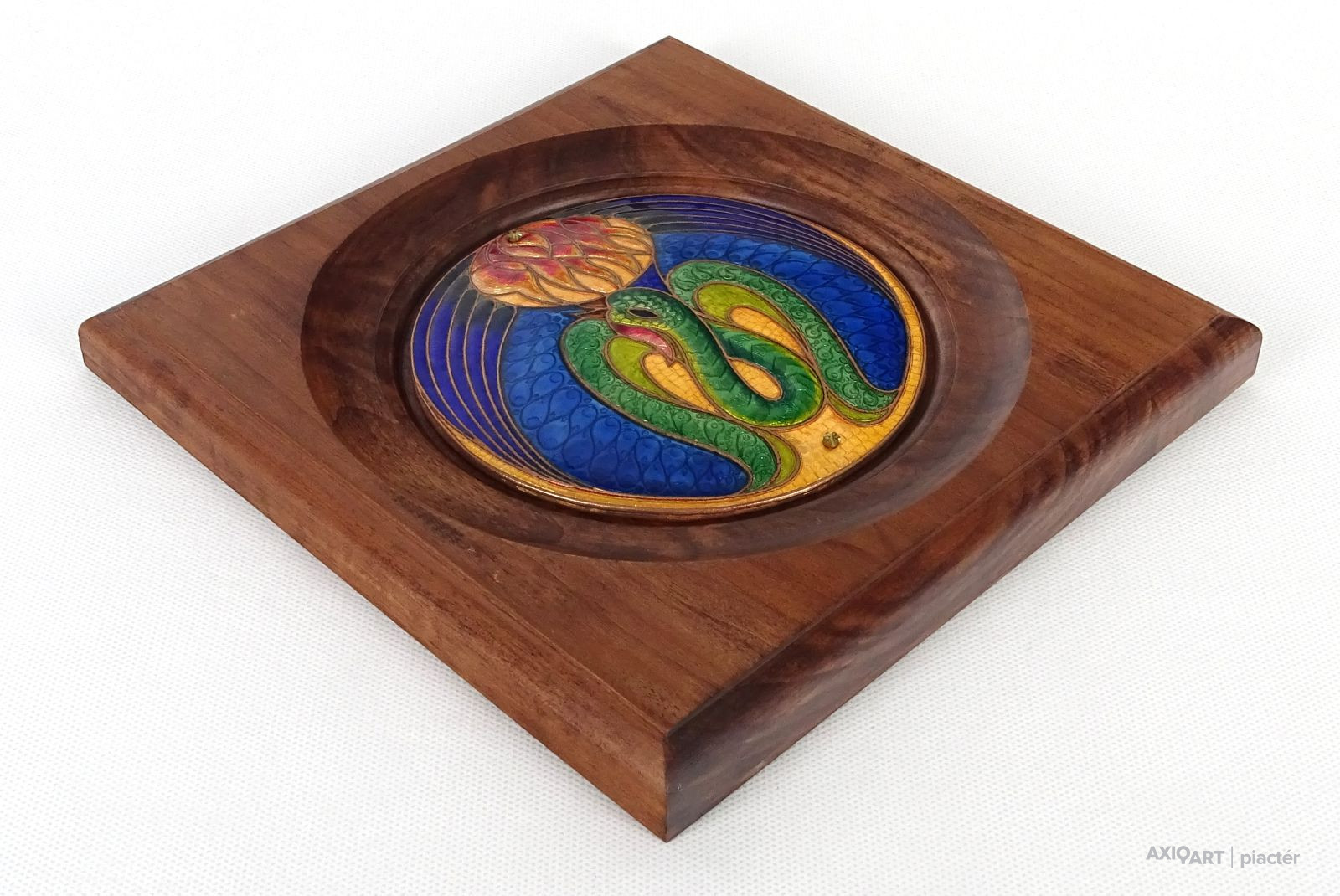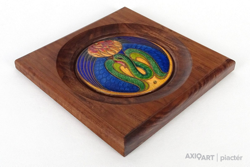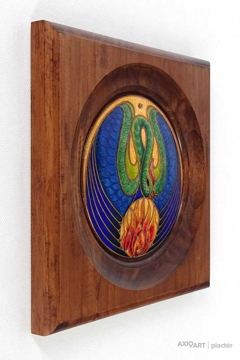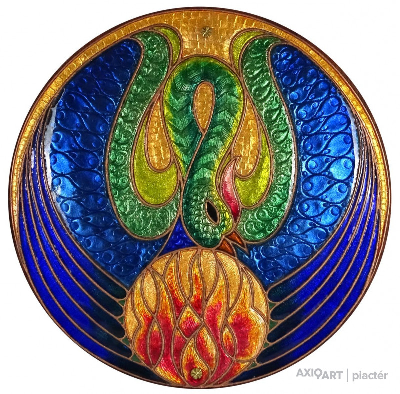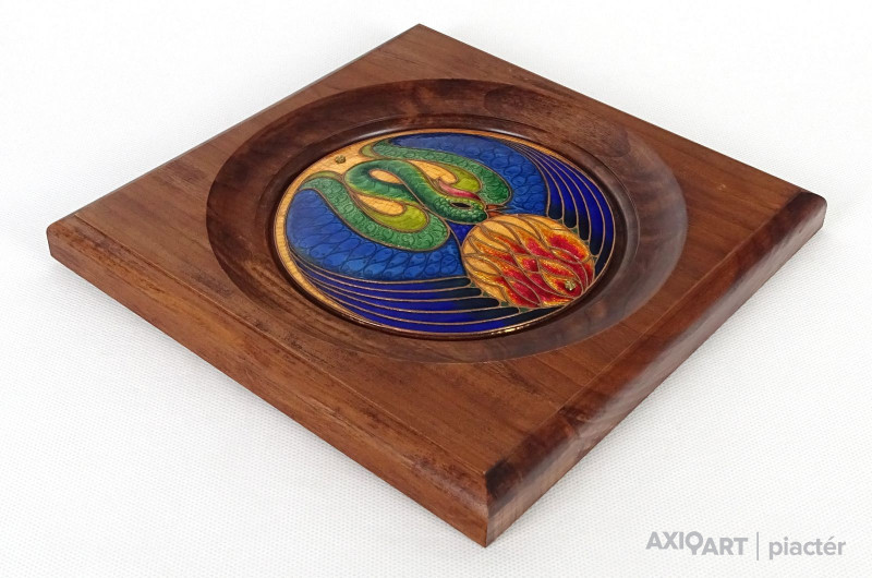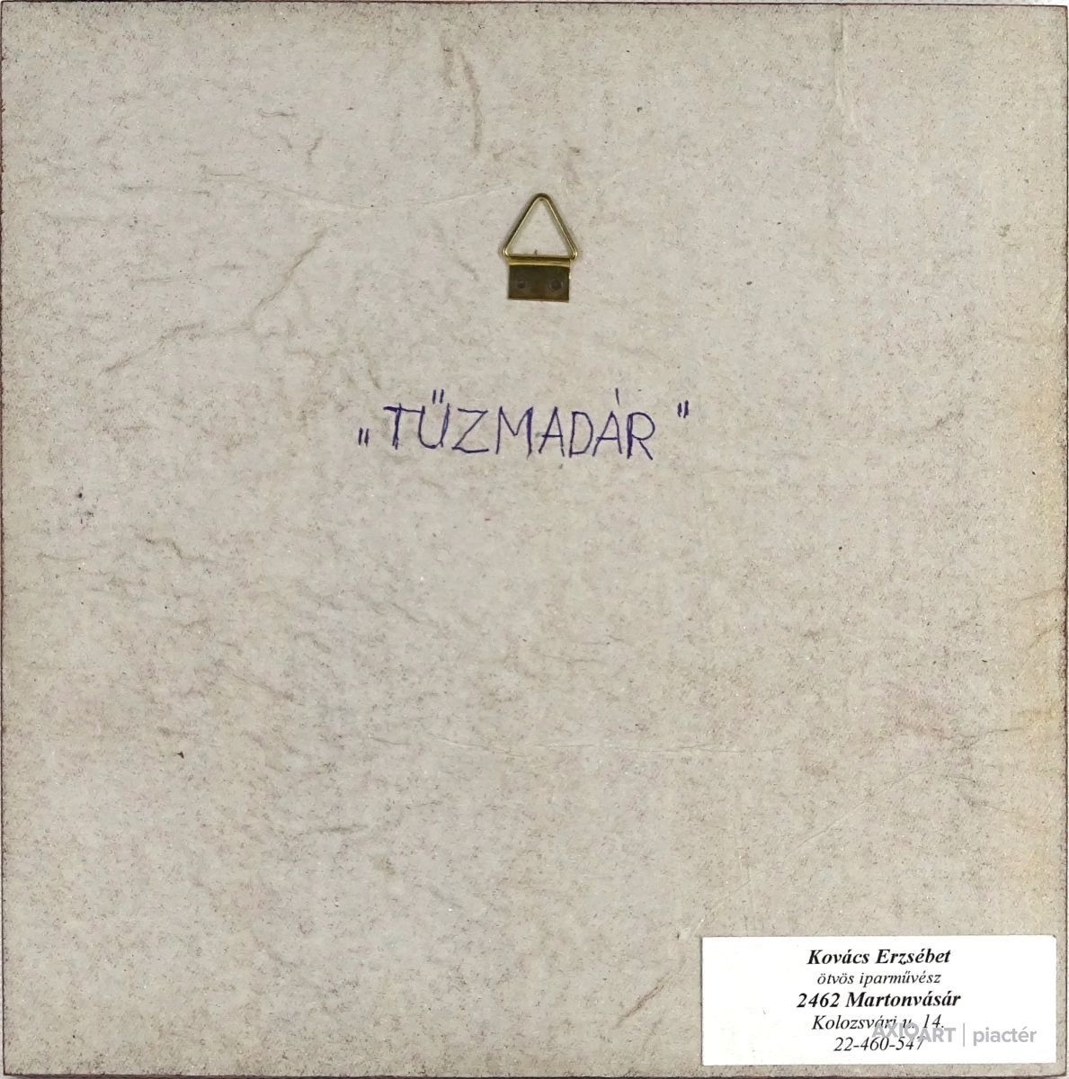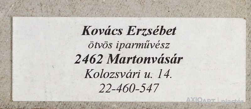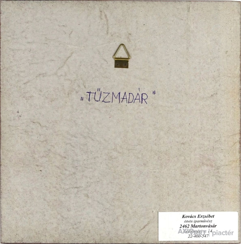 [1M397/080] Hibátlan állapotú egyedi keretben található, rézlapra készített tűzzománc kortárs kép, tűzzománc kép. Akasztási lehetőséggel rendelkezik. Jelzés a zománcozott részen: KE (K.E.) Hátoldalán címke, rajta felirat: KOVÁCS ERZSÉBET ÖTVÖS IPARMŰVÉSZ MARTONVÁSÁR Hátoldalán felirat: "TŰZMADÁR" Magasság: 21.3 cm Szélesség: 21 cm Súly: 0.58 kg Kovács Erzsébet ötvös Ősi, 1953-08-25 Szerző: Gyergyádesz László, ifj. 1983: Magyar Iparművészeti Főiskola, mestere: Engelsz József és Bokor Nelly. Pályafutását Herenden kezdte, majd 1977-ben az Állami Pénzverőben ismerkedett meg a zománcművességgel, ami fő műfajává vált. 1980-tól a főiskolán Engelsz József irányítása alatt, ill. 1983-tól a kecskeméti zománcművészeti alkotótelepeken és az Alkotóműhelyben mélyítette el tudását, mindenekelőtt az ötvöszománc eljárások terén. Legjellemzőbb technikája az ún. “cizellált rekeszzománc”. Stílusában bevallottan Bokor Nellyhez kötődik. Kisebb, főleg keresztény ikonográfiájú művei mellett elsősorban a katolikus templomokba férjével, Zoltán Győzővel közösen készített kompozíciói, liturgikus tárgyai jelentősek. Irodalom IFJ. GYERGYÁDESZ L.: Kortárs magyar zománcművészet, Kecskeméti Képtár, 1998 IFJ. GYERGYÁDESZ L.: Kortárs magyar zománcművészet, Magyar Iparművészet, 1998/2. IFJ. GYERGYÁDESZ L.: Szín-játék. Kortárs magyar zománcművészet. Magyar Művészeti Fórum, 1999/6. Egyéni kiállítások Egyéni kiállítások Válogatott csoportos kiállítások Válogatott csoportos kiállítások 1984 • Zománc, Vigadó Galéria, Budapest 1990 • Nemzetközi Zománcművészeti Alkotóműhely kiállítása, Csók Galéria, Budapest 1998 • Kortárs magyar zománcművészet, Kecskeméti Képtár. Művek közgyűjteményekben Művek közgyűjteményekben   Forrás: artportal