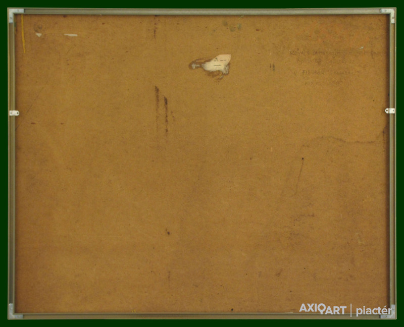 [FK2537/Bp27/3] A kép mérete: 80 x 100 cm keret nélkül. Készült: Olaj, Farostlemez A kép Kovács Tamás Vilmos (Budapest, 1951) alkotása. Jelezve Balra lent "Kovács T. Vilmos 81" A festmény jó állapotban van. Keret: Ép Magyar festők és grafikusok életrajzi lexikona I-II. Festő és grafikus. A budapesti Képzőművészeti Főiskolán Sarkantyu Simon tanítványa volt. Számos hazai és külföldi kiállításon vett részt. 1982-ben a békéscsabai Munkácsy Teremben és a budapesti Stúdió Galériában, 1984-ben Szegeden a Bartók Galériában és Gulácsy Teremben mutatta be műveit. Rendszeresen szerepel a Szegedi Nyári Tárlatokon, a hódmezővásárhelyi Őszi Tárlatokon, valamint szövetségi kiállításokon. Külföldön Ausztriában, Svájcban, Németországban, Hollandiában és az USA-ban szerepelt egyéni bemutatókon. Jellemzőek képein, rajzain az alakok személytelensége, a jelenetek jelentéktelensége. Nem egyedi esetekről és személyekről, hanem mindenki által átélhető és átélt korokról. Kisebb méretű, zárt, egyszerű komponálású tájképei is elidegenedett világot látnak. (Pogány Gábor adatközlése nyomán, MFGA) Magyar festők és grafikusok adattára 1978-ban végezte tanulmányait a Képzőművészeti Főiskolán, ahol Sarkantyu Simon volt a mestere. Főiskolai tanulmányai után minden jelentős hazai kiállításon részt vett. 1982-ben Békéscsabán a Munkácsy Teremben, 1982-ben Budapesten a Stúdió Galériában, 1984-ben Szegeden a Bartók Galériában és ugyancsak Szegeden a Gulácsy-Teremben nyílt kiállítása. Külföldi csoportos kiállításokon is részt vett 1982-ben Nürnbergben, 1984-ben Havannában és 1984-ben Prágában. Jellemzőek képein, rajzain a figurák személytelensége, a jelentek konkrétság-nélkülisége, azok nem egy-egy egyedi esetről, egyedi személyről szólnak, hanem mindenki által átélhető, s átélt korról. - ÖLK Magyar festők és grafikusok életrajzi lexikona I-II. Műgyűjtők és kereskedők kézikönyve Festő és grafikus. A bp.-i Képzőművészeti Főiskolán Sarkantyu Simon növendéke volt. Minden jelentős hazai kiállításon szerepelt. Prágában, Nürnbergben, Havannában voltak kiállításai. 1982-ben Békéscsabán a Munkácsy Teremben, 1982-ben a fővárosi Stúdió Galériában, 1984-ben Szegeden a Bartók Galériában és Gulácsy Teremben mutatta be műveit. Jellemzőek képein, rajzain a figurák személytelensége, a jelentek jelentéktelensége. Nem egyedi esetekről, személyekről, hanem mindenki által átélhető, és átélt korokról. (MFGA) Művész életrajzok kortárs magyar képzőművészek 1978-ban végzett a Képzőművészeti Főiskolán. Utána számos csoportos kiállításon vett részt. 1982-ben a II. Nürnbergi Rajzbiennálén szerepelt. - Egyéni kiállítása nyílt 1982-ben Békéscsabán és a Stúdió Galériában. Művein a vidéki táj jelenik meg, s benne az ember, a festészet hagyományos (klasszikus) eszközeivel megörökítve.