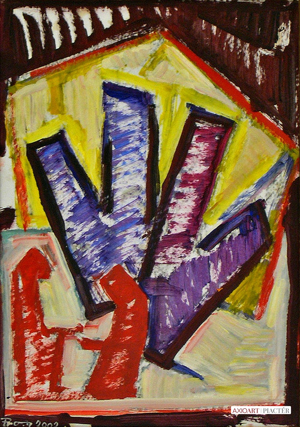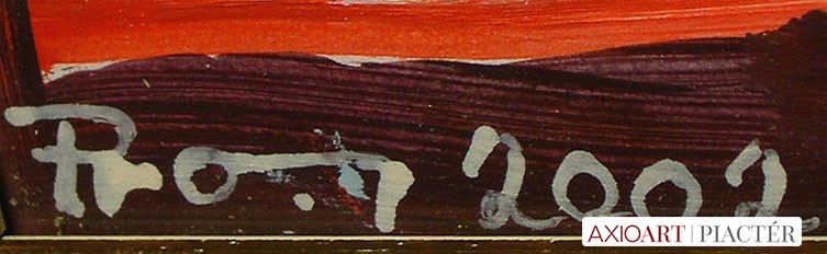 [FK0037/Z018] A kép mérete: 50 x 70 cm keret nélkül. Készült: Olaj, Vászon A kép Paizs László (Szentpéterúr, 1935) alkotása. Jelezve Jobbra lent "P. L." A festmény jó állapotban van. Keret: Ép A festmény hátoldalán a Képcsarnokvállalat címkéje található. Magyar festők és grafikusok életrajzi lexikona I-II. Festő. Tanulmányait a budapesti Iparművészeti Főiskolán végezte 1959-ben. Z. Gács György, Rákosy Zoltán és Szentiványi Lajos növendéke volt. A '60-as évek első felében hagyományosabb felfogású olajképeket festett, mozaikokat, freskókat, utóbb a pop-art körébe tartozó, a francia Arman munkáival rokon műveket alkotott. 1961 óta kiállító művész. Egyéni (Fényes Adolf Terem, Csók Galéria, Műcsarnok, Magyar Nemzeti Galéria, Halászbástya, Bástya Galéria, Vigadó Galéria, Budapest Galéria, Győr, Szombathely, Szeged, Zalaegerszeg, Duisburg, Aix-en-Provence, stb). és vegyes (Ernst Múzeum, Műcsarnok, Óbuda Galéria, Magyar Nemzeti Galéria, Csók Galéria, Vigadó Galéria, Székesfehérvár, Kaposvár, Pécs, Hódmezővásárhely, Firenze, Milano, Padova, Nápoly, Velence, Düsseldorf, Aachen, Genf, stb) tárlatokon vett részt. 1980-ban Munkácsy-díjjal jutalmazták, 1988-ban Érdemes Művész kitüntető elismerésben részesült. Munkáit őrzi a Magyar Nemzeti Galéria, a Fővárosi Képtár, a szombathelyi képtár, a pécsi Janus P. Múzeum, a székesfehérvári István Király Múzeum és a dunaszerdahelyi Kortárs Magyar Galéria. (H.B.: Műv, 1972/4, K.Gy.: Műv. 1977/2, K.G.: Műv. 1978/10, M.L.: Műv, 1983/5, R.G.: Műv, 1987/9, Sz.Gy.: Új Műv. 1995/4, MK) Magyar festők és grafikusok életrajzi lexikona I-II. Műgyűjtők és kereskedők kézikönyve Festő. Tanulmányait a bp.-i Iparművészeti Főiskolán végezte. Mozaikokat ferskókat, utóbb a pop-art körébe tartozó, a francia Arman műveivel rokon műveket alkotott. Mozaikok: a Szegedi Megyei Tanács, a Pécsi Óvoda, a Gödöllői Agrártudományi Egyetem. Freskók: Budapest - Csatárka úti Gyermekotthon. 1971-ben a Fényes Adolf Teremben volt kiállítása, 1983-ban pedig a szegedi Móra Ferenc Múzeumban nagyszabású tárlatokon mutatta be munkáit. 1988-ban érdemes művész kitüntető elismerésben részesült. (MK) Magyar festők és grafikusok adattára Az Iparművészeti Főiskolán végzett 1959-ben. Mozaikokat (Szeged, Megyei Tanács; Pécs, Óvoda; Gödöllő, Agrártudományi Egyetem), freskókat (Budapest, Csatárka úti Gyermekotthon), újabban a pop art körébe tartozó, a francia Arman műveivel rokon műveket alkotott. 1971-ben a Fényes Adolf Teremben nyílt kiállítása. 1983 februárjában a szegedi Móra Ferenc Múzeumban megrendezett nagyszabású tárlaton mutatta be alkotásait. 1988-ban érdemes művész kitüntető elismerésben részesült. - MK Művészeti lexikon I-IV. (Szentpéterur, 1935. dec. 26.- ): festő. Az Iparművészeti Főiskolán 1959-ben végzett Rákosy Zoltán, Z. Gách György és Szentiványi Lajos növendékeként. Épületdiszítő mozaikokat, (Szeged, Megyei Tanács, 1961; Pécs, Óvoda, 1964), műanyagfreskókat (Bp., Csatárka úti Gyermekotthon, 1964) és gobelinterveket készít. Kortárs magyar művészeti lexikon I-III. Festő, szobrász, grafikus. 1959: MIF, mesterei: Z. Gács György, Rákosy Zoltán, Szentiványi Lajos. 1980: Munkácsy-díj; 1988: érdemes művész. Főiskolás éveinek második felében, majd azt követően számos murális munka kivitelezésében vett részt, Fónyi Géza, Konecsni György, Z. Gács György, Rákosi Zoltán és Domanovszky Endre mellett dolgozva. A 60-as évek első felének hagyományosabb fölfogású olajképeket festett. 1964-ben a Velencei B.-n megismerkedett az amerikai pavilonban a pop art Európában akkor még újnak számító törekvésével, és részben ez inspirálta, hogy 1967-ben textil, fém, bőr anyagú "varrottas" képeket küldjön az FKS éves tárlatára; a megnyitó előtt többek között az ő munkáit is eltávolították a falról. A 70-es években pop art-os objekteket (A trónörököspár politikai gyilkosság áldozata lett, 1970, plexiüveg, újság, szarvasbogarak), majd konstruktív, átlátszó plexiüveg plasztikákat készített belső fénytörő határfelületekkel. A 80-as években készültek az anyagában színezett, konstruktív, nagyméretű poliészter szobrai, majd színes poliészter táblaképeket alkotott, mesterségesen roncsolt felületekkel, mintha régészeti leletek vagy atomtámadás utáni festmény-szurrogátumok lennének. Ekkor kezdett organikus plaszikájú bronzszobrokat is mintázni. A 90-es években, a táblaképek és szobrok mellett nagyméretű, egyedi grafikákat készített, formavilágában némileg a roncsolt táblaképekből kiindulva, de szinte kizárólag az emberi alakból elvonatkoztatott torzókat megjelenítve. Ek: 1966: Művészklub, Győr; 1971: Fényes A. T.; 1972: Bercsényi 28-30 G.; 1973: BME B-épület; 1976: Csók G.; 1977: G. Hildebrandt, Duisburg (NSZK); 1979: Bástya G., Halászbástya; Helyőrségi Műv. H., Nagyatád; József A. Műv. Közp., Szeged; Göcsej M., Zalaegerszeg; 1982: Bezzegh G., Küsnacht (CH); 1983: Móra F. M., Szeged; 1987: Műcsarnok (kat.); MNG; 1988: Pandora G., Badacsonytomaj; 1989: Parktheatter, Iserlohn (NSZK); Qualitas G.; Hevesi S. Színház, Zalaegerszeg; 1990: Vasarely Fondation (Ferdinánd Judittal, Fóth Ernővel), Aix-en-Provence (FR); 1994: Vigadó G.; 1997: Pest Center G.; 1998: Budapest G. (kat.); 1999: Pest Center G. (kat); G. Arcis, Sárvár; MMA, Bp.; 2001: SZK, Szhely; Ernst M. (kat.) Vcsk: 1961, 1964, 1966: FKS, Ernst M.; 1962: 9. Magyar Képzőműv. kiállítás, Műcsarnok; 1967: Mai magyar festészet, Új-Delhi; 1969: Vas megyei művészek, Savaria M., Szhely; V. Orsz. Grafikai B., Miskolc; 1971: Új művek, Műcsarnok; 1972: Fiatal művészek Budapestről. Likovni Salon, Újvidék (YU); 1972, 1973: Balatonboglár