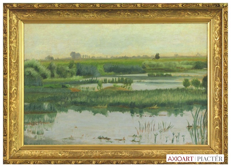 [FKA355/Bp4/36] A kép mérete: 47 x 70 cm keret nélkül. Készült: Olaj, Karton A kép Krivátsy Szűts György (Győr, 1892) alkotása. Jelezve balra lent "Krivátsy Szűts György Szolnok 1912" A festmény jó állapotban van. Keret: Ép A festmény hátoldalán autográf írással: Szűcs Gyuri "Mocsaras táj" (48-69) Szolnok 1912 - 1918-ban eladva 1200 K-ért Magyar festők és grafikusok életrajzi lexikona I-II. Festő. A fővárosi Képzőművészeti Főiskolán szerzett oklevelet, majd Fényes Adolf mellett tanult a szolnoki művésztelepen. Új hangot jelentő, finom hangulatú, dekoratív női akt-képével tűnt fel (Fehér börtön, 1920). Ettől kezdve főleg aktokkal szerepelt különböző tárlatokon. 1924-1940 között magánfestőiskolát tartott fenn. 1940-1944 között a Műbarát kiállításainak szervezője és irányítója volt. Az ő műve a fővárosi városmajori plébániatemplom Ave Maria oltárképe. 1920-ban a Horváth Károly-díjat, 1922-ben pedig a főváros jubileumi díját nyerte el. Több műve a Magyar Nemzeti Galériában található (Női Akt, Ablaknál, Tiszapart). (ML, Éber) Magyar festők és grafikusok életrajzi lexikona I-II. Műgyűjtők és kereskedők kézikönyve Festő. A fővárosi Képzőművészeti Főiskolán, ezt követően Fényes Adolf mellett a szolnoki művésztelepen végezte tanulmányait. Új hangot jelentő, finom hangulatú, dekoratív női aktjával tűnt fel (Fehér börtön-1920). Ettől kezdve főleg aktokkal szerepelt a tárlatokon. 1924-1940 k. magánfestőiskolát tartott fenn. 1940-1944 k. a Műbarát kiállításainak szervezője és irányítója volt. Az ő műve a bp.-i városmajori plébániatemplom Ave Maria oltárképe. 1920-ban Horváth Károly-díjat, 1922-ben a főváros jubileumi díját nyerte el. Több műve a MNG-ban található (ML, Éber) Magyar festők és grafikusok adattára Krivátsy-Szücs György (Győr, 1892 - ) Tanulmányait a Képzőművészeti Főiskolán, majd Fényes Adolf vezetése alatt a szolnoki művésztelepen végezte. Föltűnést keltett 1920-ban Fehér börtön c. finom női aktjával és utána is főleg aktokat állított ki. Művei közül megemlítendő a bp-városmajori plébánia-templom Ave Mária oltárképe. 1920-ban Horváth Károly-díjat, 1922-ben a főváros jubileumi díját nyerte el. – MTA – ML Művészeti lexikon I-IV. Krivátsy-Szücs György (Győr, 1892. márc. 20. - ): festő. Krivátsy-Szücs Miklós testvére. A Képzőművészeti Főiskolán, majd Fényes Adolf vezetése alatt a szolnoki művésztelepen tanult. Új hangot jelentő, finom hangulatú, dekoratív kompozíciójával tűnt fel (Fehér börtön, 1920). 1924-től 1940-ig magánfestőiskolát tartott fenn (városmajori művésztelep). 1940-től 1944-ig a Műbarát kiállításainak szervezője és irányítója volt. Női akt, Ablaknál, Tiszapart c. képei a Nemz. Gal.-ban találhatók Művészeti lexikon I-II. Krivátsy-Szücs György, festő, szül. Győr 1892. márc. 20. A Képzőművészeti Főiskolán, majd Fényes Adolf vezetése alatt a szolnoki művésztelepen tanult. Feltűnést keltett 1920-ban Fehér börtön című finom női aktjával és azóta is főleg aktokat állított ki. Saját festőiskolájának vezetője.