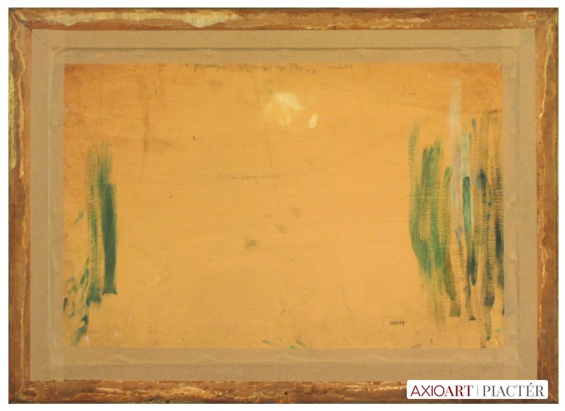 [1Y029/Z018] Olaj farost festmény, üveglap mögött, hibátlan képcsarnokos keretben. Hátoldalán Képcsarnok Vállalat papír címkéje: A művész neve: SCHÉNER MIHÁLY A kép címe: TÁJ Magasság: 66.5 cm Szélesség: 86 cm Súly: 6.54 kg Schéner Mihály festő, grafikus, szobrász, keramikus, bábtervező Medgyesegyháza, 1923-01-9 Elhalálozott: Budapest, 2009. május 11. Honlap: http://www.kormendigaleria.hu/kiadvany.html 1942-1947: Magyar Képzőművészeti Főiskola, tanára: Rudnay Gyula. 1978: Munkácsy-díj; 1984: érdemes művész; 1989: kiváló művész; 1995: Kossuth-díj. 1992-től a Magyar Művészeti Akadémia, 1993-tól a Széchenyi Irodalmi és Művészeti Akadémia tagja. 1956-ig tanított. 1982: Nagyatádi Faszobrász Alkotótelep, 1985: Nemzetközi Acélszobrász Alkotótelep, Dunaújváros. A stílusában felismerhető, mégis sokféle műtárgyat létrehozó ~ gazdag, állandóan alakuló életműve a folyton változó világban helyét kereső, az alkotói szabadságot megvalósító XX. századi képzőművész példázata lehetne. Magát expresszív-szürrealista alkotónak nevezi. Egyaránt dolgozik festékkel, textillel, fával, fémmel. Rajzol, szerkeszt, farag, épít, gyúr, varr és ragaszt, felhasználja a mézesbábok öntőformáit. Festő, rajzoló, textilszobor- és bábkészítő, fazekas, asztalos, esztergályos. Háromlépcsős folyamatban gondolkozik: rajzban tervez, majd fest, szobrot készít, “formába önt”, mindig a végső plasztikai megoldást keresi. Ami állandó és mégis játékosan változékony megjelenésű Schéner művészetében, az a gyermekkori emlékek által meghatározott népi mesterségek iránti tiszteletet kifejező motívumkincs, a tárgyi folklór formakészlete, amely már-már kézjegyként ismétlődik munkáin. Mitologikussá nőtt képzelete új lényeket teremt, pl: a Pigulát, amely disznótestű, emberfejű teremtmény. Schéner festményein a szürrealista motívumokat konstruktív szerkezetbe rendezi, a geometriát és az organikus természeti motívumokat egyaránt beépíti műveibe. A népi, népművészeti formakincsből merített lovas huszárok, betyárok, szegénylegények cifra szűr mentéje, piros csákója, fekete csizmája, az önálló életet élő zsinórdíszek és mézeskalács bábok, a kiskocsik a gyermekkori vásárok, búcsúk színes forgatagába vezet. A primér motívumokat aztán felváltják a vastagon felhordott felületbe karcolt jelek, vonalhálózatok, amelyek a játszó gyermek homokba rajzolt ábráit, a pásztorember fába vésett üzeneteit, az ősember barlang falába rótt mágikus jeleneteit idézik meg. A művész pillanatnyi érdeklődésének megfelelően a színek búvópatakként tűnnek el és jelennek meg ismét. A 60-as években leginkább a formákkal való játék érdekelte, a festmények felülete egyre gazdagodott: a táblaképek felületén applikációk jelentek meg, vagy lemállasztott rétegek hagyták maguk után hiányukat, motívumok nélküli ősformák, archetipikus képzetek bukkantak fel művészetében. A véletlenszerűnek látszó rétegekkel való játék azonban tudatos komponálás eredménye, amely később nyilvánvaló ritmusnak és formai szerkesztettségnek adja át a helyét, mint a Törvénytáblák c. sorozaton. A különböző művészi kifejezési formák egymásra termékenyítő hatással vannak, át- meg áthatják egymást. Textilszobrai, amelyekkel új műfajt teremtett, ugyanazzal az automatikus, expresszív-szürrealista módszerrel készülnek, mint festményei. A hagyományosan a népművészetben alkalmazott anyag, a filc lehetőséget ad a népi formakincs felelevenítésére, amely azonban a művész különös szürrealista átiratában jelenik meg. A szívekkel kivarrt, zsinórdíszes Posztókotlós c. művén mézesbábok lógnak, hátán huszárok lovagolnak. Egész sor textilből készült kéz-plasztikát alkot, amelyeket az ujjakra rávarrt díszekkel öltöztet, személyesít meg. A színes-különös világból aztán ~ újra puritán képi és formai rendbe juttatja el a nézőt, majd nemsokára tépett, gyűrt, vágott, csorgatott, repedezni hagyott szenvedélyesen vonagló képi felületeket hagy hátra. Schéner készített apró gyermekjátékokat, térstruktúra-tereket, mászókákat is. A magyar népi formák mellett szürreális játékaiban gyakran alkalmaz görög mitológiai alakokat, “elkentaurosodott” lovakat, Gorgó-fejeket, sellőket, hárpiákat, Pán-ábrázolásokat. Schéner nemcsak saját művészetéről publikál, hanem művésztársairól is számos írása jelenik meg, elsősorban az Új Auróra c. folyóiratban, amelynek egy ideig főmunkatársa volt. Irodalom kiállítása, Magyar Építőművészet, 1962/4. Húsz év után, Művészet, 1965/4. BOZÓKY M.: ~, Tiszatáj, 1968/5. PERNECZKY G.: Nincs uborkaszezon, Élet és Irodalom, 1969. augusztus 8. BARÁNSZKY-JÓB L.: ~, Művészet, 1969/9. LÁSZLÓ GY.: ~ kaposvári kiállítása, Jelenkor, 1969/4. MAJOR M.: Pásztorok, betyárok, huszárok - kezek, Tükör, 1970. szeptember 15. FRANK J.: Bemutatjuk ~t, Élet és Irodalom, 1972. május 6. ról kiállítása ürügyén, Képzőművészeti Almanach, Budapest, 1972 Sötétkék kokasok, Élet és Irodalom, 1973. szeptember 9. MAJOR M.: ~ játékai, Élet és Irodalom, 1974. július 27. BARTA J.: Egy különös művész, Alföld, 1974/6. VADAS J.: Szárnykészítők, Élet és Irodalom, 1975. október 4. JUHÁSZ F.: A halál ellen játszani, Élet és Irodalom, 1975. május 17. PAP G.: Kincsek és műkincsek, Művészet, 1975/6. P. SZŰCS J.: Az utak kettéválnak, Művészet, 1978/3. Békési művészet, Művészet, 1978/7. SZAMOSI F.: ~ [kismonográfia], Budapest, 1978 VADAS J.: Játék a játékkal, Élet és Irodalom, 1979. augusztus 18. NÉMETH L.: ~ műveiről, Művészet, 1979/4. MIKLÓS P.: Mit akar ez a múzeum?, Művésze
