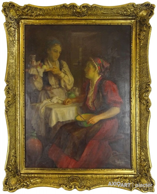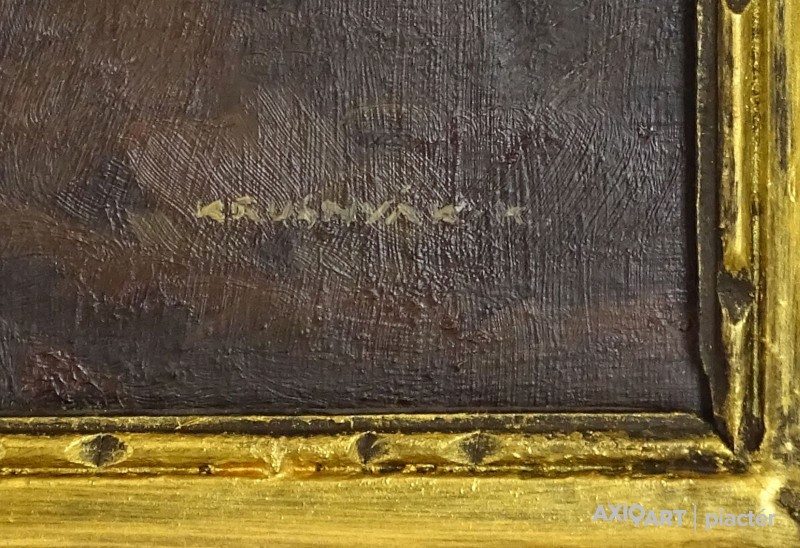 [0Q254/W011] Olaj vászon festmény, hibátlan aranyozott Blondel keretben. Azonnal falra akasztható, ajándékozható állapotban van. Jelezve jobbra lent: KRUSNYÁK K. Magasság: 98 cm Szélesség: 78 cm Súly: 4.2 kg KRUSNYÁK KÁROLY KÖRÖS, 1889 - 1960, BUDAPEST Festő. A budapesti Iparművészeti Iskola díszítő-festő szakán tanult 1907-1912 között. Mesterei: Simay Imre, Újváry Ignác, Udvary Géza, Körösfői Kriesch Aladár. A Nemzeti Szalon alapító tagja, a Benczúr Társaság elnöke. Főként hazai egyéni és csoportos kiállításokon mutatta be munkáit. Rendszeresen kiállított a Nemzeti Szalon tárlatain 1916-1957 között. Díjak: Harkányi-díj (1916), Balló-díj (1916), Röck Szilárd-díj (1920), állami díj (1921), Képzőművész Aranyérem, Budapest díja (1941). Hazai közgyűjteményben a Magyar Nemzeti Galériában találhatók alkotásai. Forrás: Kieselbach