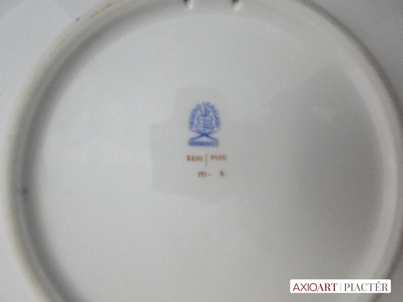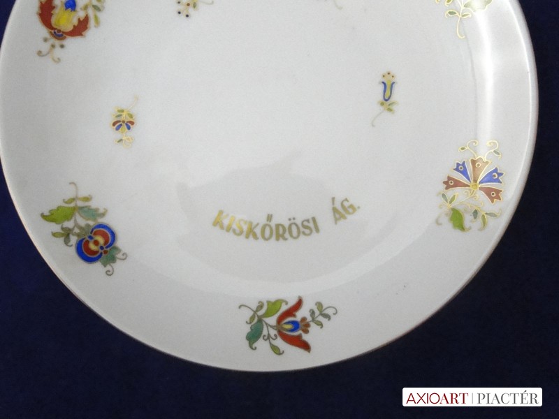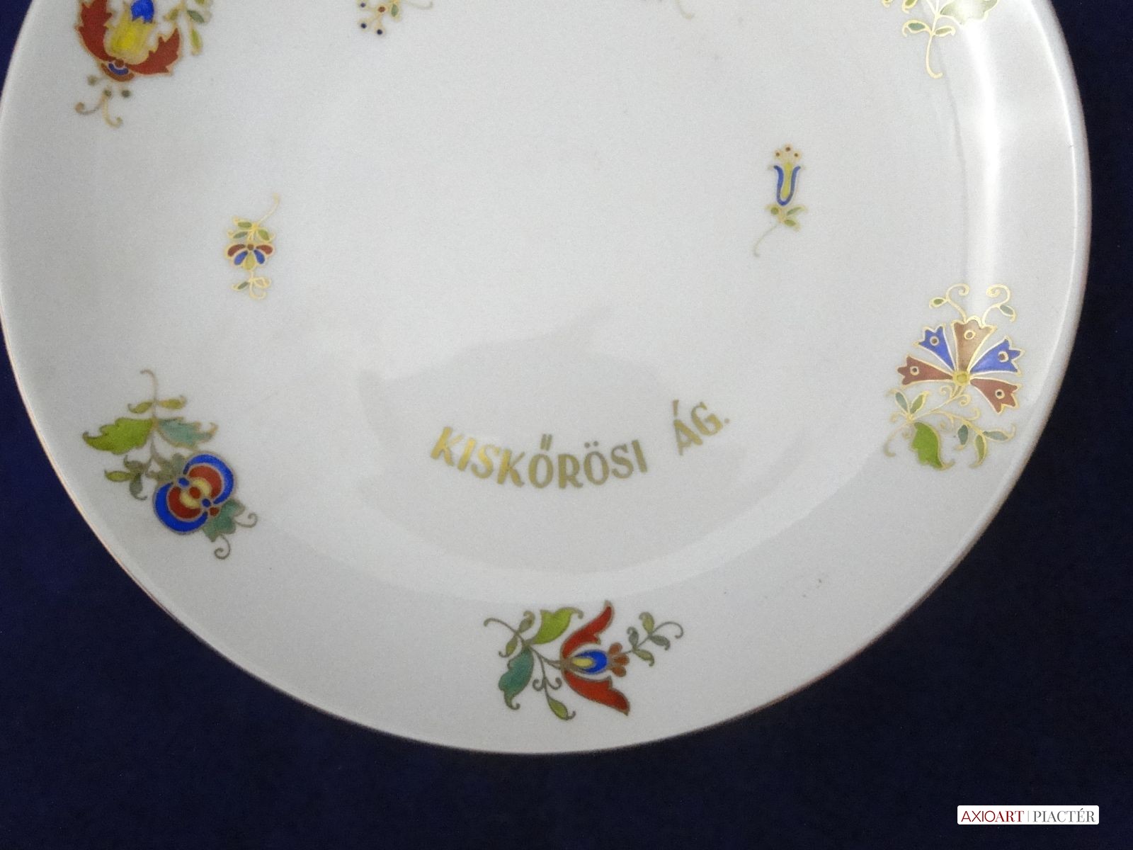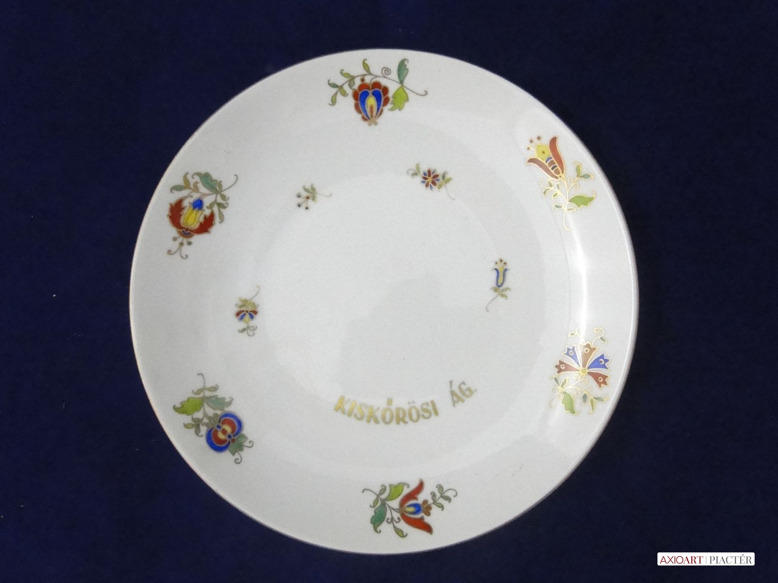 [8632/X044] Hibátlan állapotú ritka különleges kézi festésű motívumokkal díszített feliratos herendi porcelán fali dísztányér, hátoldalán falra akasztási lehetőséggel. A tányéron felirat: KISKŐRÖSI ÁG. Alján kék herendi márkajelzés: HEREND HUNGARY HAND PAINTED 2510/MHO 191-B Szélesség: 20 cm Súly: 0.295 kg