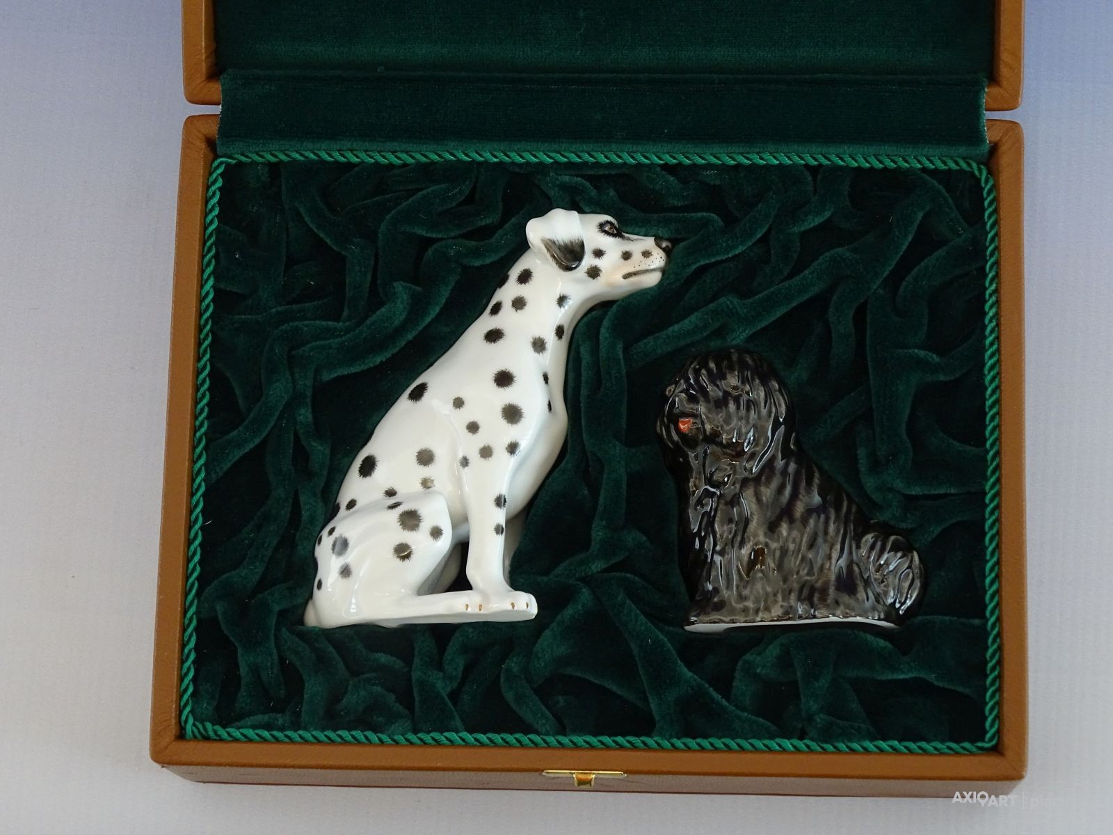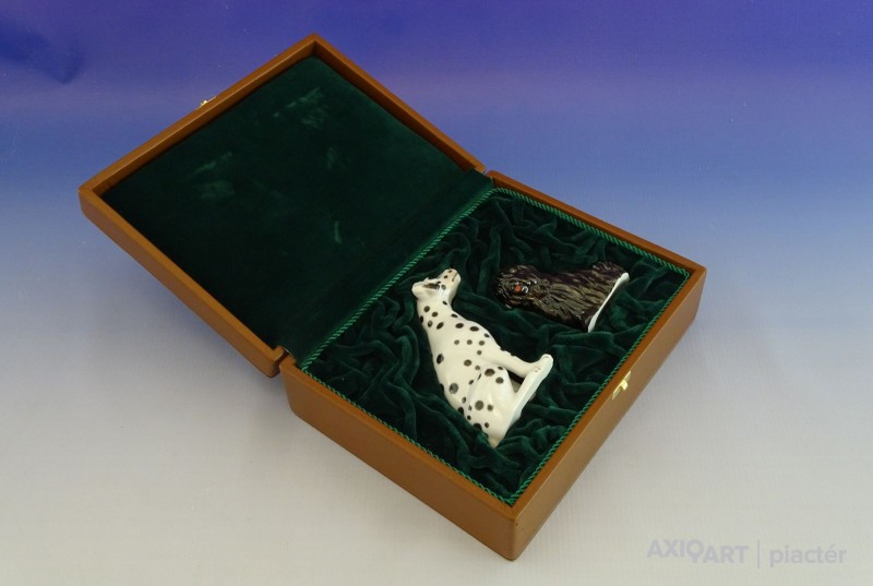 Ritka, egyedi megrendelésre készített erre a két kutyára készített bőrrel bevont díszdobozban található Herendi porcelán kutya pár. Ebben a formában, összeállításban teljesen egyedi, egyszeri.