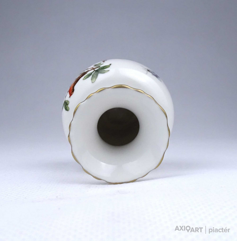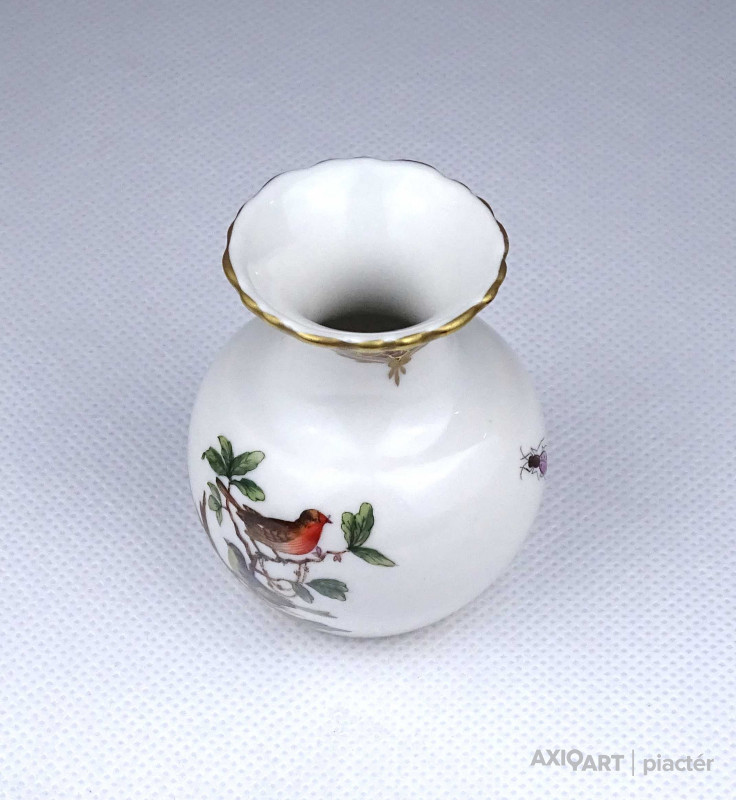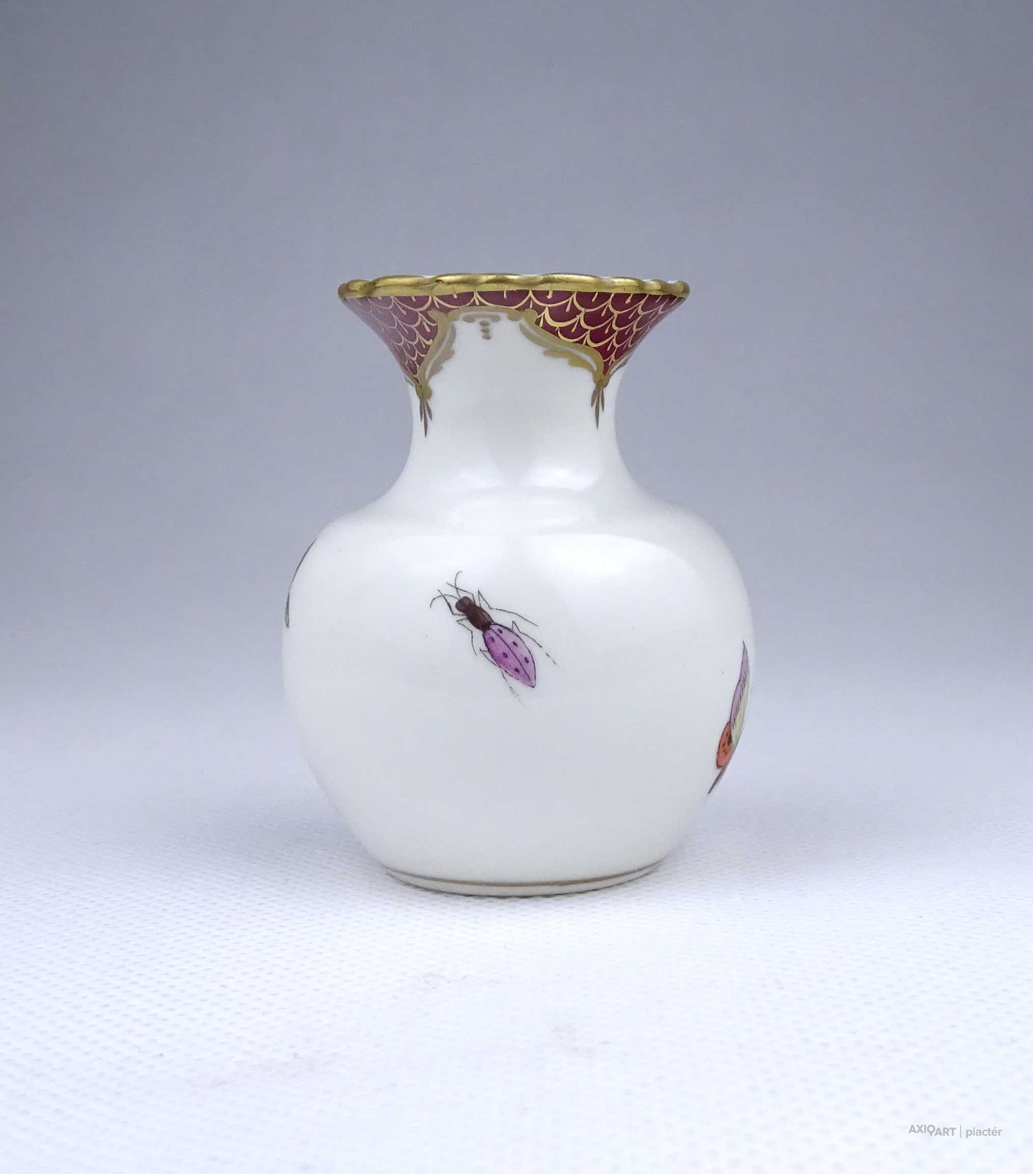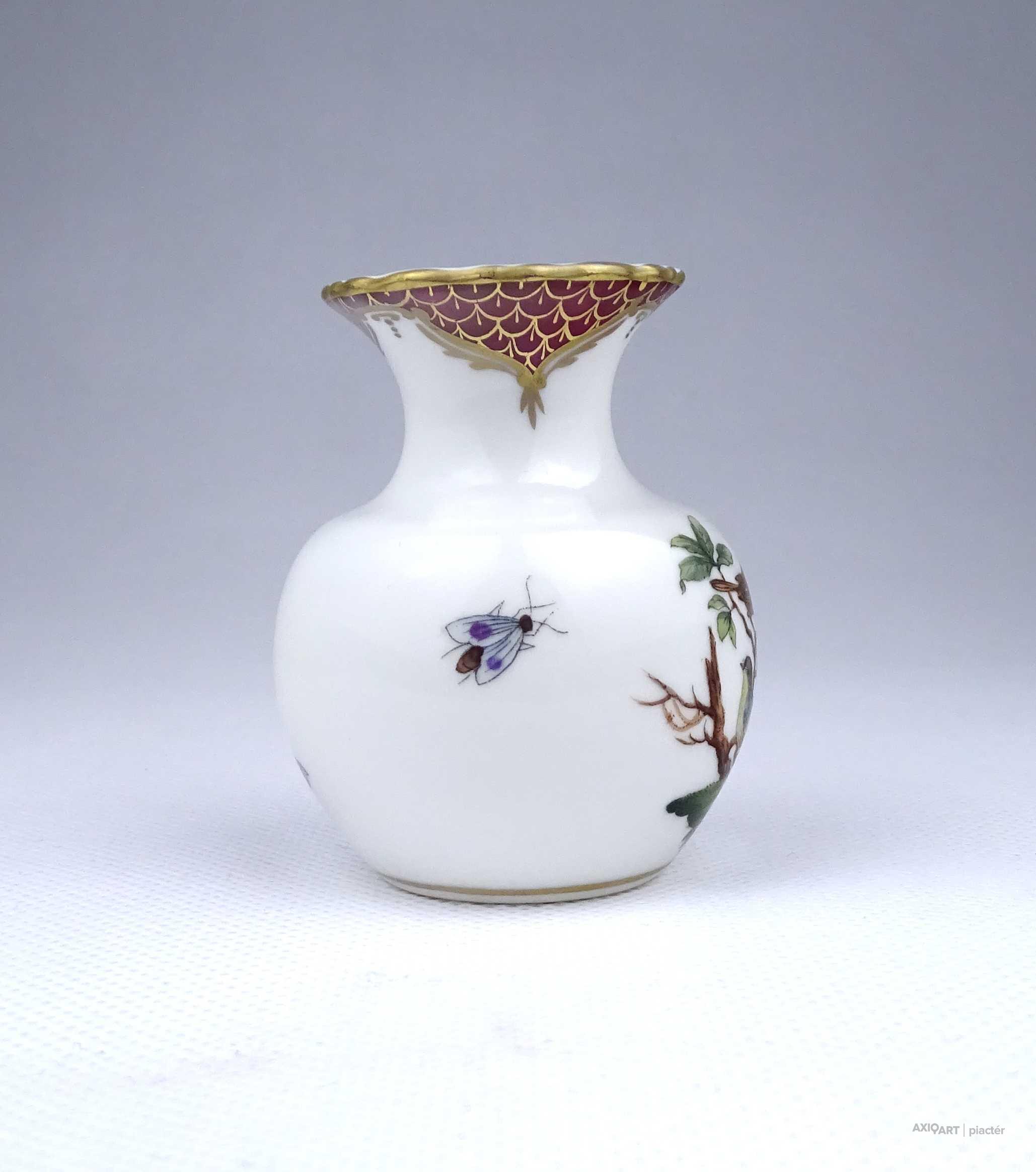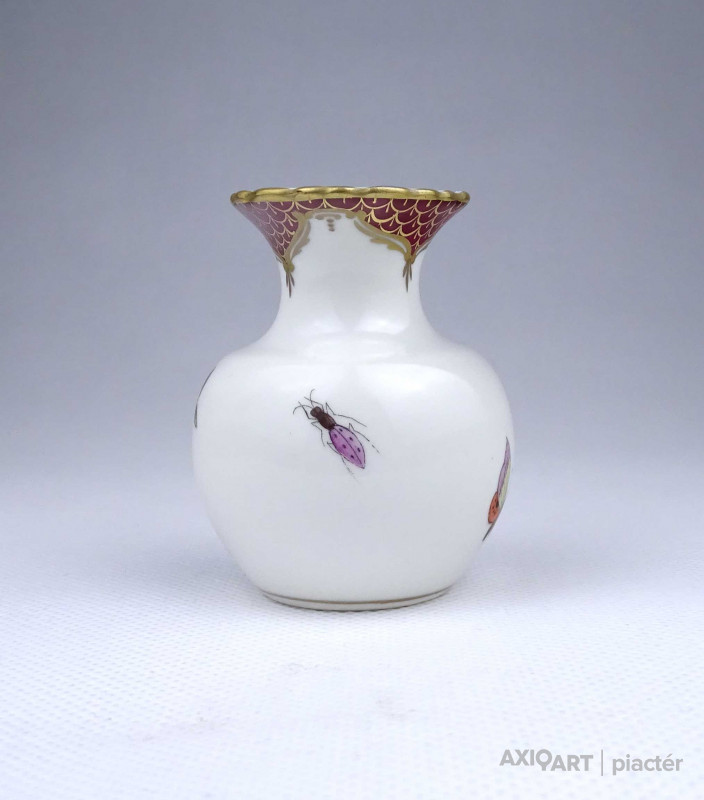 Régi, hibátlan állapotú, kisméretű Rothschild mintás Herendi porcelán ibolyaváza, kisváza. Rajta madár, rovar, bogár és lepke díszítés látható.