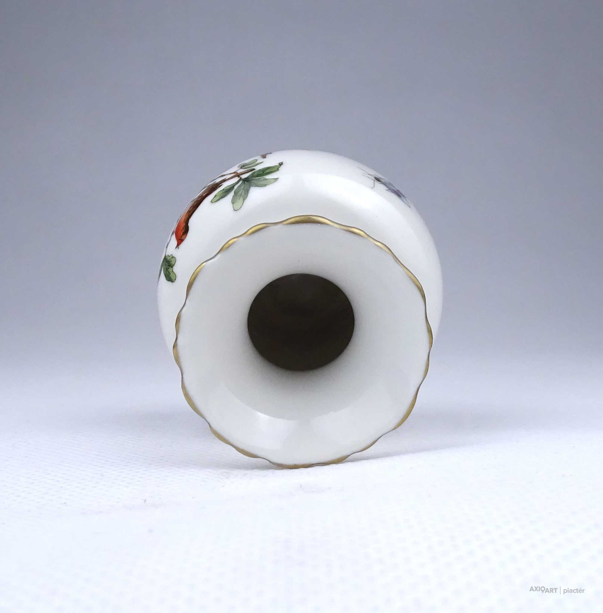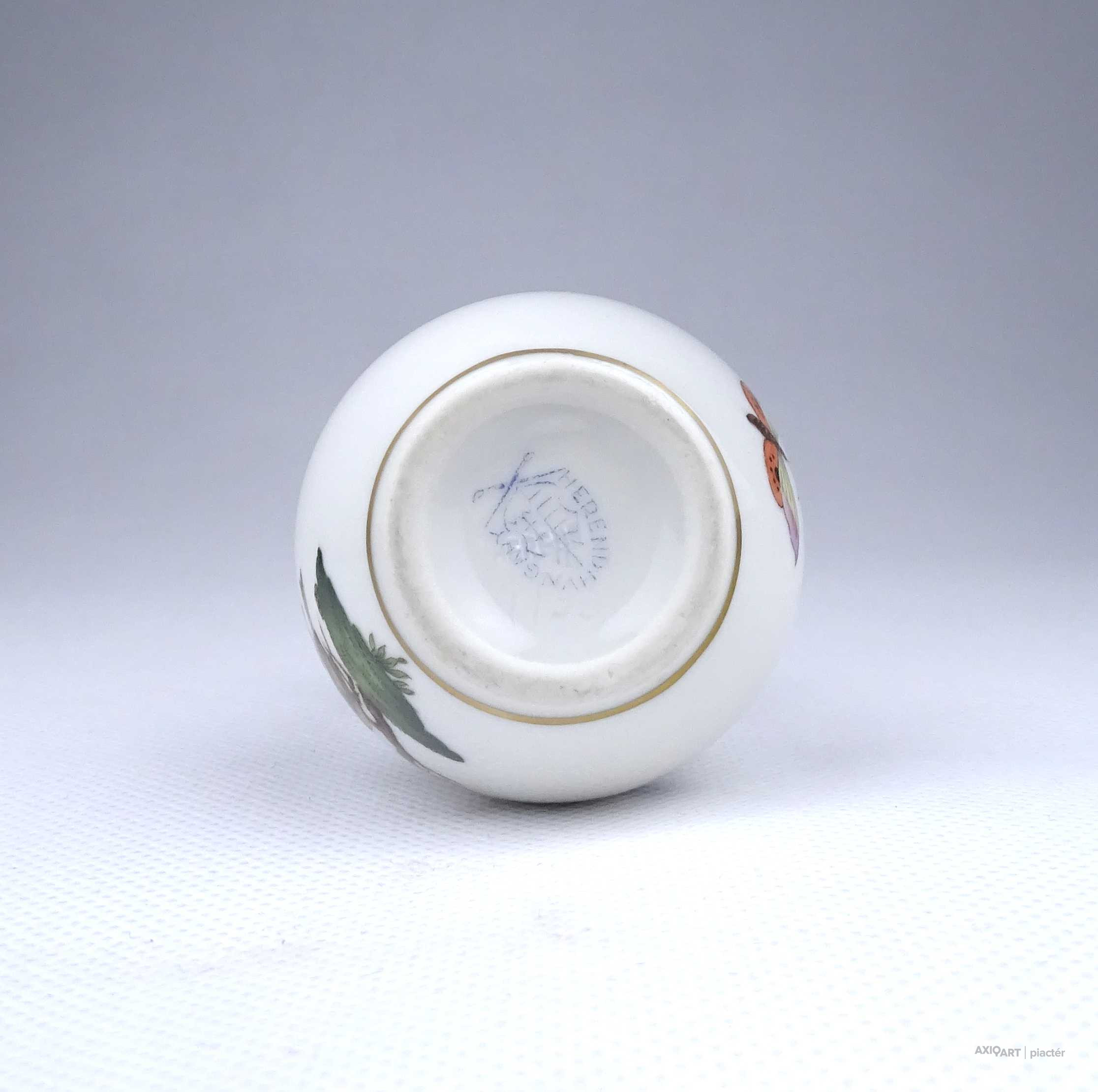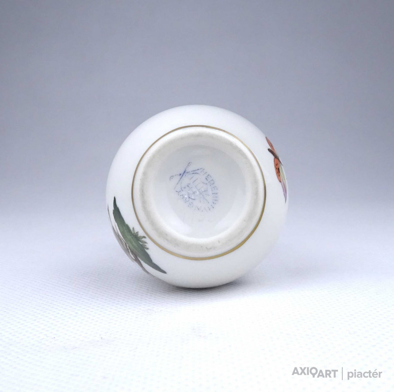 [1Z992/Z009] Régi, hibátlan állapotú, kisméretű Rothschild mintás Herendi porcelán ibolyaváza, kisváza. Rajta madár, rovar, bogár és lepke díszítés látható. Alján kék Herendi jelzés: HEREND HUNGARY Mélynyomással: HEREND Karcolt formaszám: 7193 Magasság: 6.6 cm Szélesség: 5.4 cm Súly: 0.06 kg