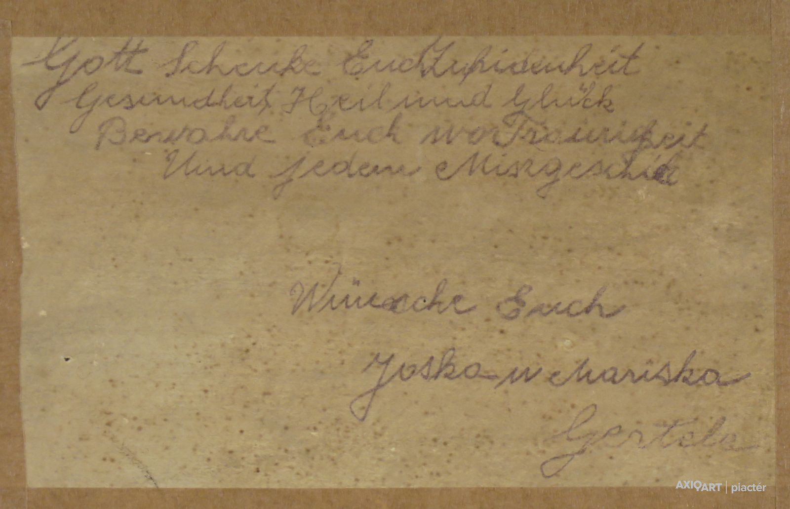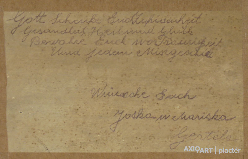 A festmény hátoldalán a művész szárazbélyegzője és ajánlása látható.
