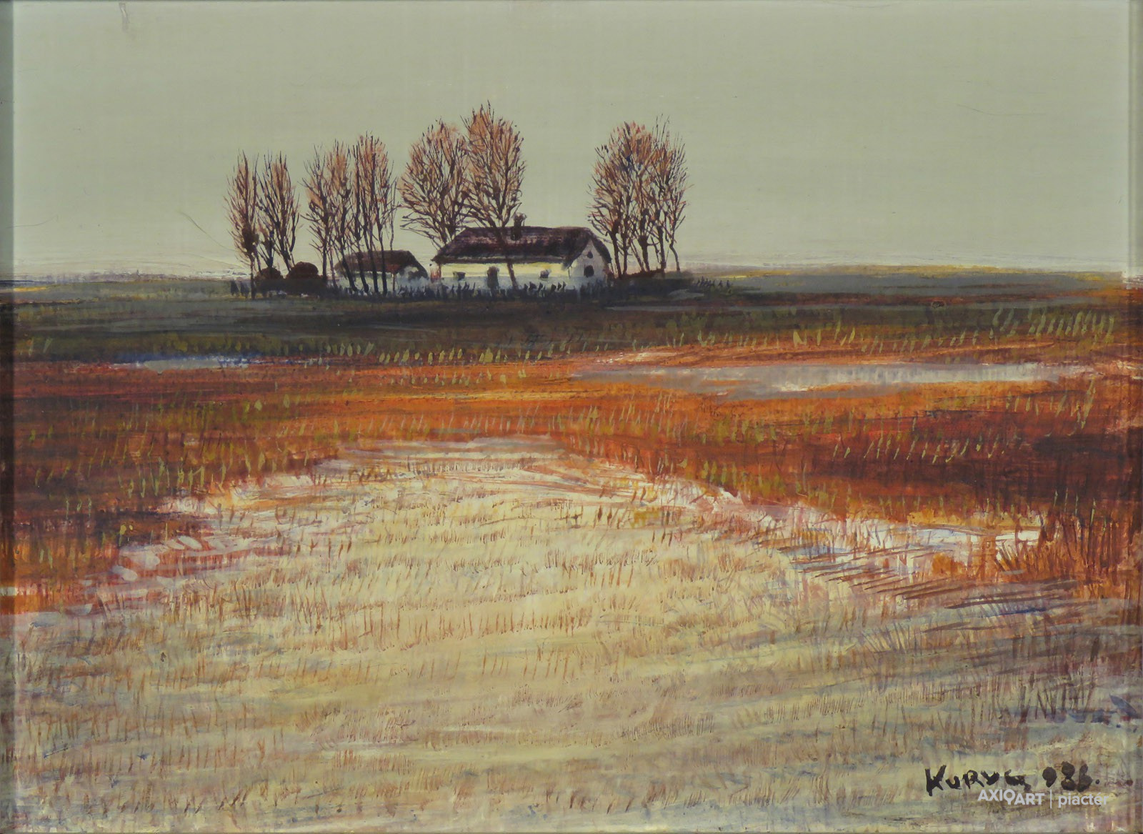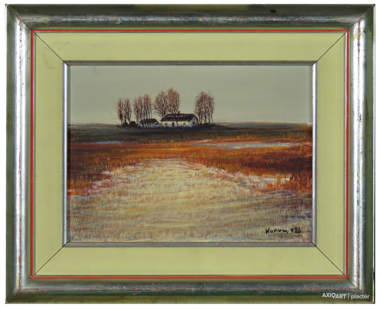[FKB499/Z020] A kép mérete: 20 x 27 cm keret nélkül. Készült: Olaj, Farostlemez A kép Kurucz D. István (Hódmezővásárhely, 1914, Budapest, 1996) alkotása. Jelezve jobbra lent "Kurucz 986" A festmény jó állapotban van. Keret: Ép Magyar festők és grafikusok életrajzi lexikona I-II. Festő, grafikus. Vásárhelyről, ahol Darvasy István festőművész figyelt fel tehetségére, került Szőnyi István magániskolájába. A fővárosi Képzőművészeti Főiskolának, ahol Rudnay Gyula, Réti István, Benkhard Ágost, Szőnyi István voltak a tanítómesterei 1940-ig volt a tanítványa. A monumentális festészetet Nagy Sándor tanította. Tanulmányúton járt több kelet- és nyugat-európai államban, Mongóliában, Japánban, Algériában. 1940-ben Hódmezővásárhelyen telepedett le, 1943-1947 között bekapcsolódott szülővárosa művészeti és közéletébe. A Vásárhely Népe c. lap munkatársa volt. 1949-59 között Szőnyi tanársegédjeként freskótechnikát tanított a főiskolán. 1951-52-ben megszervezte a Honvédségi Képzőművészeti Stúdiót, majd kinevezték a Honvéd Képzőművészeti Iskola igazgatójának. A vásárhelyi iskola reprezentáns egyéniségeként jelentős szerepe volt a Vásárhelyi Őszi Tárlatok elindításában. Megszervezete és vezette a Mednyánszky Társaságot, s haláláig művészeti vezetője volt a Hajdúböszörményi Nemzetközi Művésztelepnek. Évekig elnöke volt a Hortobágyi Alkotótábornak. Az alföldi parasztok életét megörökítő képei a falképek összefoglaló stílusában a népi realizmus és a dekoratív sommázás szellemében készültek. Számos falképet festett (Kossuth Akadémia, hódmezővásárhelyi iskola, stb.). 1941-től számos kisebb-nagyobb egyéni kiállítása volt, bemutatkozott több hazai és külhoni városban. 1941-től minden jelentősebb országos rendezvény és a magyar művészek külföldi bemutatóinak résztvevője. Rendszeresen szerepelt a Vásárhelyi Őszi Tárlatokon, a Hatvani Tájkép és Portrébiennálékon, a Szegedi Nyári Tárlatokon. Képei bemutatásra kerültek a vásárhelyi iskola jubileumi rendezvényein. 1962-ben több alkotásával szerepelt a Velencei Biennálén. Díjak: SZOT-díj, Munkácsy-díj, Érdemes és Kiváló Művész kitüntetés, Tornyai-plakett, római ösztöndíj, a Munka Érdemrend arany fokozata, Káplár Miklós-díj és emlékplakett, Kossuth-díj. Művei megtalálhatók minden jelentősebb hazai, több olasz és japán közgyűjteményben. (ML, D.J.: Műv. 1985/5, Tasnádi Attila adatközlése nyomán, L.L.: Műv. 1983/3) Magyar festők és grafikusok életrajzi lexikona I-II. Műgyűjtők és kereskedők kézikönyve Festő, grafikus. Vásárhelyről, ahol Darvasy István festőművész figyelt fel tehetségére, került Szőnyi István magániskolájába. A fővárosi Képzőművészeti Főiskolának, ahol Rudnay Gyula, Réti István, Benkhard Ágost, Szőnyi István voltak a tanítómesterei 1941-ig volt a növendéke. A monumentális festészetet Nagy Sándor tanította. Egy ideig tanársegédként működött Szőnyi mellett. Több ízben járt Itáliában tanulmányúton. Évekig művészeti vezetője volt a Hajdúböszörményi Nemzetközi Művésztelepnek. Az alföldi parasztok életét megörökítő képei a falképek összefoglaló stílusában a népi realizmus és a dekoratív sommázás szellemében készülnek. A II. világháború alatt szerepet vállalt a Szocialista Képzőművészek Csoportjának akcióiban. 1949-1960 k. a Képzőművészeti Főiskola falképtanszékének tanára volt. Több falképet festett (Kossuth Akadémia, hódmezővásárhelyi iskola, stb.). 1962-ben több alkotásával szerepelt a Velencei Biennálén, SZOT-díjas, Munkácsy-díjas, érdemes és kiváló művész kitüntető elismerésében részesült. (ML, D.J.: Műv.-1985/5, L.L: Műv.-1983/3) Magyar festők és grafikusok adattára Tanulmányait a Képzőművészeti Főiskolán végezte, ahol Rudnay Gyula és Réti István voltak a mesterei. 1941-1943-ban ösztöndíjas Rómában. 1943-1947 között Hódmezővásárhelyen dolgozik, egyidejűleg a Vásárhelyi Hétfő c. hetilap szerkesztője. 1949-1960 közötti években a budapesti Képzőművészeti Főiskola freskó tanszékének tanára. Az 1940-es évek eleje óta kiállító művész. 1962-ben a Velencei Biennálén állították ki műveit. 1970-ben Csók István Galériában volt kiállítása. A Vásárhelyi Őszi Tárlatok és a Szegedi Nyári Tárlatok rendszeres kiállító művésze. Az alföldi festészet egyéni hangú továbbfejlesztője. Táblaképeket, freskókat és kerámia falképeket alkot. Munkácsy-díjas, érdemes és kiváló művész kitüntető elismerésében részesült. A SZOT a legelső képzőművészek közt, 1962-ben tüntette ki díjával. A 70. születésnapját ünneplő művész 1984 decemberében életmű kiállítást rendezett műveiből a hódmezővásárhelyi Tornyai János Múzeumban. 1986-ban a budapesti Hollósy Galériában nyílt kiállítása. - Irod.: Szij Rezső: Kurucz Dezső István festőművész. Bp. 1967.; Kulcsár Ödön: SZOT-díjasok. Bp., 1981.; Lóska Lajos: Mindig freskót szerettem volna festeni. Beszélgetés Kurucz Dezső Istvánnal. Művészet, 1984. 3. Művészeti lexikon I-IV. Festő, Munkácsy-díjas. A Képzőművészeti Főiskolán Rudnay Gyula, Réti István, Benkhard Ágost, Szőnyi István növendéke volt 1934-40 között. Több ízben járt külföldi tanulmányúton. Az alföldi parasztok életét megörökítő képei a falképek összefoglaló stílusában a népi realizmus és a dekoratív sommázás szellemében készülnek. 1949-60 között a Képzőművészeti Főiskola falképtanszékének tanára volt. Több falképet festett (Kossuth Akadémia; Hódmezővásárhely, iskola, pápai pártház, 1965). Legutóbb 1959-ben volt gyűjt. kiállítása. 1962-ben több művével szerepelt a Velencei B