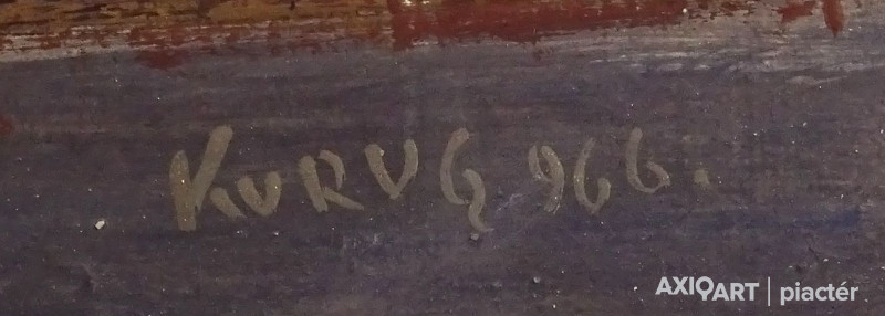 [FK3264/FL-4] A kép mérete: 31,5 x 70,5 cm keret nélkül. Készült: Olaj, tempera, Farostlemez A kép Kurucz D. István (Hódmezővásárhely, 1914, Budapest, 1996) alkotása. Jelezve Jobbra lent "Kurucz 977" A festmény jó állapotban van. Keret: Ép A festmény hátoldalán a Képcsarnokvállalat raglapja látható. Magyar festők és grafikusok életrajzi lexikona I-II. Festő, grafikus. Vásárhelyről, ahol Darvasy István festőművész figyelt fel tehetségére, került Szőnyi István magániskolájába. A fővárosi Képzőművészeti Főiskolának, ahol Rudnay Gyula, Réti István, Benkhard Ágost, Szőnyi István voltak a tanítómesterei 1940-ig volt a tanítványa. A monumentális festészetet Nagy Sándor tanította. Tanulmányúton járt több kelet- és nyugat-európai államban, Mongóliában, Japánban, Algériában. 1940-ben Hódmezővásárhelyen telepedett le, 1943-1947 között bekapcsolódott szülővárosa művészeti és közéletébe. A Vásárhely Népe c. lap munkatársa volt. 1949-59 között Szőnyi tanársegédjeként freskótechnikát tanított a főiskolán. 1951-52-ben megszervezte a Honvédségi Képzőművészeti Stúdiót, majd kinevezték a Honvéd Képzőművészeti Iskola igazgatójának. A vásárhelyi iskola reprezentáns egyéniségeként jelentős szerepe volt a Vásárhelyi Őszi Tárlatok elindításában. Megszervezete és vezette a Mednyánszky Társaságot, s haláláig művészeti vezetője volt a Hajdúböszörményi Nemzetközi Művésztelepnek. Évekig elnöke volt a Hortobágyi Alkotótábornak. Az alföldi parasztok életét megörökítő képei a falképek összefoglaló stílusában a népi realizmus és a dekoratív sommázás szellemében készültek. Számos falképet festett (Kossuth Akadémia, hódmezővásárhelyi iskola, stb.). 1941-től számos kisebb-nagyobb egyéni kiállítása volt, bemutatkozott több hazai és külhoni városban. 1941-től minden jelentősebb országos rendezvény és a magyar művészek külföldi bemutatóinak résztvevője. Rendszeresen szerepelt a Vásárhelyi Őszi Tárlatokon, a Hatvani Tájkép és Portrébiennálékon, a Szegedi Nyári Tárlatokon. Képei bemutatásra kerültek a vásárhelyi iskola jubileumi rendezvényein. 1962-ben több alkotásával szerepelt a Velencei Biennálén. Díjak: SZOT-díj, Munkácsy-díj, Érdemes és Kiváló Művész kitüntetés, Tornyai-plakett, római ösztöndíj, a Munka Érdemrend arany fokozata, Káplár Miklós-díj és emlékplakett, Kossuth-díj. Művei megtalálhatók minden jelentősebb hazai, több olasz és japán közgyűjteményben. (ML, D.J.: Műv. 1985/5, Tasnádi Attila adatközlése nyomán, L.L.: Műv. 1983/3) Magyar festők és grafikusok életrajzi lexikona I-II. Műgyűjtők és kereskedők kézikönyve Festő, grafikus. Vásárhelyről, ahol Darvasy István festőművész figyelt fel tehetségére, került Szőnyi István magániskolájába. A fővárosi Képzőművészeti Főiskolának, ahol Rudnay Gyula, Réti István, Benkhard Ágost, Szőnyi István voltak a tanítómesterei 1941-ig volt a növendéke. A monumentális festészetet Nagy Sándor tanította. Egy ideig tanársegédként működött Szőnyi mellett. Több ízben járt Itáliában tanulmányúton. Évekig művészeti vezetője volt a Hajdúböszörményi Nemzetközi Művésztelepnek. Az alföldi parasztok életét megörökítő képei a falképek összefoglaló stílusában a népi realizmus és a dekoratív sommázás szellemében készülnek. A II. világháború alatt szerepet vállalt a Szocialista Képzőművészek Csoportjának akcióiban. 1949-1960 k. a Képzőművészeti Főiskola falképtanszékének tanára volt. Több falképet festett (Kossuth Akadémia, hódmezővásárhelyi iskola, stb.). 1962-ben több alkotásával szerepelt a Velencei Biennálén, SZOT-díjas, Munkácsy-díjas, érdemes és kiváló művész kitüntető elismerésében részesült. (ML, D.J.: Műv.-1985/5, L.L: Műv.-1983/3) Magyar festők és grafikusok adattára Tanulmányait a Képzőművészeti Főiskolán végezte, ahol Rudnay Gyula és Réti István voltak a mesterei. 1941-1943-ban ösztöndíjas Rómában. 1943-1947 között Hódmezővásárhelyen dolgozik, egyidejűleg a Vásárhelyi Hétfő c. hetilap szerkesztője. 1949-1960 közötti években a budapesti Képzőművészeti Főiskola freskó tanszékének tanára. Az 1940-es évek eleje óta kiállító művész. 1962-ben a Velencei Biennálén állították ki műveit. 1970-ben Csók István Galériában volt kiállítása. A Vásárhelyi Őszi Tárlatok és a Szegedi Nyári Tárlatok rendszeres kiállító művésze. Az alföldi festészet egyéni hangú továbbfejlesztője. Táblaképeket, freskókat és kerámia falképeket alkot. Munkácsy-díjas, érdemes és kiváló művész kitüntető elismerésében részesült. A SZOT a legelső képzőművészek közt, 1962-ben tüntette ki díjával. A 70. születésnapját ünneplő művész 1984 decemberében életmű kiállítást rendezett műveiből a hódmezővásárhelyi Tornyai János Múzeumban. 1986-ban a budapesti Hollósy Galériában nyílt kiállítása. - Irod.: Szij Rezső: Kurucz Dezső István festőművész. Bp. 1967.; Kulcsár Ödön: SZOT-díjasok. Bp., 1981.; Lóska Lajos: Mindig freskót szerettem volna festeni. Beszélgetés Kurucz Dezső Istvánnal. Művészet, 1984. 3. Művészeti lexikon I-IV. Festő, Munkácsy-díjas. A Képzőművészeti Főiskolán Rudnay Gyula, Réti István, Benkhard Ágost, Szőnyi István növendéke volt 1934-40 között. Több ízben járt külföldi tanulmányúton. Az alföldi parasztok életét megörökítő képei a falképek összefoglaló stílusában a népi realizmus és a dekoratív sommázás szellemében készülnek. 1949-60 között a Képzőművészeti Főiskola falképtanszékének tanára volt. Több falképet festett (Kossuth Akadémia; Hódmezővásárhely, iskola, pápai pártház, 1965). Legutóbb 195