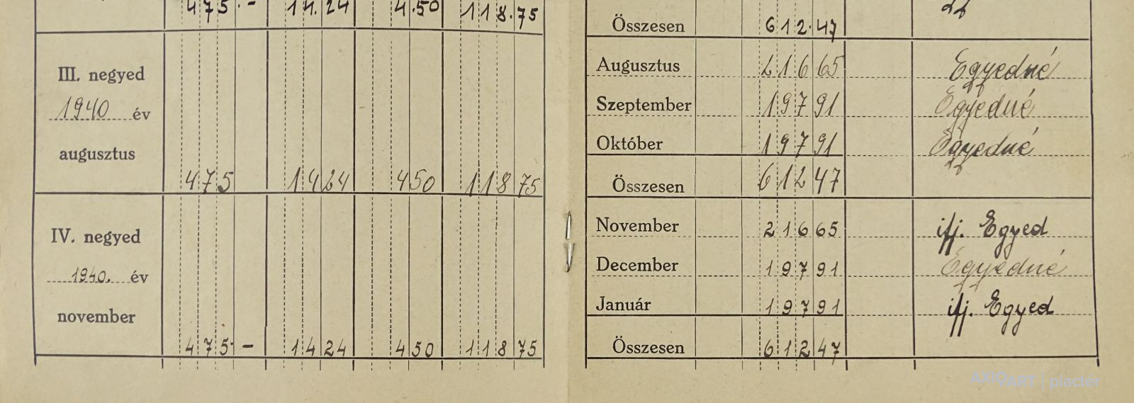Folytatólagosan vezetett régi lakbér könyv. Benne vezetve a házbér, házfelügyelő, lift és fűtés költségek befizetéseiről. Egyikben 1937 májustól 1943 novemberéig egy bérlővel, másik könyvben 1944 februártól 1950 augusztusáig másik bérlővel vezetve.